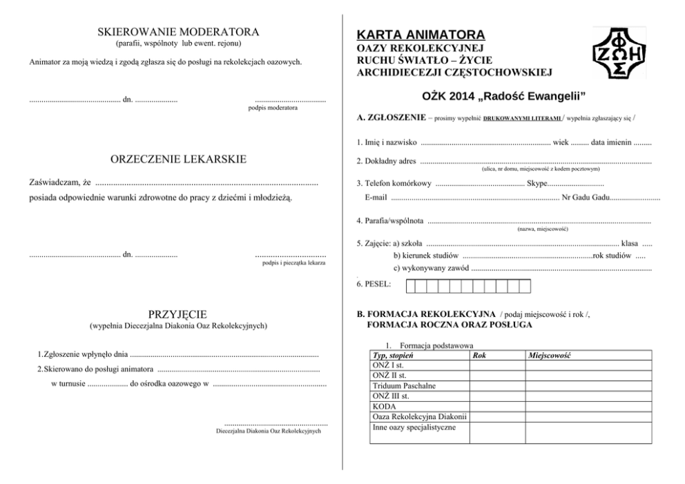 SKIEROWANIE MODERATORA KARTA ANIMATORA (parafii, wspólnoty lub ewent. rejonu) Animator za moją wiedzą i zgodą zgłasza się do posługi na rekolekcjach oazowych. ............................................. dn. ..................... OAZY REKOLEKCYJNEJ RUCHU ŚWIATŁO – ŻYCIE ARCHIDIECEZJI CZĘSTOCHOWSKIEJ OŻK 2014 „Radość Ewangelii” ................................... podpis moderatora A. ZGŁOSZENIE – prosimy wypełnić DRUKOWANYMI LITERAMI / wypełnia zgłaszający się / 1. Imię i nazwisko ................................................................ wiek ......... data imienin ......... ORZECZENIE LEKARSKIE 2. Dokładny adres .................................................................................................................. (ulica, nr domu, miejscowość z kodem pocztowym) Zaświadczam, że .................................................................................................... 3. Telefon komórkowy ............................................ Skype............................ posiada odpowiednie warunki zdrowotne do pracy z dziećmi i młodzieżą. E-mail ................................................................................... Nr Gadu Gadu......................... 4. Parafia/wspólnota .............................................................................................................. (nazwa, miejscowość) ............................................. dn. ..................... ................................ podpis i pieczątka lekarza 5. Zajęcie: a) szkoła ............................................................................................... klasa ..... b) kierunek studiów ................................................................rok studiów ..... c) wykonywany zawód ......................................................................................... . 6. PESEL: PRZYJĘCIE (wypełnia Diecezjalna Diakonia Oaz Rekolekcyjnych) 1.Zgłoszenie wpłynęło dnia ............................................................................................. 2.Skierowano do posługi animatora ................................................................................ w turnusie .................... do ośrodka oazowego w ........................................................ ................................................... Diecezjalna Diakonia Oaz Rekolekcyjnych B. FORMACJA REKOLEKCYJNA / podaj miejscowość i rok /, FORMACJA ROCZNA ORAZ POSŁUGA 1. Formacja podstawowa Typ, stopień Rok ONŻ I st. ONŻ II st. Triduum Paschalne ONŻ III st. KODA Oaza Rekolekcyjna Diakonii Inne oazy specjalistyczne Miejscowość 2. Moja diakonia w minionym roku : a) Posługa w parafii i na rekolekcjach wakacyjnych ....................................................... C. UKOŃCZONE KURSY, SZKOLENIA, WARSZTATY SPECJALISTYCZNE (rodzaj, jak długo, gdzie i kiedy) ............................................................................................................................................ ............................................................................................................................................ b) Diakonią w której trwam jest ........................................................................................ 1. Kurs Wychowawców Placówek Wypoczynku (numer zaświadczenia) …....................................................................................................................... 2. Inne kursy (np.: Kurs pedagogiki zabawy, Kurs psychologii, Warsztaty 3. W tym roku brałem(łam) udział w (ilu) ............ rejonowych Dniach Wspólnoty. umiejętności interpersonalnych, Kurs wodzirejów zabaw bezalkoholowych, 4. W tym roku jestem uczestnikiem grupy ............................................................................. Kurs animatora dobrej zabawy, kursy sanitarne, pierwszej pomocy). Podaj (jakiej) Moim animatorem jest ......................................................................................................... 5. Do Krucjaty Wyzwolenia Człowieka należę [zaznacz „x” poprawną odpowiedź]: Jako kandydat Jako członek czas trwania jakie: .................................................................................................................. ............................................................................................................................ ............................................................................................................................ ............................................................................................................................ ............................................................................................................................ od kiedy ............................................................................................................................ 6. Przyjmuję do wiadomości, że w czasie rekolekcji wakacyjnych nie ma odwiedzin grup oazowych. ............................................................................................................................ ............................................................................................................................ 7. Zgłaszam gotowość pełnienia posługi: a) animatora grupy (wraz ze swoją grupą parafialną / bez mojej grupy parafialnej), muzycznego, liturgicznego, gospodarczego [niepotrzebne skreślić]. D. UWAGI lub ŚWIADECTWO ANIMATORA (po przeżytych rekolekcjach) ......................................................................................................................................... b) typ, stopień ............. miejscowość .............................................. turnus ................. ......................................................................................................................................... c) mogę dodatkowo podjąć posługę w turnusie ..................