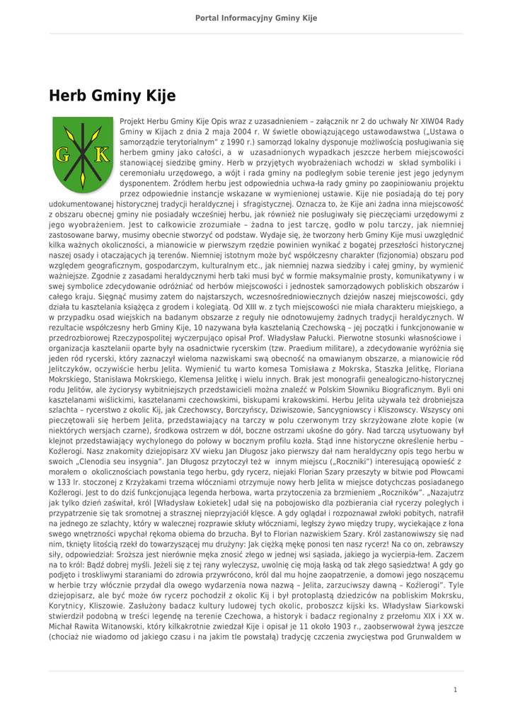 Portal Informacyjny Gminy Kije Herb Gminy Kije Projekt Herbu Gminy Kije Opis wraz z uzasadnieniem – załącznik nr 2 do uchwały Nr XIW04 Rady Gminy w Kijach z dnia 2 maja 2004 r. W świetle obowiązującego ustawodawstwa („Ustawa o samorządzie terytorialnym” z 1990 r.) samorząd lokalny dysponuje możliwością posługiwania się herbem gminy jako całości, a w uzasadnionych wypadkach jeszcze herbem miejscowości stanowiącej siedzibę gminy. Herb w przyjętych wyobrażeniach wchodzi w skład symboliki i ceremoniału urzędowego, a wójt i rada gminy na podległym sobie terenie jest jego jedynym dysponentem. Źródłem herbu jest odpowiednia uchwa-ła rady gminy po zaopiniowaniu projektu przez odpowiednie instancje wskazane w wymienionej ustawie. Kije nie posiadają do tej pory udokumentowanej historycznej tradycji heraldycznej i sfragistycznej. Oznacza to, że Kije ani żadna inna miejscowość z obszaru obecnej gminy nie posiadały wcześniej herbu, jak również nie posługiwały się pieczęciami urzędowymi z jego wyobrażeniem. Jest to całkowicie zrozumiałe – żadna to jest tarczę, godło w polu tarczy, jak niemniej zastosowane barwy, musimy obecnie stworzyć od podstaw. Wydaje się, że tworzony herb Gminy Kije musi uwzględnić kilka ważnych okoliczności, a mianowicie w pierwszym rzędzie powinien wynikać z bogatej przeszłości historycznej naszej osady i otaczających ją terenów. Niemniej istotnym może być współczesny charakter (fizjonomia) obszaru pod względem geograficznym, gospodarczym, kulturalnym etc., jak niemniej nazwa siedziby i całej gminy, by wymienić ważniejsze. Zgodnie z zasadami heraldycznymi herb taki musi być w formie maksymalnie prosty, komunikatywny i w swej symbolice zdecydowanie odróżniać od herbów miejscowości i jednostek samorządowych pobliskich obszarów i całego kraju. Sięgnąć musimy zatem do najstarszych, wczesnośredniowiecznych dziejów naszej miejscowości, gdy działa tu kasztelania książęca z grodem i kolegiatą. Od XIII w. z tych miejscowości nie miała charakteru miejskiego, a w przypadku osad wiejskich na badanym obszarze z reguły nie odnotowujemy żadnych tradycji heraldycznych. W rezultacie współczesny herb Gminy Kije, 10 nazywana była kasztelanią Czechowską – jej początki i funkcjonowanie w przedrozbiorowej Rzeczypospolitej wyczerpująco opisał Prof. Władysław Pałucki. Pierwotne stosunki własnościowe i organizacja kasztelanii oparte były na osadnictwie rycerskim (tzw. Praedium militare), a zdecydowanie wyróżnia się jeden ród rycerski, który zaznaczył wieloma nazwiskami swą obecność na omawianym obszarze, a mianowicie ród Jelitczyków, oczywiście herbu Jelita. Wymienić tu warto komesa Tomisława z Mokrska, Staszka Jelitkę, Floriana Mokrskiego, Stanisława Mokrskiego, Klemensa Jelitkę i wielu innych. Brak jest monografii genealogiczno-historycznej rodu Jelitów, ale życiorysy wybitniejszych przedstawicieli można znaleźć w Polskim Słowniku Biograficznym. Byli oni kasztelanami wiślickimi, kasztelanami czechowskimi, biskupami krakowskimi. Herbu Jelita używała też drobniejsza szlachta – rycerstwo z okolic Kij, jak Czechowscy, Borczyńscy, Dziwiszowie, Sancygniowscy i Kliszowscy. Wszyscy oni pieczętowali się herbem Jelita, przedstawiający na tarczy w polu czerwonym trzy skrzyżowane złote kopie (w niektórych wersjach czarne), środkowa ostrzem w dół, boczne ostrzami ukośne do góry. Nad tarczą usytuowany był klejnot przedstawiający wychylonego do połowy w bocznym profilu kozła. Stąd inne historyczne określenie herbu – Koźlerogi. Nasz znakomity dziejopisarz XV wieku Jan Długosz jako pierwszy dał nam heraldyczny opis tego herbu w swoich „Clenodia seu insygnia”. Jan Długosz przytoczył też w innym miejscu („Roczniki”) interesującą opowieść z morałem o okolicznościach powstania tego herbu, gdy rycerz, niejaki Florian Szary przeszyty w bitwie pod Płowcami w 133 lr. stoczonej z Krzyżakami trzema włóczniami otrzymuje nowy herb Jelita w miejsce dotychczas posiadanego Koźlerogi. Jest to do dziś funkcjonująca legenda herbowa, warta przytoczenia za brzmieniem „Roczników”. „Nazajutrz jak tylko dzień zaświtał, król [Władysław Łokietek] udał się na pobojowisko dla pozbierania ciał rycerzy poległych i przypatrzenie się tak sromotnej a strasznej nieprzyjaciół klęsce. A gdy oglądał i rozpoznawał zwłoki pobitych, natrafił na jednego ze szlachty, który w walecznej rozprawie skłuty włóczniami, ległszy żywo między trupy, wyciekające z łona swego wnętrzności wpychał rękoma obiema do brzucha. Był to Florian nazwiskiem Szary. Król zastanowiwszy się nad nim, tknięty litością rzekł do towarzyszącej mu drużyny: Jak ciężką mękę ponosi ten nasz rycerz! Na co on, zebrawszy siły, odpowiedział: Sroższa jest nierównie męka znosić złego w jednej wsi sąsiada, jakiego ja wycierpia-łem. Zaczem na to król: Bądź dobrej myśli. Jeżeli się z tej rany wyleczysz, uwolnię cię moją łaską od tak złego sąsiedztwa! A gdy go podjęto i troskliwymi staraniami do zdrowia przywrócono, król dal mu hojne zaopatrzenie, a domowi jego noszącemu w herbie trzy włócznie przydał dla owego wydarzenia nowa nazwą – Jelita, zarzuciwszy dawną – Koźlerogi”. Tyle dziejopisarz, ale być może ów rycerz pochodził z okolic Kij i był protoplastą dziedziców na pobliskim Mokrsku, Korytnicy, Kliszowie. Zasłużony badacz kultury ludowej tych okolic, proboszcz kijski ks. Władysław Siarkowski stwierdził podobną w treści legendę na terenie Czechowa, a historyk i badacz regionalny z przełomu XIX i XX w. Michał Rawita Witanowski, który kilkakrotnie zwiedzał Kije i opisał je 11 około 1903 r., zaobserwował żywą jeszcze (chociaż nie wiadomo od jakiego czasu i na jakim tle powstałą) tradycję czczenia zwycięstwa pod Grunwaldem w 1 Portal Informacyjny Gminy Kije praktykach kościelnych parafii Kije