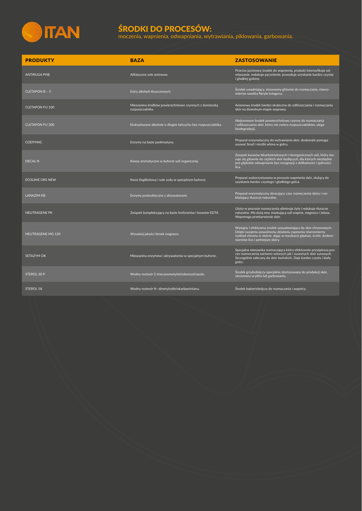 ŚRODKI DO PROCESÓW: moczenia, wapnienia, odwapniania, wytrawiania, piklowania, garbowania. PRODUKTY BAZA ZASTOSOWANIE ANTIRUGA PHB Alifatyczne sole aminowe. Przeciw jarzmowy środek do wapnienia, produkt intensyfikuje odwłaszanie, redukuje pęcznienie, powoduje uzyskanie bardzo czystej i gładkiej golizny. CLETAPON B – 5 Estry alkoholi tłuszczowych. Środek uwadniający, stosowany głównie do rozmaczania, równomiernie nawilża fibryle kolagenu. CLETAPON FU 100 Mieszanina środków powierzchniowo czynnych z domieszką rozpuszczalnika. Anionowy środek bardzo skuteczny do odtłuszczania i rozmaczania skór na dowolnym etapie wyprawy. CLETAPON FU 200 Etoksylowane alkohole o długim łańcuchu bez rozpuszczalnika. Niejonowym środek powierzchniowo czynny do rozmaczania i odtłuszczania skór, który nie zwiera rozpuszczalników, ulega biodegradacji. CODYMAC Enzymy na bazie pankreatyny. Preparat enzymatyczny do wytrawiania skór, doskonale pomaga usuwać brud i resztki włosa w golcu. DECAL N Kwasy aromatyczne w buforze soli organicznej. Związek kwasów bikarboksylowych i nieorganicznych soli, który stosuje się głównie do ciężkich skór bydlęcych, dla których niezbędne jest głębokie odwapnianie bez rezygnacji z delikatności i jędrności lica. ECOLIME ORS NEW Kwas tioglikolowy i sole sodu w specjalnym buforze. Preparat wykorzystywany w procesie wapnienia skór, służący do uzyskania bardzo czystego i gładkiego golca. LANAZIM KB Enzymy proteolityczne z aktywatorami. Preparat enzymatyczny skracający czas rozmoczenia skóry i rozkładający tłuszcze naturalne. NEUTRAGENE PK Związek kompleksujący na bazie fosforanów i kwasów EDTA Użyty w procesie rozmoczenia eliminuje żyły i redukuje tłuszcze naturalne. Ma dużą moc maskującą soli wapnia, magnezu i żelaza. Wspomaga przebarwienie skór. NEUTRAGENE MG 120 Wysokiej jakości tlenek magnezu. Wydajny i efektywny środek uzasadawiający do skór chromowych. Dzięki swojemu powolnemu działaniu zapewnia równomierny rozkład chromu w skórze, dając w rezultacie gładsze, ścisłe, drobnoziarniste lico i pełniejsze skóry. SETAZYM OK Mieszanina enzymów i aktywatorów w specjalnym buforze. Specjalna mieszanka rozmaczająca która efektywnie przyśpiesza proces rozmoczenia zarówno solonych jak i suszonych skór surowych. Szczególnie zalecany do skór świńskich. Daje bardzo czysty i biały golec. STEROL 30 P Wodny roztwór 2-triocanometylotriobenzotriazole. Środek grzybobójczy specjalnie dostosowany do produkcji skór, stosowany w piklu lub garbowaniu. STEROL 58 Wodny roztwór N- dimetyloditriokarbaminianu. Środek bakteriobójczy do rozmaczania i wapnicy.