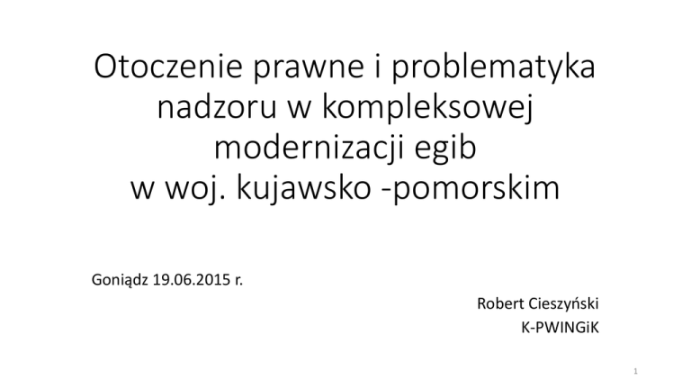 Otoczenie prawne i problematyka nadzoru w kompleksowej modernizacji egib w woj. kujawsko -pomorskim Goniądz 19.06.2015 r. Robert Cieszyński K-PWINGiK 1 Najważniejsze akty prawne • ustawa z dnia 17.05.1989 r. Prawo geodezyjne i kartograficzne; • rozporządzenie MRRiB z dnia 29.03.2001 r. w sprawie ewidencji gruntów i budynków (trwają prace nad nowelizacją); • rozporządzenie MSWiA z dnia 9.11.2011 r. w sprawie standardów technicznych wykonywania geodezyjnych pomiarów sytuacyjnych i wysokościowych oraz opracowywania i przekazywania wyników tych pomiarów do państwowego zasobu geodezyjnego i kartograficznego (trwają prace nad nowelizacją) ; • ustawa z dnia 29.01.2004 r. Prawo zamówień publicznych; • ustawa z dnia 2.07.2004 r. o swobodzie działalności gospodarczej. 2 Skala prac 1) 19 powiatów w projekcie na 23 w województwie, 2) liczba gmin objętych modernizacją – 95 na 144 w województwie (66%), 3) powierzchnia objęta projektem – 1 242 322 ha na 1 797 134 ha pow. województwa (69%), 4) liczba budynków objęta modernizacją – 445 778. 3 Skala prac Powiat aleksandrowski brodnicki Gmina Aleksandrów Kujawski Raciążek Waganiec Koneck Zakrzewo Bądkowo Aleksandrów Kujawski - m Ciechocinek - m Nieszawa - m Jabłonowo Pomorskie Zbiczno Bobrowo Bartniczka Górzno Świedziebnia Osiek Powierzchnia (ha) 13145 3288 5452 6784 7596 7970 723 1526 979 Budynki 7140 2108 2976 2638 2461 3455 4221 4514 1019 13141 13381 14582 8311 11626 10373 7501 2750 2800 3950 2650 1950 3050 2050 4 Skala prac bydgoski chełmiński golubsko-dobrzyński grudziądzki Dąbrowa Chełmińska Dobrcz Koronowo Sicienko Nowa Wieś Wielka Solec Kujawski Chełmno Kijewo Królewskie Papowo Biskupie Stolno Unisław Golub-Dobrzyń Kowalewo-Pomorskie Grudziądz Gruta Łasin Radzyń Chełmiński Świecie nad Osą 12409 12941 38290 17932 14792 15662 11315 7179 7037 9853 7246 19706 13462 16520 12268 13122 8839 9444 3731 6575 6442 4056 3736 2405 4850 3800 2620 4120 4350 6500 5500 6675 2625 2510 1570 1560 5 Skala prac inowrocławski lipnowski mogileński nakielski Inowrocław Kruszwica Gniewkowo Dąbrowa Biskupia Bobrowniki Chrostkowo Lipno Kikół Tłuchowo Skępe Dobrzyń nad Wisłą Mogilno - m Strzelno - m Mogilno Strzelno Dąbrowa Jeziora Wielkie Sadki Szubin 17121 25685 17007 14688 9538 7411 20992 9421 8984 17121 10955 833 447 24659 17954 10990 12356 15278 32386 10000 8000 5000 4500 2000 2900 9500 4000 2600 3900 4100 4581 2311 9583 4914 3754 4465 5050 10000 6 Skala prac radziejowski rypiński sępoleński świecki Piotrków Kujawski Topólka Osięciny Rogowo Skrwilno Wąpielsk Kamień (część gminy) Sępólno Krajeńskie Więcbork Sośno Nowe - m Świecie - m Bukowiec Dragacz Drzycim Jeżewo Lniano Nowe Osie Pruszcz Świecie Świekatowo Warlubie 12885 10282 12301 13993 12387 9330 15966 22251 23107 16189 348 1187 11062 11104 10817 15546 8821 10273 20915 14138 16218 6451 20102 7260 8393 8498 5500 6500 4000 2600 5100 4700 4550 1411 5731 3325 1830 3247 4986 3566 2052 3980 6944 4806 2647 3352 7 Skala prac toruński tucholski wąbrzeski włocławski żniński Czernikowo Łubianka Wielka Nieszawka Chełmża Lubicz Łysomice Obrowo Zławieś Wielka Cekcyn Śliwice Wąbrzeźno Książki Płużnica Dębowa Łąka Broniewo Brześć Kujawski Lubień Kujawski Lubraniec (część gminy) Barcin Żnin 17014 8450 21623 17895 10574 12695 16217 17791 25305 17465 19991 8566 11890 8587 7755 14386 14856 11441 11717 24210 5600 4500 2700 8000 11000 6600 9000 7700 5600 4700 2151 4742 4878 3534 3500 6300 5700 5080 5000 10000 8 Zakres prac 1) 2) 3) 4) 5) 6) PRACE WSTĘPNE powołanie odpowiedniej grupy roboczej (geodeci pow. i wingik), szczegółowa inwentaryzacja pzgik (geodeci pow.), ustalenie potrzeb modernizacyjnych (geodeci pow. z wingik), wstępne opracowanie wzoru szczegółowych warunków technicznych modernizacji (wingik+grupa robocza), uzgodnienie wzoru warunków technicznych modernizacji (wingik i geodeci pow.), przygotowanie warunków technicznych dla nadzoru zewnętrznego (geodeci pow. z wingik). Dlaczego nadzór zewnętrzny (tzw. Podmiot Monitorujący - Kontrolujący)? 9 Podstawowe założenia marketingu 10 Przykład połączenia w geodezji 3 praktyk: szybko, tanio i dobrze? tzw. trójgranicznik 11 lub dwugranicznik 12 Cel prac modernizacyjnych „Wartością jest budowanie dla innych, a nie dla siebie” • Budowa społeczeństwa informacyjnego, w tym rozwój usług publicznych poprzez rozbudowę i modernizację egib z wykorzystaniem technologii teleinformatycznych, • Usprawnienie prac jednostek administracji publicznej w zakresie planowania gospodarczego, przestrzennego, wymiaru podatków i świadczeń, zarządzania kryzysowego, ochrony środowiska, • Kompleksowość i poprawa jakości świadczonych usług na rzecz osób i jednostek korzystających z danych operatu ewidencji gruntów i budynków, a w szczególności dostarczanie aktualnych danych, • Usprawnienie przepływu informacji i obsługi interesantów z wykorzystaniem przekazu elektronicznego, w szczególności dla usług, których modernizację sfinansowano ze środków unijnych (np. dla projektu Infostrada Kujaw i Pomorza). 13 Ogólny opis zakresu prac modernizacyjnych • modernizacja ewidencji gruntów i budynków w zakresie uzupełnienia baz danych o dane dotyczące budynków i lokali oraz aktualizacji użytków gruntowych pod budynkami - dla obszarów, gdzie brak było pełnych baz danych o gruntach, budynkach i lokalach, • analiza dokładnościowa dotychczasowych danych pomiarowych odnoszących się do budynków oraz punktów granicznych, • przeprowadzenie wywiadu terenowego, • pomiar budynków i użytków, wraz z pozyskaniem niezbędnych informacji o poszczególnych atrybutach budynków, • uzupełnienie atrybutów punktów granicznych, 14 Ogólny opis zakresu prac • utworzenie i uzupełnienie istniejących baz danych egib, w celu opracowania numerycznej mapy ewidencyjnej o pełnej treści, w tym przekształcenie występującej