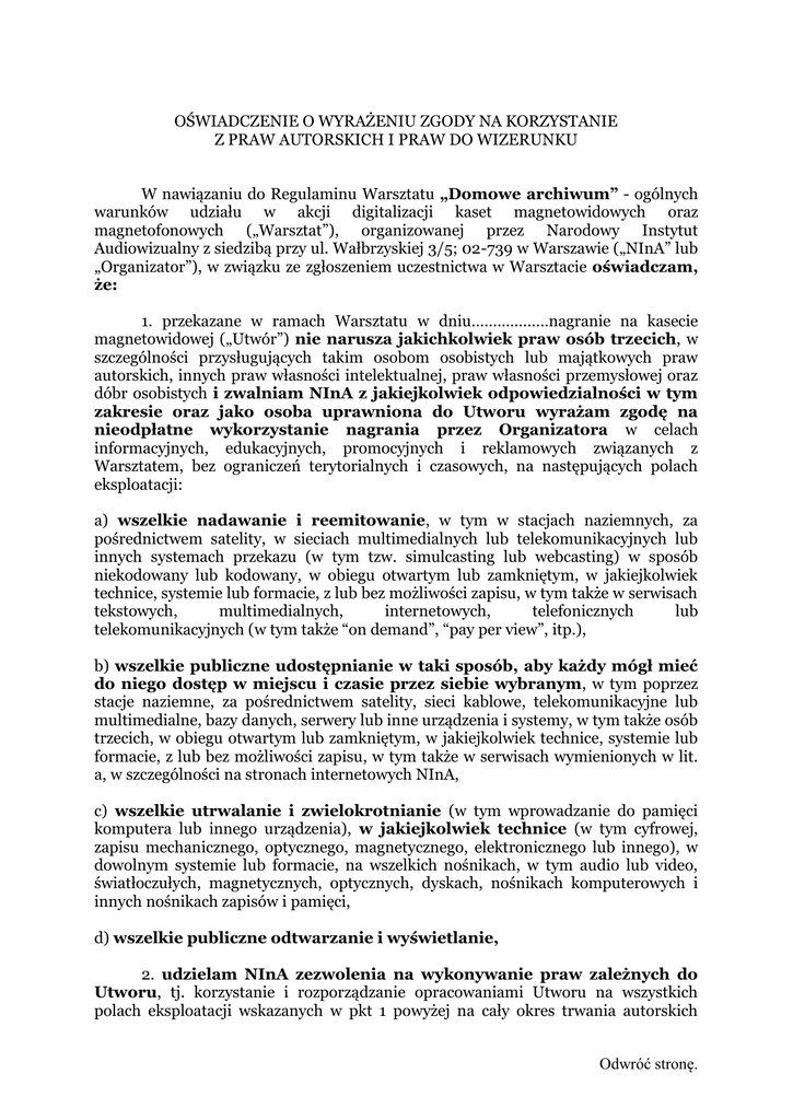 OŚWIADCZENIE O WYRAŻENIU ZGODY NA KORZYSTANIE Z PRAW AUTORSKICH I PRAW DO WIZERUNKU W nawiązaniu do Regulaminu Warsztatu „Domowe archiwum” - ogólnych warunków udziału w akcji digitalizacji kaset magnetowidowych oraz magnetofonowych („Warsztat”), organizowanej przez Narodowy Instytut Audiowizualny z siedzibą przy ul. Wałbrzyskiej 3/5; 02-739 w Warszawie („NInA” lub „Organizator”), w związku ze zgłoszeniem uczestnictwa w Warsztacie oświadczam, że: 1. przekazane w ramach Warsztatu w dniu………………nagranie na kasecie magnetowidowej („Utwór”) nie narusza jakichkolwiek praw osób trzecich, w szczególności przysługujących takim osobom osobistych lub majątkowych praw autorskich, innych praw własności intelektualnej, praw własności przemysłowej oraz dóbr osobistych i zwalniam NInA z jakiejkolwiek odpowiedzialności w tym zakresie oraz jako osoba uprawniona do Utworu wyrażam zgodę na nieodpłatne wykorzystanie nagrania przez Organizatora w celach informacyjnych, edukacyjnych, promocyjnych i reklamowych związanych z Warsztatem, bez ograniczeń terytorialnych i czasowych, na następujących polach eksploatacji: a) wszelkie nadawanie i reemitowanie, w tym w stacjach naziemnych, za pośrednictwem satelity, w sieciach multimedialnych lub telekomunikacyjnych lub innych systemach przekazu (w tym tzw. simulcasting lub webcasting) w sposób niekodowany lub kodowany, w obiegu otwartym lub zamkniętym, w jakiejkolwiek technice, systemie lub formacie, z lub bez możliwości zapisu, w tym także w serwisach tekstowych, multimedialnych, internetowych, telefonicznych lub telekomunikacyjnych (w tym także “on demand”, “pay per view”, itp.), b) wszelkie publiczne udostępnianie w taki sposób, aby każdy mógł mieć do niego dostęp w miejscu i czasie przez siebie wybranym, w tym poprzez stacje naziemne, za pośrednictwem satelity, sieci kablowe, telekomunikacyjne lub multimedialne, bazy danych, serwery lub inne urządzenia i systemy, w tym także osób trzecich, w obiegu otwartym lub zamkniętym, w jakiejkolwiek technice, systemie lub formacie, z lub bez możliwości zapisu, w tym także w serwisach wymienionych w lit. a, w szczególności na stronach internetowych NInA, c) wszelkie utrwalanie i zwielokrotnianie (w tym wprowadzanie do pamięci komputera lub innego urządzenia), w jakiejkolwiek technice (w tym cyfrowej, zapisu mechanicznego, optycznego, magnetycznego, elektronicznego lub innego), w dowolnym systemie lub formacie, na wszelkich nośnikach, w tym audio lub video, światłoczułych, magnetycznych, optycznych, dyskach, nośnikach komputerowych i innych nośnikach zapisów i pamięci, d) wszelkie publiczne odtwarzanie i wyświetlanie, 2. udzielam NInA zezwolenia na wykonywanie praw zależnych do Utworu, tj. korzystanie i rozporządzanie opracowaniami Utworu na wszystkich polach eksploatacji wskazanych w pkt 1 powyżej na cały okres trwania autorskich Odwróć stronę. praw majątkowych do Utworu oraz na korzystanie, w sposób i na polach eksploatacji określonych w pkt 1, z Utworu i jego fragmentów – do celów reklamy i promocji, a także wykorzystanie Utworu w całości lub we fragmentach w innych utworach multimedialnych i audiowizualnych; 3. upoważniam NInA do decydowania o oznaczeniu Utworu imieniem lub nazwiskiem twórcy albo udostępnienia go anonimowo oraz zobowiązuje się do niewykonywania wobec NInA przysługujących mi osobistych praw autorskich do Utworu; 4. wyrażam zgodę na nieodpłatne rozpowszechnianie mojego wizerunku utrwalonego na nagraniu oraz posiadam niezbędne zgody na rozpowszechnianie utrwalonego tam wizerunku innych osób w celach związanych z Akcją w zakresie wskazanym w pkt 1-2 powyżej i zwalniam NInA z jakiejkolwiek odpowiedzialności z tego tytułu. Zgadzam się na udostępnienie nagrań*: - w portalach NInA - stacjonarnie w Archiwum NInA *niepotrzebne skreślić Wpisz czytelnie imię, nazwisko, adres oraz e-mail i telefon kontaktowy: …………………………………………………………………………………………………………… …………………………………………………………………………………………………………… …………………………………………………………………………………………………………… …………………………………………………………………………………………………………… Ilość kaset oddanych do digitalizacji: ……………………………………………………………………………………………………………. Warszawa, data ……………………………………………………………… Podpis
