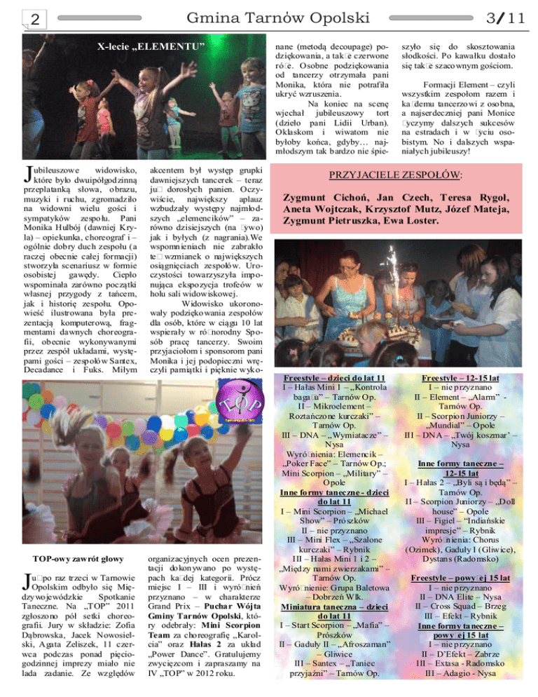 Gmina Tarnow Opolski 2 X-lecie „ELEMENTU” Impreza na 100 pań J ubileuszowe widowisko, które było dwuipółgodzinną przeplatanką słowa, obrazu, muzyki i ruchu, zgromadziło na widowni wielu gości i sympatyków zespołu. Pani Monika Hulbój (dawniej Kryla) – opiekunka, choreograf i – ogólnie dobry duch zespołu (a raczej obecnie całej formacji) stworzyła scenariusz w formie osobistej gawędy. Ciepło wspominała zarówno początki własnej przygody z tańcem, jak i historię zespołu. Opowieść ilustrowana była prezentacją komputerową, fragmentami dawnych choreografii, obecnie wykonywanymi przez zespół układami, występami gości – zespołów Santex, Decadance i Fuks. Miłym TOP-owy zawrót głowy J uż po raz trzeci w Tarnowie Opolskim odbyło się Międzywojewódzkie Spotkanie Taneczne. Na „TOP” 2011 zgłoszono pół setki choreografii. Jury w składzie: Zofia Dąbrowska, Jacek Nowosielski, Agata Zeliszek, 11 czerwca podczas ponad pięciogodzinnej imprezy miało nie lada zadanie. Ze względów akcentem był występ grupki dawniejszych tancerek – teraz już dorosłych panien. Oczywiście, największy aplauz wzbudzały występy najmłodszych „elemencików” – zarówno dzisiejszych (na żywo) jak i byłych (z nagrania).We wspomnieniach nie zabrakło też wzmianek o największych osiągnięciach zespołów. Uroczystości towarzyszyła imponująca ekspozycja trofeów w holu sali widowiskowej. Widowisko ukoronowały podziękowania zespołów dla osób, które w ciągu 10 lat wspierały w różnorodny Sposób pracę tancerzy. Swoim przyjaciołom i sponsorom pani Monika i jej podopieczni wręczyli pamiątki i pięknie wyko- organizacyjnych ocen prezentacji dokonywano po występach każdej kategorii. Prócz miejsc I – III i wyróżnień przyznano – w charakterze Grand Prix – Puchar Wójta Gminy Tarnów Opolski, który odebrały: Mini Scorpion Team za choreografię „Karolcia” oraz Hałas 2 za układ „Power Dance”. Gratulujemy zwycięzcom i zapraszamy na IV „TOP” w 2012 roku. nane (metodą decoupage) podziękowania, a także czerwone róże. Osobne podziękowania od tancerzy otrzymała pani Monika, która nie potrafiła ukryć wzruszenia. Na koniec na scenę wjechał jubileuszowy tort (dzieło pani Lidii Urban). Oklaskom i wiwatom nie byłoby końca, gdyby… najmłodszym tak bardzo nie śpie- 3 11 szyło się do skosztowania słodkości. Po kawałku dostało się także szacownym gościom. Formacji Element – czyli wszystkim zespołom razem i każdemu tancerzowi z osobna, a najserdeczniej pani Monice życzymy dalszych sukcesów na estradach i w życiu osobistym. No i dalszych wspaniałych jubileuszy! PRZYJACIELE ZESPOŁÓW: Zygmunt Cichoń, Jan Czech, Teresa Rygoł, Aneta Wojtczak, Krzysztof Mutz, Józef Mateja, Zygmunt Pietruszka, Ewa Loster. Freestyle – dzieci do lat 11 I – Hałas Mini 1 – „Kontrola bagażu” – Tarnów Op. II – Mikroelement – Roztańczone kurczaki” – Tarnów Op. III – DNA – „Wymiatacze” – Nysa Wyróżnienia: Elemencik – „Poker Face” – Tarnów Op.; Mini Scorpion – „Military” – Opole Inne formy taneczne - dzieci do lat 11 I – Mini Scorpion – „Michael Show” – Prószków II – nie przyznano III – Mini Flex – „Szalone kurczaki” – Rybnik III – Hałas Mini 1 i 2 – „Między nami zwierzakami” – Tarnów Op. Wyróżnienie: Grupa Baletowa – Dobrzeń Wlk. Miniatura taneczna – dzieci do lat 11 I – Start Scorpion – „Mafia” – Prószków II – Gaduły II – „Afroszaman” – Gliwice III – Santex – „Taniec przyjaźni” – Tarnów Op. Freestyle – 12-15 lat I – nie przyznano II – Element – „Alarm” Tarnów Op. II – Scorpion Juniorzy – „Mundial” – Opole III – DNA – „Twój koszmar’ – Nysa Inne formy taneczne – 12-15 lat I – Hałas 2 – „Byli są i będą” – Tarnów Op. II – Scorpion Juniorzy – „Doll house” – Opole III – Figiel – “Indiańskie impresje” – Rybnik Wyróżnienia: Chorus (Ozimek), Gaduły I (Gliwice), Dystans (Radomsko) Freestyle – powyżej 15 lat I – nie przyznano II – DNA Elite – Nysa II – Cross Squad – Brzeg III – Efekt – Rybnik Inne formy taneczne – powyżej 15 lat I – nie przyznano II – D’Efekt – Zabrze III – Extasa - Radomsko III – Adagio - Nysa