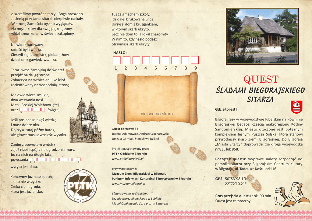 o szczęśliwy powrót sitarzy - Boga proszono. Jesienią przy Janie sitarki cierpliwie czekały. W stronę Zamościa tęskno wyglądały. Na męża, który dla swej pięknej żony, wiózł sznur korali w świecie zakupiony. Na widok karawany radość była wielka. Cieszyli się: burmistrz, pleban, żony dzieci oraz gawiedź wszelka. HASŁO: 1 Teraz wróć Zamojską do świateł przejdź na drugą stronę. Zobaczysz na wzniesieniu kościół zorientowany na wschodnią stronę. wyryta jest data. Kończymy już nasz spacer, ale to nie wszystko. Czeka cię nagroda, która jest już blisko. 4 5 6 7 8 9 Gdzie to jest? miejsce na skarb Jeśli posiadasz jakąś wiedzę i masz dobre oko. Dojrzysz tutaj późny barok, ale głowę musisz wznieść wysoko. 7 3 ŚLADAMI BIŁGORAJSKIEGO SITARZA 3 6 2 QUEST Ma dwie wieże smukłe, dwa wezwania nosi Matki Boskiej Wniebowziętej oraz Świętej. Zanim z powrotem wrócisz zejdź niżej i spójrz na ogrodzenia mury, bo na nich na długie lata, powstania Tuż za gmachem szkoły, idź dalej brukowaną ulicą. Ujrzysz dom z krużgankiem, w którym skarb ukryto. Lecz nie dom to, a lokal znakomity W nim to, gdy hasło podasz otrzymasz skarb ukryty. Quest opracowali : Joanna Adamowicz, Andrzej Czacharowski, Urszula Górniak, Stanisława Dzikoń Projekt przygotowany przez PTTK Oddział w Biłgoraju www.p kbilgoraj.vdl.pl 9 przy współpracy z: Muzeum Ziemi Biłgorajskiej w Biłgoraju Punktem Informacji Kulturalnej i Turystycznej w Biłgoraju www.muzeumbilgoraj.pl Sfinansowano ze środków : Urzędu Marszałkowskiego w Lublinie Model Opakowania Sp. z o.o. w Biłgoraju Biłgoraj leży w województwie lubelskim na Równinie Biłgorajskiej będącej częścią makroregionu Kotliny Sandomierskiej. Miasto otoczone jest potężnym kompleksem leśnym Puszczą Solską, która stanowi przyrodniczy skarb Ziemi Biłgorajskiej. Do Biłgoraja „Miasta Sitarzy” doprowadzi Cię droga wojewódzka nr 835 lub 858. Początek questu: wyprawę należy rozpocząć od pomnika sitarza przy Biłgorajskim Centrum Kultury w Biłgoraju, ul. Tadeusza Kościuszki 16 GPS: 50°53' 98.1"N 22°72'10.2"E Czas przejścia questu : ok. 90 min Quest jest całoroczny. Zapraszamy na spacer z historią po Łabędzim grodzie Przeszłość powinieneś poznawać w słońcu i niepogodzie Masz przed sobą postać sitarza dawnego Biłgoraja gospodarza, który na ławce siedzi ku uciesze gawiedzi. Wspomina dawne czasy gdy w mieście było pełno kiełbasy. A do tego pieroga gryczanego i smacznego, niezwykłego piwa zielonego. Stojąc przodem do pomnika w lewą stronę skręć kolego. Zobaczysz tam kościółek pod wezwaniem św. Jerzego. Naprzeciwko kościółka, na 1 Skwerku stoi pomnik kamienny hołd Nowakowski złożył bezimienny. Dziedzic Biłgoraja pomnik postawił Ignacemu 5 2 co w naszym mieście gościł i wierszem go tak rozsławił: „Zaszczyt jego wieloraki Sławny w sita i przetaki”. Przejdź z powrotem na przejściu, na kościółka stronę. Skręć w prawo w uliczkę, gdzie patronem jest ks. Samolej i dojdź do ulicy Ogrodowej. Dalej idąc między blokami w ulicę Nadstawną widzimy drewnianą chatę. Jedyną taką na świecie, nigdzie podobnej nie znajdziecie. Przejdź przez drewnianą bramę na zielone podwórze, gdzie stoi konny kierat i drążone w drewnie, kłodowe ule. W zagrodzie z sosnowego drewna, zbudowanej przed dwustu laty. Widać przez duże okna sitarskie warsztaty. Słychać kroki sitarzy co przed wielu laty Ruszali wiosną w dalekie kraje sławić biłgorajskie obyczaje. Sprzedawali w Rosji sita i przetaki. Mieli swój język nie byle jaki. Nie bali się trudów podróży oraz z rodzinami rozłąki, bo mocno kochali swoje dzieci i małżonki. One cierpliwie siatki tkały i gospodarstwem się zajmowały. Gdy wyjdziesz z zagrody na zachód skieruj swe kroki. Zobaczysz domy nowo zbudowane Miasteczka na szlaku kultur. Tu stanie nowy dom kupca, cerkiew i domy sitarzy, co gontem są pokryte i na drewnianych słupach wsparte. Pośrodku żydowskiego rynku synagoga się wznosi i każdego turystę do zwiedzania prosi. Teraz wróć do Zagrody Sitarskiej, obok skręć w lewo. Idź śmiało na północ wkrótce trafisz na miejski rynek. Niegdyś ludny i gwarny w czwartkowe poranki, gdzie zjeżdżały z okolic pełne towarów furmanki. Jaj, serów i śmietany, pszenicy i gęsi. Starsi jeszcze wspominają, aż się łezka w oku kręci. Gdakanie, muczenie, nawoływanie, śmiechy i hałasy. Dzisiaj tutaj spokojnie – przyszły nowe czasy. Dziś to miejsce bardzo na lepsze się zmieniło, więc po trudach zwiedzania usiąść będzie miło. Magistrat dostojny stoi z Radą i Burmistrzem Dwa pomniki plac zdobią Stojąc przy Pomniku Wdzięczności, spójrz przez ramię w prawo. Na trzech ulic skrzyżowanie Kościuszki, Zamojskiej i Placu spotkanie. 8 Idź łukiem na wschód, przejdź przez skrzyżowanie, miń rondo, aż przed figurą św. Nepomucena staniesz. 4 Tutaj wiosną żegnali się sitarze i ich żony, gdy wyjeżdżali handlować w dalekie strony. Łez mnóstwo wylano, modłów wiele wznoszono