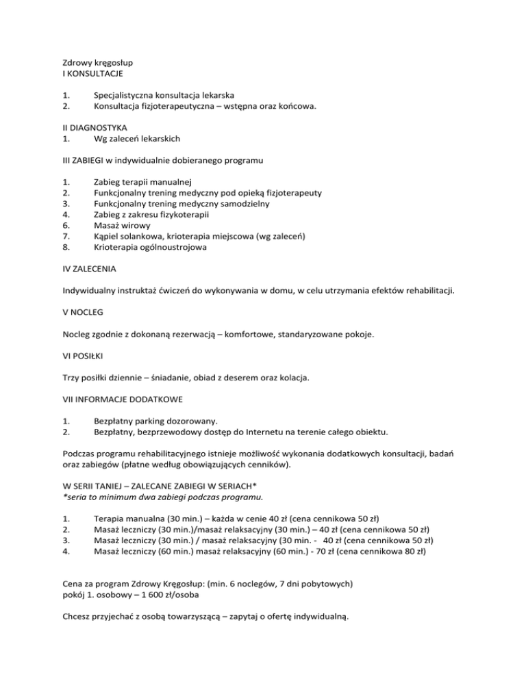 Zdrowy kręgosłup I KONSULTACJE 1. 2. Specjalistyczna konsultacja lekarska Konsultacja fizjoterapeutyczna – wstępna oraz końcowa. II DIAGNOSTYKA 1. Wg zaleceń lekarskich III ZABIEGI w indywidualnie dobieranego programu 1. 2. 3. 4. 6. 7. 8. Zabieg terapii manualnej Funkcjonalny trening medyczny pod opieką fizjoterapeuty Funkcjonalny trening medyczny samodzielny Zabieg z zakresu fizykoterapii Masaż wirowy Kąpiel solankowa, krioterapia miejscowa (wg zaleceń) Krioterapia ogólnoustrojowa IV ZALECENIA Indywidualny instruktaż ćwiczeń do wykonywania w domu, w celu utrzymania efektów rehabilitacji. V NOCLEG Nocleg zgodnie z dokonaną rezerwacją – komfortowe, standaryzowane pokoje. VI POSIŁKI Trzy posiłki dziennie – śniadanie, obiad z deserem oraz kolacja. VII INFORMACJE DODATKOWE 1. 2. Bezpłatny parking dozorowany. Bezpłatny, bezprzewodowy dostęp do Internetu na terenie całego obiektu. Podczas programu rehabilitacyjnego istnieje możliwość wykonania dodatkowych konsultacji, badań oraz zabiegów (płatne według obowiązujących cenników). W SERII TANIEJ – ZALECANE ZABIEGI W SERIACH* *seria to minimum dwa zabiegi podczas programu. 1. 2. 3. 4. Terapia manualna (30 min.) – każda w cenie 40 zł (cena cennikowa 50 zł) Masaż leczniczy (30 min.)/masaż relaksacyjny (30 min.) – 40 zł (cena cennikowa 50 zł) Masaż leczniczy (30 min.) / masaż relaksacyjny (30 min. - 40 zł (cena cennikowa 50 zł) Masaż leczniczy (60 min.) masaż relaksacyjny (60 min.) - 70 zł (cena cennikowa 80 zł) Cena za program Zdrowy Kręgosłup: (min. 6 noclegów, 7 dni pobytowych) pokój 1. osobowy – 1 600 zł/osoba Chcesz przyjechać z osobą towarzyszącą – zapytaj o ofertę indywidualną. Istnieje możliwość przedłużenia pobytu. Decyzję co do wyboru odpowiedniego programu leczenia, podejmuje lekarz oraz fizjoterapeuta, po przeprowadzeniu wstępnego badania lekarskiego oraz fizjoterapeutycznego.