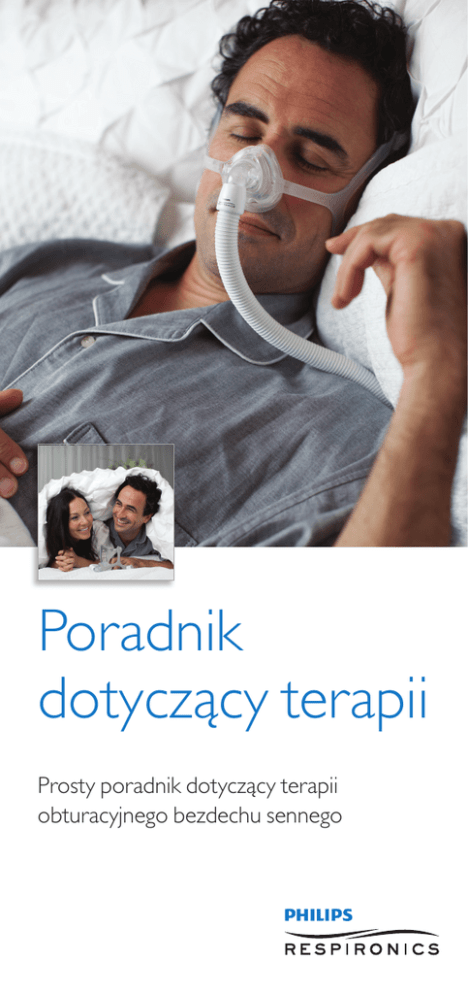 Poradnik dotyczący terapii Prosty poradnik dotyczący terapii obturacyjnego bezdechu sennego Poradnik dotyczący terapii: ważna jest skuteczność leczenia a Zdiagnozowano u Ciebie obturacyjny bezdech senny b Czym jest obturacyjny bezdech senny? c Terapia i korzyści ze stałego leczenia d Informacje o sprzęcie e Użytkowanie i konserwacja urządzenia diagnozowano u Ciebie a Z obturacyjny bezdech senny Objawia się to problemami ze snem. Może występować głośne chrapanie, uczucie duszenia lub dławienie w nocy. zym jest obturacyjny b C bezdech senny? U osób cierpiących na obturacyjny bezdech senny (OBS) wielokrotnie podczas snu następuje zatrzymanie oddechu w wyniku zapadania się dróg oddechowych. Górne drogi oddechowe mogą zapadać się z powodu osłabienia aktywności mięśni, rozrostu tkanek wokół dróg oddechowych lub budowy anatomicznej sprzyjającej zwężeniu dróg oddechowych. W konsekwencji powietrze nie dociera do płuc, a poziom dwutlenku węgla we krwi się podnosi. Powstają zaburzenia struktury snu. Otwarte górne drogi oddechowe Zablokowane górne drogi oddechowe Drożne i otwarte górne drogi Po zablokowaniu górnych dróg oddechowe pozwalają na swobodny oddechowych pojawia się chrapanie przepływ powietrza do i z płuc. i bezdech (zatrzymanie oddechu). Niektóre poniższe proste środki mogą wspomóc leczenie obturacyjnego bezdechu sennego: •Redukcja masy ciała •Unikanie spożywania alkoholu wieczorem •Spanie na boku Jednak środki te nie muszą prowadzić do całkowitego rozwiązania problemu. erapia i korzyści ze stałego cT leczenia Wytwarzanie dodatniego ciśnienia w drogach oddechowych (PAP) jest efektywnym sposobem leczenia obturacyjnego bezdechu sennego. Terapia PAP polega na zapewnieniu przepływu powietrza przez górne drogi oddechowe w delikatny i nieinwazyjny sposób. Przepływ ten uniemożliwia zapadanie się ścian dróg oddechowych i ułatwia oddychanie podczas snu. System do terapii PAP składa się z 3 następujących elementów: Urządzenie Na tyle niewielkie, że zmieści się na szafce nocnej. Maska Maska nosowa zakrywa nos, a maska ustno-nosowa zakrywa nos i usta. Przewód doprowadzający Umożliwia połączenie urządzenia z maską. Ważne jest, aby korzystać z urządzenia do terapii PAP w sposób zalecany przez lekarza. Objawy mogą powrócić, jeśli urządzenie będzie stosowane nieregularnie. Udowodniono, że nieleczony obturacyjny bezdech senny sprzyja występowaniu następujących schorzeń: •Nadciśnienie tętnicze •Zaburzenia rytmu serca •Zaburzenia metaboliczne •Udar •Choroby układu krążenia Regularne używanie urządzenia do terapii PAP, zgodnie z zaleceniem specjalisty, może zredukować niekorzystny wpływ obturacyjnego bezdechu sennego na życie. Adekwatne leczenie może doprowadzić do następujących korzyści: •Niższe ciśnienie krwi •Poprawa samopoczucia •Zmniejszenie senności w ciągu dnia •Lepsza pamięć, koncentracja i uwaga •Mniej wizyt w łazience w nocy, mniej wybudzeń ze snu •Poprawienie jakości życia •Mniejsze ryzyko wypadku spowodowanego zaśnięciem za kierownicą •Mniejsze ryzyko chorób układu sercowo-naczyniowego d Informacje o sprzęcie Przed rozpoczęciem terapii zaleca się zapoznanie ze stosowanym urządzeniem i maską. Instrukcje dla użytkownika są dostarczane razem z urządzeniem. Bardzo ważne jest, aby poświęcić czas na zapoznanie się z ich treścią. Urządzenia do terapii CPAP Urządzeniami najczęściej stosowanymi w terapii obturacyjnego bezdechu sennego są urządzenia do wytwarzania stałego dodatniego ciśnienia w drogach oddechowych (CPAP). Urządzenia do terapii CPAP wymuszają stały przepływ powietrza, który zapewnia drożność górnych dróg oddechowych. Urządzenia System One są wyposażone w unikalne funkcje zapewniające komfort, co ułatwia regularne korzystanie z terapii. Funkcja C-Flex: Technologia pozwalająca uzyskać niższe ciśnienie przy wydechu, zapewniając wyższy komfort w porównaniu do standardowego urządzenia do terapii PAP. Funkcja A-Flex: Unikalna technologia, dostępna w niektórych urządzeniach do terapii CPAP, która łagodzi zmiany ciśnienia występujące przy przejściu z fazy wdechu do wydechu, poprawiając komfort użytkowania. Technologia A-Flex pozwala zachować bardziej naturalny sposób oddychania w porównaniu do standardowego urządzenia do terapii PAP. Urządzenia System One należą do najcichszych dostępnych systemów terapeutycznych, zapewniając komfort w czasie snu. Urządzenia do terapii dwupoziomowej (Bi-level) Urządzenia do terapii CPAP wytwarzają ciśnienie stałe, urządzenia do terapii dwupoziomowej potrafią wytworzyć dwa poziomy ciśnienia — niższe przy wydechu i wyższe przy wdechu. Urządzenia te są stosowane u pacjentów, którzy mają problemy z tolerancją terapii przy użyciu urządzeń typu CPAP. Funkcja Bi-Flex: Technologia zapewniająca komfort, która czyni zarówno wdech, jak i wydech bardziej komfortowymi w porównaniu do standardowego urządzenia do terapii dwupoziomowej. Nawilżacz Nawilżacz służy do nawilżania powietrza dostarczanego przez urządzenie do terapii. Dzięki nawilżaniu zmniejsza się wpływ niektórych skutków ubocznych terapii, takich jak podrażnienie nosa i suchość górnych dróg oddechowych; zwiększa się także komfort. Ponadto funkcja regulacji poziomu wilgotności w urządzeniach System One zapobiega skraplaniu się wody w przewodzie i masce. Pacjenci preferujący sen w szczególnie niskich temperaturach mogą skorzystać z nowego opcjonalnego podgrzewanego przewodu, zapewniającego wyższy poziom wilgotności bezwzględnej. Urządzenia System One są wyposażone w unikalny nawilżacz, uniemożliwiający dostanie się do urządzenia wody, która mogłaby spowodować uszkodzenia. Przewód Przewód służy do doprowadzania powietrza z urządzenia do maski. Urządzenia System One umożliwiają opcjonalnie zastosowanie przewodu o 