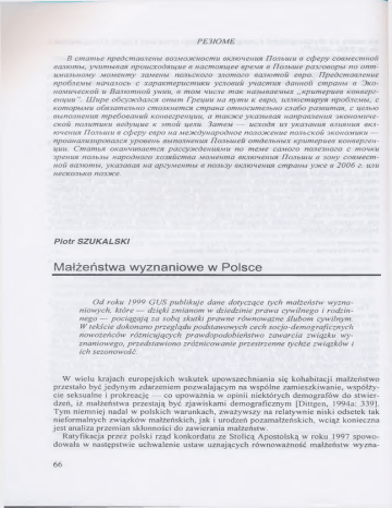 PE3IOME B e ccpepy c o e j u e c m u o u npoucxodniąue e n a c m o m ą e e epe.M H e rionbuie p a 3 z o e o p b i no onmUMCuibHOMy m o m en my 3 a M e n b i n 0 J ib C K 0 Z 0 3 J io m o z o eajuomou eepo. T l p e d c ł n a e j i e m i e npo6.ne.Mbi Hcmcuiocb c x a p a K m e p u c m u K u ycnoeuu ynacm m dannou cmpaHbi e 3 k o tto.umecKou u Bamomnou y m i u , e moM m ic n e maK H a 3 b w a e .\ib ix ,,K pum epuee Koneeppe n if i tu LUupe o ó c y j t c d a j i c n onbim F p e i f u u H a n y m u k e e p o , m u u o c m u p y n n p o ó n e M b i, c K o m o p b iM U o6x3ame.nbiio c m o jiK H e m c fi c m p m a o m H O C u m ejibH O c n a ó o p c n c iu m c m , c ife iib io e b m o jiH e m in mpeóoeauuu K O iie e z p e iiiju u , a m a i o i c e y K a 3 b i e a n n c m p a w i e m i n 3 K 0 H 0 .m m e c k o u n o n u m u K U a e d y i ą u e k i m o i i ije n u . 3ameM — u c x o d f i U3 y K .a 3 a m ifi enusinun euntouenun T l o n b u iu e c r f je p y eepo n a M e o t c d y n a p o d n o e nonooiceuue n o jib C K o ii s k o h o m u k u — npoaHajiu3itpoeancH y p o e e i i b e b w o j i u e H m I7ojibuieu o m ó e /ib H b i.r K pum epuee Konaepzenifu u . CmambH O K a n m m a e m a i p a c c y j / c d e n i W M i t no meMe ca.wozo n o n e 3 n o z o c m o H K u s p e n n n nojib3bi H a p o d u o z o x o 3 m i c m e a .w o .w e n m a e K n m n e m is i H o u b u t u e 3 0 H y coeMecmc m a m b e n p e d c m a a j i e u b i e o s . u o j i c u o c m i i B K iu o n eu u H r i o n b u i u e w u o m b i, y m i m b m a n Hoii eamombi, yKa3aeciH na apzyMeHmbi e nonb3y emuoneHun cm paim yjice e 2 0 0 6 z. m u necKOJibKO no3cnce. Piotr SZUKALSKI Małżeństwa wyznaniowe w Polsce O d roku 1999 GUS publikuje dane dotyczące tych małżeństw wyzna niowych, które — dzięki zmianom w dziedzinie prawa cywilnego i rodzin nego — pociągają za sobą skutki prawne równoważne ślubom cywilnym. W tekście dokonano przeglądu podstawowych cech socjo-demograficznych nowożeńców różnicujących prawdopodobieństwo zawarcia związku w y znaniowego, przedstawiono zróżnicowanie przestrzenne tychże związków i ich sezonowość. W wielu krajach europejskich wskutek upowszechniania się kohabitacji małżeństwo przestało być jedynym zdarzeniem pozwalającym na wspólne zamieszkiwanie, współży cie seksualne i prokreację — co upoważnia w opinii niektórych demografów do stwier dzeń, iż małżeństwa przestają być zjawiskami demograficznym [Dittgen, 1994a: 339]. Tym niemniej nadal w polskich warunkach, zważywszy na relatywnie niski odsetek tak nieformalnych związków małżeńskich, jak i urodzeń pozamałżeńskich, wciąż konieczna jest analiza przemian skłonności do zawierania małżeństw. Ratyfikacja przez polski rząd konkordatu ze Stolicą Apostolską w roku 1997 spowo dowała w następstwie uchwalenie ustaw uznających równoważność małżeństw wyzna- 66 niowych zawieranych przez osoby różnych wyznań i obrządków z małżeństwami cywil nymi. Przejawia się ona nabywaniem tych samych praw i obowiązków, co w przypadku małżeństw cywilnych, jeśli nowożeńcy wyrażają taką wolę. Na tej podstawie GUS po czął gromadzić i publikować dane dotyczące małżeństw wyznaniowych. W państwach europejskich wyróżnić można dwa podejścia do relacji pomiędzy mał żeństwami cywilnymi i wyznaniowymi. Według pierwszego z nich oba rodzaje mał żeństw są względem siebie konkurencyjne, albowiem oba prowadzą do powstania takich samych związków wobec prawa praw i obowiązków. Według drugiego, małżeństwa wyznaniowe są jedynie podgrupą małżeństw cywilnych, albowiem zawarcie związku cywilnego warunkuje możność wystąpienia ceremonii religijnej. Istnieje jeszcze jedna możliwość — występowanie tylko jednego z tych małżeństw. Taka sytuacja występo wała do rewolucji francuskiej, do czasu wprowadzenia małżeństwa cywilnego w krajach, gdzie istniały oficjalne silne związki pomiędzy państwem a Kościołem, owocujące obar czaniem duchownych obowiązkami urzędników stanu cywilnego. Taka sytuacja utrzy mywała się do wieku X X 1). W przypadku Polski w latach 1946— 1989 (a w zasadzie dopiero od roku 1958, zwa żywszy na wcześniejsze częste niedopełnianie obowiązku zawierania małżeństwa w USC) mieliśmy do czynienia z sytuacją drugą, tzn. zawarcie związku wyznaniowego możliwe było jedynie po uprzednim zawarciu związku cywilnego. Ta klarowna sytuacja pogmatwała się w roku 1989, gdy polski rząd zniósł ów obowiązek bez jednoczesnego zrównania w prawach obu rodzajów związków. W efekcie pewna część zawartych w latach dziewięćdziesiątych, uznawanych przez środowisko, małżeństw wobec prawa nie jest legalnym związkiem2). Dopiero począwszy od roku 1999, dzięki odpowiednim zmianom ustawowym (Ustawa z dnia 24 lipca 1998 r. — Dz. U. nr 117, poz. 757) uru chomionym podpisaniem w 1993 r. konkordatu z Kościołem katolickim, istnieje możli wość zawarcia związku wyznaniowego o skutkach równoważnych małżeństwom cywil nym. Spośród 151757 małżeństw wyznaniowych zawartych w roku 2000 tylko 864 (mniej niż 0,6%) były związkami zawartymi według rytuału innych kościołów i związków wyznaniowych3). Zważywszy na tak znaczącą przewagę małżeństw udzielonych przez kapłanów Kościoła katolickiego uzasadnione wydaje się przypomnienie, jak kształto wała się skłonność do zawierania małżeństw sakramentalnych tego wyznania w ciągu ostatnich trzech dekad. O ile w roku 1972 na 1000 małżeństw cywilnych przypadało 819 małżeństw kościelnych, o tyle w latach osiemdziesiątych ten współczynnik stale prze kraczał 900, przy czym w latach 1983 i 1984 doszło do przedziwnej sytuacji — zawarto bowiem więcej ślubów sakramentalnych niż świeckich. Wyjaśnienia doszukiwać się należy w zawieraniu ślubów sakramentalnych „z opóźnieniem” przez pary, które w latach siedemdziesiątych