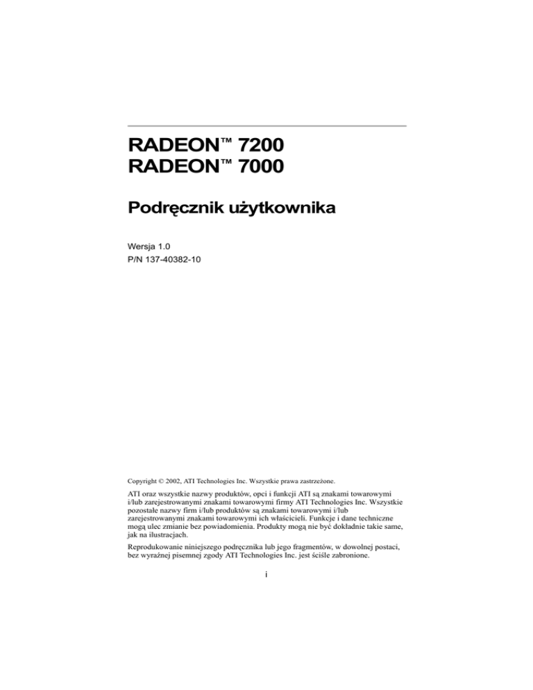 RADEON™ 7200 RADEON™ 7000 Podręcznik użytkownika Wersja 1.0 P/N 137-40382-10 Copyright © 2002, ATI Technologies Inc. Wszystkie prawa zastrzeżone. ATI oraz wszystkie nazwy produktów, opci i funkcji ATI są znakami towarowymi i/lub zarejestrowanymi znakami towarowymi firmy ATI Technologies Inc. Wszystkie pozostałe nazwy firm i/lub produktów są znakami towarowymi i/lub zarejestrowanymi znakami towarowymi ich właścicieli. Funkcje i dane techniczne mogą ulec zmianie bez powiadomienia. Produkty mogą nie być dokładnie takie same, jak na ilustracjach. Reprodukowanie niniejszego podręcznika lub jego fragmentów, w dowolnej postaci, bez wyraźnej pisemnej zgody ATI Technologies Inc. jest ściśle zabronione. i Oświadczenie o zrzeczeniu się odpowiedzialności Niniejszy dokument został opracowany z najwyższą starannością, jednakże firma ATI Technologies Inc. nie ponosi odpowiedzialności za działanie lub stosowanie opisanego tu sprzętu, oprogramowania, ani innych produktów oraz dokumentacji, ani za przerwy w świadczeniu usług, straty lub przerwy w działalności gospodarczej, straty spodziewanego zysku, ani za przypadkowe lub wynikające odszkodowania związane z udostępnianiem, działaniem lub użytkowaniem opisanego tu sprzętu, oprogramowania i innych produktów i dokumentacji ATI. Firma ATI Technologies Inc. zastrzega sobie prawo do wprowadzania bez uprzedniego powiadomienia zmian do opisanego tu produktu lub systemu w celu podwyższenia niezawodności, funkcjonalności lub polepszenia wyglądu. W odniesieniu do wyrobów produkcji ATI opisanych w niniejszym dokumencie, firma ATI zrzeka się wszelkich bezpośrednich oraz pośrednich gwarancji na te wyroby, w tym, lecz nie tylko, pośrednich gwarancji sprzedażności, przydatności do określonych zastosowań oraz nie naruszalności. Informacje o produkcie MACROVISION Przepis A.Apparatus Claims of U.S. Patent Nos. 4,631,603, 4,577,216, 4,819,098, oraz 4,907,093 dopuszczone wyłącznie dla ograniczonej grupy użytkowników. B.W dodatkowych drukach dołączonych do niniejszego Produktu, należy w odpowiednich miejscach podać: Niniejszy produkt zawiera technologię ochrony praw autorskich, która jest chroniona pewnymi patentami USA oraz innymi prawami do własności intelektualnej będącymi własnością Macrovision Corporation i innych właścicieli. Stosowanie technologii ochrony praw autorskich musi być zatwierdzone przez Macrovision Corporation i jest ona przeznaczona do zastosowań prywatnych (domowych) oraz innych ograniczonych zastosowań, z wyjątkiem przypadków zatwierdzonych przez Macrovision Corporation. Inżynierskie kopiowanie konstrukcji oraz demontaż są zabronione. ii Spis treści Wprowadzenie . . . . . . . . . . . . . . . . . . . . . . . . . . . . . . . 1 Krótki opis funkcji....................................................................................... 2 Radeon™ 7000....................................................................................... 2 Radeon™ 7200....................................................................................... 2 Pakiet programów ATI’s Catalyst Software Suite ................................... 3 Wysoka wydajność 3D ........................................................................... 3 Direct 3D® i OpenGL® .......................................................................... 3 HydraVision™ ....................................................................................... 4 Gniazda monitorów . . . . . . . . . . . . . . . . . . . . . . . . . . . 5 Pakiet Catalyst™ Software Suite . . . . . . . . . . . . . . . . 6 Zakładka Ekran ATI.................................................................................. 6 Zakładka Monitor>Atrybuty .................................................................. 7 Zakładka Monitor>Dostosowania .......................................................... 8 Zakładka Monitor>Zaawansowane ........................................................ 9 Monitory ............................................................................................... 10 Instalowanie drugiej karty graficznej ATI ........................................... 10 Włączanie/Wyłączanie dodatkowych wyświetlaczy............................ 11 Włączanie trybu Rozszerzonego Pulpitu.............................................. 11 Dynamiczne ponowne przypisywanie wyświetlacza ........................... 11 Wirtualne przemieszczanie monitorów ................................................ 12 Rozszerzanie “ratiometryczne” ............................................................ 13 Zakładka Barwa ATI ................................................................................ 14 Zakładka Opcji ATI .................................................................................. 16 Zakładka Nakładka ATI ........................................................................... 17 Nakładka wideo .................................................................................... 17 Panel sterowania Direct 3D® . . . . . . . . . . . . . . . . . . 19 Ustawienia główne i użytkownika ............................................................ 19 Ustawienia zgodności Direct 3D® ............................................................. 22 Panel sterowania OpenGL® . . . . . . . . . . . . . . . . . . . 24 Ustawienia główne i użytkownika ........................................................... 24 Ustawienia zgodności OpenGL® ............................................................. 27 Używanie TV Out . . . . . . . . . . . . . . . . . . . . . . . . . . . . 28 Oglądanie obrazu tworzonego przez komputer na telewizorze............ 28 Podłączanie telewizora lub magnetowidu................................................ 28 Uruchamianie Windows® z włączonym telewizorem.......................... 30 Używanie złącza SCART z europejskimi telewizorami ................
