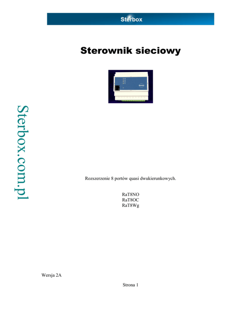 Sterownik sieciowy Sterbox.com.pl Rozszerzenie 8 portów quasi dwukierunkowych. RaT8NO RaT8OC RaT8Wg Wersja 2A Strona 1 Autor Z.Czujewicz Sterbox.com.pl Strona 2 Spis treści 1. Na skróty.............................................................................................................................3 2. Wersje modułów dodatkowych portów cyfrowych............................................................3 3. Ustawienie adresu modułu..................................................................................................3 4. Sposób podłączenia.............................................................................................................4 5. Jak użyć?.............................................................................................................................5 Sterbox.com.pl Strona 3 Instrukcja dotyczy modułu dodatkowych portów cyfrowych do Sterbox. Na wstępie należy zaznaczyć są to porty quasi dwukierunkowe, czyli mogą być użyte jako wejścia lub wyjścia. 1. Na skróty. 1. Wyłącz zasilanie sterownika Sterbox. 2. W module RaT ustaw adres przy pomocy zwory. Zobacz jak ustawić zworę w punkcie 2 niniejszej instrukcji. 3. W obudowie sterownika Sterbox, z lewej strony jest gniazdo 4 stykowe do dodatkowych akcesorii. Takie samo gniazdo jest w module. 4. Użyj przewodu aby połączyć masę Sterboxa i modułu RaT, oznaczone w złączach literą G. 5. Połącz powyższe gniazda kołkami stykowymi, zsuwając urządzenia do siebie. 6. Włącz zasilanie. Porty w module otrzymują nazwy od ww8 do wwF, dla modułu pierwszego i wwG do wwN dla modułu drugiego. Sterbox.com.pl 2. Wersje modułów dodatkowych portów cyfrowych. Możliwe są następujące wersje urządzenia. Poniższe oznaczenia dla modułu w obudowie na szynę TS35. Oznaczenie Wejścia Wyjścia RaT8Wg 8 Wejść z galwanicznie połączoną masą. Brak RaT8OC1 8 Wejść z galwanicznie połączoną masą. 8 Wyjść typu open collector (OC) 200mA 12VDC. RaT8NO2 8 Wejść z galwanicznie połączoną masą. 8 Wyjść typu open collector (OC) 200mA 12VDC i 8 wyjść przekaźnikowych o stykach normalnie otwartych – NO.3 3. Ustawienie adresu modułu. Zworka Z1 (umieszczenie zwory pokazane jest na rysunku niżej) powinna dla wejść o nazwach ww8 do wwF pozostać zwarta. Dla drugiego modułu RaT należy ją zdjąć, wtedy moduł będzie obsługiwał porty od wwG do wwN. Widok od strony złącza 16 stykowego TBMF3816R. Zwora Z1 pierwsza od lewej. 1 Wejścia i wyjścia korzystają z tych samych końcówek. Oznacza to że można je wykorzystać jako wejście lub jako wyjście → zależnie od ustawień! 2 Jak wyżej. 3 Nie oznacza to 16 wyjść, tylko to że wyprowadzone są wyjścia kolektora tranzystora który steruje cewką przekaźnika. Strona 4 4. Sposób podłączenia. U góry na złączu 16 stykowym TBMF3816R wyprowadzone wejścia i wyjścia OC. Gniazda „zas” nie są montowane. Podłączenie masy i zasilania +12V ze sterownika. Zworka Z1 słuzy do adresowania modułu. Dla zakresu ww8 do wwF powinna być zwarta. U dołu podłączone zestyki przekaźników o parametrach 4A/ 230V. Proszę zwrócic uwagę na pogrupowanie przekaźników po dwie sztuki i wyprowadzenie jednej strony końcówek zestyków grupy przekaźników na wspólny styk gniazda TBMF5112R. Proszę przy zamówieniach pamiętać o zamówieniu wtyków TBMF3816R i ewentualnie TBMF5112R. Powyższy rysunek pokazuje podłączenia dla wersji RaTNO. Gdy posiadamy moduł tylko z wejściami (RaT8Wg) lub z wyjściami OC: RaT8OC montowane jest jest złącze do wtyku TBMF3816R, brak złącza 12 stykowego. Nr Nazwa Pełniona rola styku 3 G Masa zasilania, należy połączyć z masą zasilania i masą (G) sterownika Sterbox (również z masą następnego modułu RaT (o ile jest). 4 +Z Zasilanie modułu RaT. Można lecz nie ma konieczności podłączania przewodem. Zasilanie prowadzone jest złączem czterostykowym z boku urządzeń. 5 R7 W module o ustawionym adresie 1 port → wwF, adresie 2 port → wwN. 6 R6 W module o ustawionym adresie 1 port → wwE, adresie 2 port → wwM. 7 R5 W module o ustawionym adresie 1 port → wwD, adresie 2 port → wwL. 8 R4 W module o ustawionym adresie 1 port → wwC, adresie 2 port → wwK. 9 G Tak jak dla złącza o numerze 4. Wewnątrz urządzenia oba styki są galwanicznie połączone. Strona 5 10 R3 W module o ustawionym adresie 1 port → wwB, adresie 2 port → wwJ. 11 R2 W module o ustawionym adresie 1 port → wwA, adresie 2 port → wwI. 12 R1 W module o ustawionym adresie 1 port → ww9, adresie 2 port → wwH. 13 R0 W module o ustawionym adresie 1 port → ww8, adresie 2 port → wwG. 5. Jak użyć? W celu podłączenia modułu do sterownika, należy wyłączyć zasilanie. UWAGA: gorąco zalecamy wyłączanie zasilacza urządzenia przed wyjęciem lub włożeniem wtyków! Po włożeniu wtyku do gniazda sprawdzamy jego prawidłowe włożenie i dopiero wtedy włączamy zasilanie. Oczywiście przewody podłączamy również przy całkowicie wyłączonym zasilaniu! Po lewej stronie sterownika znajduje się gniazdo które łączymy z gniazdem modułu kołkami stykowymi (w komplecie). Urządzenia zsuwamy ze sobą. Włączamy zasilanie. Porty modułu przyjmują nazwy od ww8 do wwF dla modułu 1 i wwG do wwN dla modułu 2. Pamiętajmy o tym że jest to moduł o 8 portach. Są to porty które zasadniczo można wykorzystać jako wejścia lub jako wyjścia. Sposób podłączania do portów wyjaśniony jest w instrukcji „Sterbox” opisującej sterownik. Moduł posiada ze swojej lewej strony złącze analogiczne jak po prawej. Służy ono do podłączania następnych modułów rozszerzających. Moduł nie posiada sygnalizacji świetlnej stanu wyjść. Parametry: 1 Zasilanie 12VDC realizowane ze sterownika. Pobierany prąd do 300mA. 2 Wejścia galwaniczne (8Wg) wewnętrznie podciągane do +12V. Przeznaczone do zestyków podłączonych do masy, wyjść typu OC lub wyjść na których 