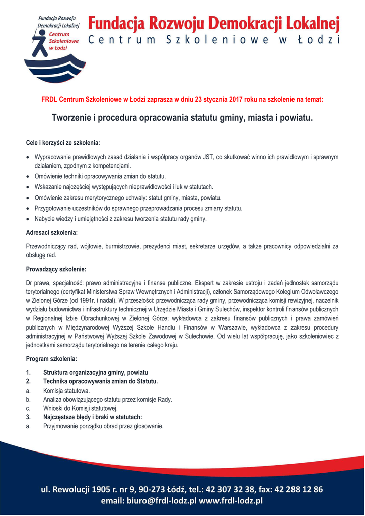 FRDL Centrum Szkoleniowe w Łodzi zaprasza w dniu 23 stycznia 2017 roku na szkolenie na temat: Tworzenie i procedura opracowania statutu gminy, miasta i powiatu. Cele i korzyści ze szkolenia: Wypracowanie prawidłowych zasad działania i współpracy organów JST, co skutkować winno ich prawidłowym i sprawnym działaniem, zgodnym z kompetencjami. Omówienie techniki opracowywania zmian do statutu. Wskazanie najczęściej występujących nieprawidłowości i luk w statutach. Omówienie zakresu merytorycznego uchwały: statut gminy, miasta, powiatu. Przygotowanie uczestników do sprawnego przeprowadzania procesu zmiany statutu. Nabycie wiedzy i umiejętności z zakresu tworzenia statutu rady gminy. Adresaci szkolenia: Przewodniczący rad, wójtowie, burmistrzowie, prezydenci miast, sekretarze urzędów, a także pracownicy odpowiedzialni za obsługę rad. Prowadzący szkolenie: Dr prawa, specjalność: prawo administracyjne i finanse publiczne. Ekspert w zakresie ustroju i zadań jednostek samorządu terytorialnego (certyfikat Ministerstwa Spraw Wewnętrznych i Administracji), członek Samorządowego Kolegium Odwoławczego w Zielonej Górze (od 1991r. i nadal). W przeszłości: przewodnicząca rady gminy, przewodnicząca komisji rewizyjnej, naczelnik wydziału budownictwa i infrastruktury technicznej w Urzędzie Miasta i Gminy Sulechów, inspektor kontroli finansów publicznych w Regionalnej Izbie Obrachunkowej w Zielonej Górze; wykładowca z zakresu finansów publicznych i prawa zamówień publicznych w Międzynarodowej Wyższej Szkole Handlu i Finansów w Warszawie, wykładowca z zakresu procedury administracyjnej w Państwowej Wyższej Szkole Zawodowej w Sulechowie. Od wielu lat współpracuję, jako szkoleniowiec z jednostkami samorządu terytorialnego na terenie całego kraju. Program szkolenia: 1. 2. a. b. c. 3. a. Struktura organizacyjna gminy, powiatu Technika opracowywania zmian do Statutu. Komisja statutowa. Analiza obowiązującego statutu przez komisje Rady. Wnioski do Komisji statutowej. Najczęstsze błędy i braki w statutach: Przyjmowanie porządku obrad przez głosowanie. ul. Rewolucji 1905 r. nr 9, 90-273 Łódź, tel.: 42 632 63 19, fax: 42 288 12 86 email: [email protected] www.frdl-lodz.pl b. c. d. e. f. g. h. i. 4. Przyjmowanie protokołu z poprzedniej sesji poprzez głosowanie. Dopuszczanie mieszkańców do głosu podczas sesji rady. Regulacje dotyczące protokołowania posiedzeń rady i komisji. Brak procedur dostępu radnych do informacji źródłowych. Brak procedur „inicjatywy uchwałodawczej” (czyli jak wygląda droga od pomysłu do realizacji). Brak procedur rozpatrywania przez radę skarg na organy. Brak definicji interpelacji i postępowania związanego z udzieloną przez organ pisemną odpowiedzią. Procedura przeprowadzania kontroli organu wykonawczego (uchwała w/s wniosków i zaleceń pokontrolnych). Procedura wprowadzania zmian w statucie rady gminy (miasta, powiatu). ul. Rewolucji 1905 r. nr 9, 90-273 Łódź, tel.: 42 632 63 19, fax: 42 288 12 86 email: [email protected] www.frdl-lodz.pl Informacje organizacyjne i warunki zgłoszeń: Szkolenie odbędzie się w siedzibie FRDL Centrum Szkoleniowego w Łodzi, ul. Rewolucji 1905 roku nr 9, II PIĘTRO (DOMOFON NR 36) 23 stycznia 2017 r. w godzinach 10.00 – 15.00. Cena szkolenia wynosi 319 zł netto przy zgłoszeniu do 11 stycznia. Cena po 11 stycznia wynosi 359 zł netto. RABAT 10% dla drugiej i następnej osoby z tej samej instytucji. Zwolnione z VAT w przypadku finansowania ze środków publicznych. W cenie szkolenia materiały szkoleniowe, zaświadczenie, lunch oraz przerwy kawowe. Płatność przelewem na podstawie wystawionej faktury w dniu szkolenia. Prosimy o przesyłanie zgłoszeń 17 stycznia 2017 r. na adres mailowy [email protected] wysyłając uzupełnioną kartę zgłoszenia faksem na numer wysyłając uzupełnioną kartę zgłoszenia 42 / 288 12 86 przez formularz elektroniczny zamieszczony na www.frdl-lodz.pl Szkolenia realizujemy również w formie zamkniętej na terenie instytucji. Zapytania prosimy kierować na adres mailowy [email protected] Zgłoszenie na szkolenie nt.: Tworzenie i procedura opracowania statutu gminy, miasta i powiatu. w dniu 23 stycznia 2017 r. Instytucja (dane do faktury) ……………………………………………………………………………………………………………………………………………………………….. Adres: ....................................................................................................................................................... Tel: ...................................................................................................................... NIP: ..................................................................................... E-mail: ....................................................................................................................... Osoby delegowane do udziału w szkoleniu (prosimy o podanie imienia i nazwiska oraz stanowiska uczestnika szkolenia): 1. .................................................................................................................................................................................................................................................................... 2. .................................................................................................................................................................................................................................................................... 3. .................................................................................................................................................................................................................................................................... Oświadczam, że szkolenie dla ww. pracowników jest kształceniem zawodowym finansowanym w całości lub co najmniej 70% ze 