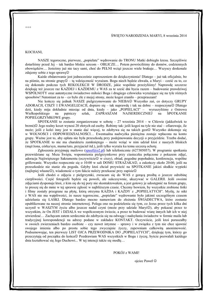 +++ ŚWIĘTO NARODZENIA MARYI, 8 września 2014 KOCHANI, NASZE tegoroczne, pierwsze, „popielate” wędrowanie do TRONU Matki dobiegło kresu. Szczęśliwie dotarliśmy przed Jej – tak bardzo bliskie sercom – OBLICZE… Potem powróciliśmy do domów, codziennych obowiązków… Jesteśmy już nie tacy sami, choć do PEŁNI wciąż jeszcze wiele brakuje… Wszyscy doskonale zdajemy sobie z tego sprawę☺ Każde obdarowanie jest jednocześnie zaproszeniem do dziękczynienia! Dlatego – już tak oficjalnie, bo na piśmie, na stronie grupy☺ – tą wdzięczność wyrażam. Bogu niech będzie chwała, a Maryi – cześć za to, co się dokonało podczas tych REKOLEKCJI W DRODZE, jakie wspólnie przeżyliśmy! Naprawdę szczerze dziękuję też jeszcze raz KAŻDEJ i KAŻDEMU z WAS za te sześć dni bycia razem – budowanie prawdziwej WSPÓLNOTY oraz autentyczne świadectwo miłości Boga i drugiego człowieka wyrażające się na tyle różnych sposobów! Natomiast za to – co było złe z mojej strony, może kogoś zraniło – przepraszam! Nie kończy się jednak NASZE pielgrzymowanie do NIEBA☺ Wszystko zaś, co dotyczy GRUPY ADORACJI, CISZY I EWANGELIZACJI, dopiero się – tak naprawdę i tak na dobre – rozpoczyna☺ Dlatego dziś, kiedy mija dokładnie miesiąc od dnia, kiedy – jako „POPIELACI” – wyruszyliśmy z Ostrowa Wielkopolskiego na pątniczy szlak, ZAPRASZAM NAJSERDECZNIEJ na SPOTKANIE POPIELGRZYMKOWE grupy. SPOTKANIE to zostanie zorganizowane w sobotę – 27 września 2014 – w Chlewie (jakkolwiek to brzmi)☺ Jego realny koszt wynosi 20 złotych od osoby. Robimy tak: jeśli kogoś na tyle nie stać – ofiarowuje, ile może; jeśli z kolei inny jest w stanie dać więcej, to zdobywa się na takich gest☺ Wszystko dokonuje się w WOLNOŚCI i ODPOWIEDZIALNOŚCI… Ewentualna nadwyżka pieniężna zostaje wpłacona na konto grupy. Ważne jest to, aby opłata nie była przeszkodą przy podejmowaniu decyzji o przyjeździe. Trzeba dodać, że SPOTKANIE to nie ma charakteru zamkniętego – może wziąć w nim udział ktoś z naszych bliskich (mąż/żona, córka/syn, mama/tato, przyjaciel itd.), jeśli tylko wyraża ku temu szczerą ochotę. Zgłoszenia przyjmuję mailowo ([email protected]) lub telefonicznie (627305057). W programie spotkania przewidziane są: Msza Święta, wspomnienia pielgrzymkowe przy ciasteczku połączone z pokazem zdjęć, adoracja Najświętszego Sakramentu (oczywiście☺ w ciszy), obiad, pogodne popołudnie, konferencja, wspólne grillowanie. Wszystko rozpocznie się o 10:00 w sali DOMU STRAŻAKA☺, a zakończy około 20:00, jeśli na przeszkodzie nie stanie zła pogoda. Gdyby ktoś chciał przywieźć na SPOTKANIE jakieś słodkie wypieki (najlepiej własne☺), wiadomość o tym fakcie należy przekazać przy zapisie☺ Jeśli chodzi o zdjęcia z pielgrzymki, zwracam się do WAS z gorącą prośbą o jeszcze odrobinę cierpliwości. Część fotografii będzie się powoli, ale sukcesywnie, ukazywać w GALERII. Jeśli swoimi zdjęciami dysponuje ktoś, z kim się do tej pory nie skontaktowałem, a jest gotowy je udostępnić na forum grupy, to proszę się do mnie w tej sprawie zgłosić w najbliższym czasie. Chcemy bowiem, by wszystkie zrobione fotki i filmy zostały przegrane na płytę, którą otrzyma KAŻDA i KAŻDY z „POPIELATYCH”. Myślę, że nikt z WAS nie ma wątpliwości, że nasze tegoroczne, „popielate” wędrowanie było jakimś szczególnym czasem udzielania się ŁASKI. Dlatego bardzo mocno namawiam do złożenia ŚWIADECTWA, które zostanie opublikowane na naszej stronie internetowej. Polega ono na podzieleniu się tym, co Jezus przez tych kilka dni uczynił w WASZYM życiu albo jeszcze nadal czyni (może przy udziale Maryi☺), aby pokazać przez to wszystkim, że On JEST i DZIAŁA we współczesnym świecie, a przez to budować wiarę innych lub ich w niej utwierdzać… Zachęcam zatem serdecznie do zdobycia się na odwagę i nadsyłania świadectw w formie maila lub tradycyjnej korespondencji na adresy podane w zakładce KONTAKT. Oczywiście, jeśli ktoś poruszałby w swoich zwierzeniach bardzo osobiste – czy nawet intymne – sprawy i w związku z tym nie chce ujawnić swojego imienia albo po prostu sobie tego zwyczajnie życzy, zapewniam całkowitą anonimowość. Podsumowując, ten pierwszy LIST OJCA PRZEWODNIKA DO „POPIELATYCH”, dziękuję tym, którzy go przeczytają od początku do końca☺ Pozdrawiam WAS wszystkich w Bogu i życzę, byście pozwalali każdego dnia kształtować się Jego Duchowi... W tej intencji także się modlę… POKÓJ z WAMI! ojciec Paweł ☺