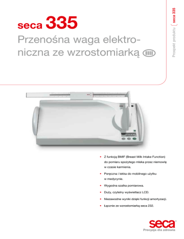 • Z funkcją BMIF (Breast Milk Intake Function) do pomiaru spożytego mleka przez niemowlę w czasie karmienia. • Poręczna i lekka do mobilnego użytku w medycynie. • Wygodna szalka pomiarowa. • Duży, czytelny wyświetlacz LCD. • Niezawodne wyniki dzięki funkcji amortyzacji. • Łącznie ze wzrostomiarką seca 232. seca 335 Prospekt produktu 335 seca Przenośna waga elektroniczna ze wzrostomiarką N seca 335 Prospekt produktu seca 335: Niemowlęca waga do mobilnego użytku z funkcją amortyzacji ruchów. owoczesne technologie przydają się tylko wtedy, jeżeli zdają egzamin w życiu codziennym. Elektroniczną wagę dla niemowląt seca 335 wyposażono we wszystkie niezbędne detale, ułatwiające codzienne obowiązki w gabinetach lekarskich i szpitalach: jest ona prosta w obsłudze, przenośna i trwała, a jednocześnie spełnia wszystkie wymogi stawiane idealnej wadze stosowanej w pediatrii. Poręczna, lekka i przenośna waga stosowana w placówkach służby zdrowia. Duża szalka oraz czytelny wyświetlacz LCD gwarantują wygodę obsługi. Automatyczna amortyzacja to wiarygodne wyniki ważenia. Masa własna urządzenia wynosi tylko 2,8 kg, Dużo miejsca dla wygody – w dużej i wygod- Stuprocentowa precyzja w każdej sytuacji: wagi lekkiej w swojej klasie. Umieszczony z pieczne. Większe niemowlęta i mniejsze dzieci amortyzacja firmy seca sprawiają, że wysoki co sprawia, że jest ono prawdziwym liderem boku uchwyt ułatwia transport. Inne praktyczne cechy: waga jest płaska, a więc zajmuje niewiele miejsca, można ją np. przechowywać w szufla- dzie stołu do przewijania. Jako opcję można na- być torbę seca 428, która umożliwia bezpieczne przechowywanie wagi w czasie podróży. nej szalce wagi seca 335 niemowlę jest bez- można ważyć w pozycji siedzącej. Zmierzona wartość pojawia się na jasnym wyświetlaczu LCD i pozostaje na nim przez dwie minuty. Automatyczne wyłączanie to gwarancja bardzo czuła technologia ważenia i specjalna poziom dokładności pomiarów to w przypadku wagi seca 335 oczywistość. Nawet jeśli niemowlęta są niespokojne. Breast-Milk-Intake pomaga w określeniu ilości Opcjonalnie ze wzrostomiarką 232. karmienia. Naciśnięcie przycisku pozwala Po zamontowaniu załączonej wzrostomiarki i następnie odjąć ją od aktualnej wagi uzyska- utworzona zostaje kompaktowa stacja do energooszczędnej pracy urządzenia. Funkcja mleka wypitego przez niemowlę podczas zapisać wagę niemowlęcia przed karmieniem nej przy ponownym ważeniu. seca 232 do wagi dla niemowląt seca 335 pomiaru masy i długości ciała niemowląt. seca 335 Dane techniczne • Nośność: 15 kg • Wymiary (szer. x wys. x gł.): Zastrzegamy sobie prawo do zmian. • Załączona wzrostomiarka umożliwia jednoczesne ważenie i mierzenie niemowląt. • • • • • 201133517015 • Podziałka: 10 g < 10 kg > 20 g 638 x 105 x 300 mm Wymiary powierzchni wagowej (szer. x wys. x gł.): 595 x 50 x 255 mm Waga własna: 2,8 kg Zasilanie: baterie, zasilacz opcjonalnie Funkcje: TARA, BMIF, HOLD, automatyczne wyłączanie Łącznie ze wzrostomiarką seca 232, opcjonalnie: pozycjoner głowy seca 419, zasilacz seca 447, torba transportowa seca 428 Klasa dokładności: seca gmbh & co. kg • Hammer Steindamm 9 – 25 • 22089 Hamburg • Niemcy • Telefon +48 22 6570 441 • Faks +48 22 6570 426 • [email protected] • www.seca.com