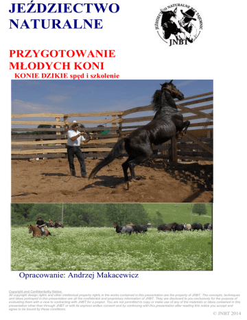 JEŹDZIECTWO NATURALNE PRZYGOTOWANIE MŁODYCH KONI KONIE DZIKIE spęd i szkolenie Opracowanie: Andrzej Makacewicz Copyright and Confidentiality Notice All copyright design rights and other intellectual property rights in the works contained in this presentation are the property of JNBT. The concepts, techniques and ideas portrayed in this presentation are all the confidential and proprietary information of JNBT. They are disclosed to you exclusively for the purpose of evaluating them with a view to contracting with JNBT for a project. You are not permitted to copy or make use of any of the materials or ideas contained in this presentation other than through JNBT or with its express written consent and by continuing with this presentation after reading this notice you accept and agree to be bound by these conditions. © JNBT 2014 „Jeździectwo Naturalne bez Tajemnic ” Przygotowanie Młodych Koni-Konie Dzikie Termin: 19.06-22.06.2014 Lokalizacja: ośrodek Ul, Ostrowice, k. Połczyn Zdrój i Drawsko Pomorskie, ZachodnioPomorskie; tel 662095085, www.ul.net.pl Program Przygotowanie Młodych Koni – Konie Dzikie jest częścią specjalizowanego szkolenia w ramach kompleksowego programu „Jeździectwo Naturalne bez Tajemnic”, który oprócz szkoleń specjalizowanych ma program podstawowy podzielony na 5 poziomów Relations L1, L2, L3 oraz L4 Wolność i L5 Harmonia. Szkolenie to jest unikalne ze względu na możliwość udziału w pracy z końmi dzikimi ze stada ponad 360 szt. Szkolenie (przyjazd możliwy środa 28.06) jest podzielone na 2 części i można brać udział niezależnie w spędzie (jeden dzień czwartek) lub szkoleniu w zajeżdżaniu (3 dni): 1. 19.06 czwartek (święto) spęd pod siodłem (na koniu własnym lub z ośrodka) stada i sortowanie. Cały dzień pracy z końmi polegający na spędzie pod siodłem stada koni, ich sortowaniu oraz przepędzie koni wracających na wolność. Można dowieźć własnego konia lub wynająć konia z ośrodka. Jest to wyjatkowa przygoda, adrenalina ale i nauka bo to wyjatkowa okazja wjeżdżać konno w srodek dzikiego stada koni i starac się nad nimi zapanować. Naszym zadaniem będzie spędzenie i wyselekcjonowanie młodych koni do zajeżdżenia. Zdjęcia z lat ubiegłych znajdziecie tu https://www.facebook.com/media/set/?set=a.619099234768967.1073741849.172996769379218&type=1 2. 20.06-22.06 3 dni kursu od piątku godz 9.00 do niedzieli godz 17.00. Zgłoszone osoby chętne do pracy z końmi oraz trenerzy pracować będą równolegle w 3 roundpenach (sesje poranna i popołudniowa) z wyselekcjonowanymi dzikimi końmi lub dowiezionymi młodymi końmi. Zdjęcia z lat ubiegłych tu https://www.facebook.com/media/set/?set=a.621208041224753.1073741850.172996769379218&type=1 Program kursu obejmuje wykłady z teorii jeździectwa naturalnego wraz z projekcjami multimedialnymi oraz praktykę w roundpenie a także obserwacje największego w Europie stada zdziczałych koni. Program oparty jest o najnowsze osiągnięcia dotyczące behawioryzmu oraz treningu naturalnego łącząc nurty kilku największych szkół jeździectwa naturalnego. Daje on gruntowne podstawy teoretyczne i praktyczne zastosowania metod naturalnych w zajeżdżaniu młodych koni budując od razu prawidłowe relacje koń/trener/jeździec do pierwszego siodłania. Obejmuje zagadnienia z zakresu psychologii koni, behawioryzmu, budowania zaufania i przywództwa, nauki czytania koni, systemu komunikacji za pomocą języka Equus, technik pierwszego siodłania i pierwszego wsiadania, objeżdżania, oswajania z kantarem i wędzidłem, odczulania, bezpieczeństwa. Prowadzi do zaawansowanej wiedzy pozwalającej zajeżdżać młode konie metodami naturalnymi w ciągu kilku sesji. W szkoleniu można uczestniczyć: 1.Jako uczestnik w spędzie na koniu własnym lub z ośrodka 2. Jako uczestnik w pracy z koniem pracując pod nadzorem wykładowców w roundpenie z dzikim odłowionym koniem lub młodym dowiezionym 3. Jako słuchacz uczestnicząc jako obserwator w wykładach i pracy na roundpenie oraz pracując w grupie przy selekcji dzikich koni Koszt uczestnictwa: 1. 19.06 spęd 350 zł (plus wynajem konia z ośrodka) 2. 20.06-22.06 uczestnik w pracy z koniem 750 zł /kurs trzydniowy 3. słuchacz 360 zł/kurs trzydniowy Studenci z certyfikatami programu JNBT odpowiednio niżej 1) 300 zł 2) 700 zł i b) 320 zł Ośrodek agroturystyczny Ul jest rozłożony na kilku tysiącach hektarów w pięknej, dzikiej, pagórkowatej i pełnej jezior okolicy jeziora Sicino. Jest jednym z niewielu w Polsce ośrodków hodujących dziko tabun ponad 360 koni co daje niezwykłą możliwość obserwacji i nauki szkolenia na dzikich zwierzętach. Ośrodek posiada kilkanaście pokoi gościnnych oraz wyżywienie. Osoba do kontaktu w sprawie rezerwacji pobytu p Marek tel 662095085. Ilość uczestników spędu bez ograniczeń a uczestników kursu z koniem ograniczona. Wykłady prowadzi w języku polskim wykładowca Andrzej Makacewicz oraz wykładowcy JNBT. Osoby biorące udział z końmi muszą okazać ubezpieczenie NW oraz posiadać kask. Praca osób z końmi jest rejestrowana filmowo. Kurs kończy się wydaniem imiennego certyfikatu. Uczestnicy otrzymują też materiały w postaci skryptu. Zgłoszenia przyjmowane są pod telefonem 22 3931090 lub [email protected] JNBT 2014 (fot K. Jarczewski, JNBT)