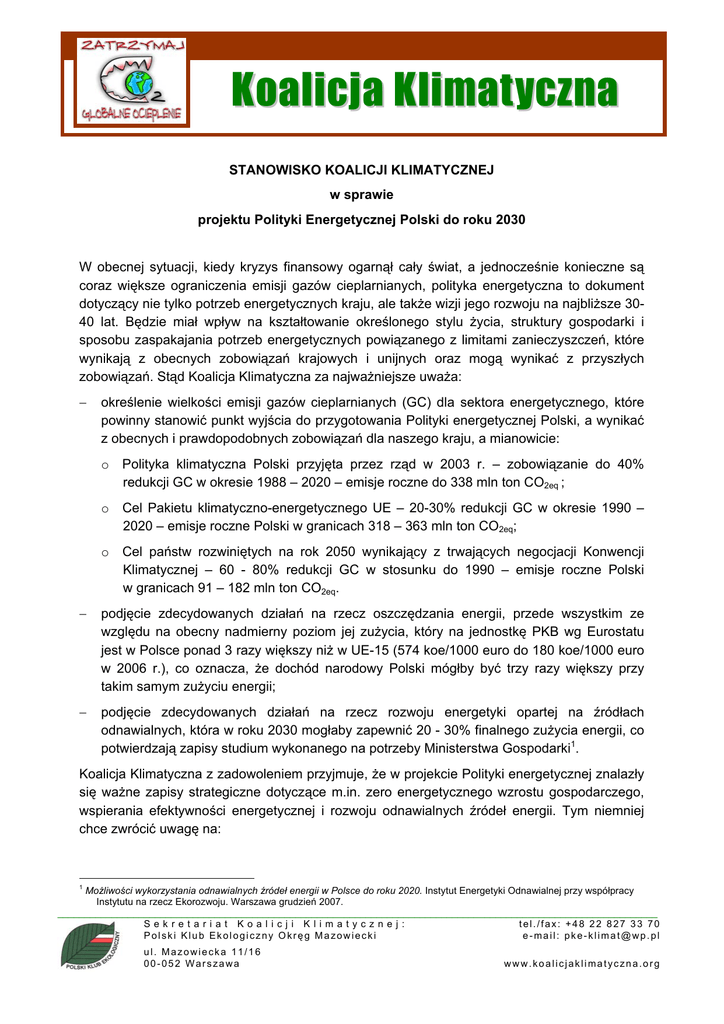 Koalicja Klimat yczna STANOWISKO KOALICJI KLIMATYCZNEJ w sprawie projektu Polityki Energetycznej Polski do roku 2030 W obecnej sytuacji, kiedy kryzys finansowy ogarnął cały świat, a jednocześnie konieczne są coraz większe ograniczenia emisji gazów cieplarnianych, polityka energetyczna to dokument dotyczący nie tylko potrzeb energetycznych kraju, ale także wizji jego rozwoju na najbliższe 3040 lat. Będzie miał wpływ na kształtowanie określonego stylu życia, struktury gospodarki i sposobu zaspakajania potrzeb energetycznych powiązanego z limitami zanieczyszczeń, które wynikają z obecnych zobowiązań krajowych i unijnych oraz mogą wynikać z przyszłych zobowiązań. Stąd Koalicja Klimatyczna za najważniejsze uważa: − określenie wielkości emisji gazów cieplarnianych (GC) dla sektora energetycznego, które powinny stanowić punkt wyjścia do przygotowania Polityki energetycznej Polski, a wynikać z obecnych i prawdopodobnych zobowiązań dla naszego kraju, a mianowicie: o Polityka klimatyczna Polski przyjęta przez rząd w 2003 r. – zobowiązanie do 40% redukcji GC w okresie 1988 – 2020 – emisje roczne do 338 mln ton CO2eq ; o Cel Pakietu klimatyczno-energetycznego UE – 20-30% redukcji GC w okresie 1990 – 2020 – emisje roczne Polski w granicach 318 – 363 mln ton CO2eq; o Cel państw rozwiniętych na rok 2050 wynikający z trwających negocjacji Konwencji Klimatycznej – 60 - 80% redukcji GC w stosunku do 1990 – emisje roczne Polski w granicach 91 – 182 mln ton CO2eq. − podjęcie zdecydowanych działań na rzecz oszczędzania energii, przede wszystkim ze względu na obecny nadmierny poziom jej zużycia, który na jednostkę PKB wg Eurostatu jest w Polsce ponad 3 razy większy niż w UE-15 (574 koe/1000 euro do 180 koe/1000 euro w 2006 r.), co oznacza, że dochód narodowy Polski mógłby być trzy razy większy przy takim samym zużyciu energii; − podjęcie zdecydowanych działań na rzecz rozwoju energetyki opartej na źródłach odnawialnych, która w roku 2030 mogłaby zapewnić 20 - 30% finalnego zużycia energii, co potwierdzają zapisy studium wykonanego na potrzeby Ministerstwa Gospodarki1. Koalicja Klimatyczna z zadowoleniem przyjmuje, że w projekcie Polityki energetycznej znalazły się ważne zapisy strategiczne dotyczące m.in. zero energetycznego wzrostu gospodarczego, wspierania efektywności energetycznej i rozwoju odnawialnych źródeł energii. Tym niemniej chce zwrócić uwagę na: 1 Możliwości wykorzystania odnawialnych źródeł energii w Polsce do roku 2020. Instytut Energetyki Odnawialnej przy współpracy Instytutu na rzecz Ekorozwoju. Warszawa grudzień 2007. _______________________________________________________________________________________________________________ Sekretariat Koalicji Klimatycznej: tel./fax: +48 22 827 33 70 Polski Klub Ekologiczny Okręg Mazowiecki e-mail: [email protected] ul. Mazowiecka 11/16 00-052 Warszawa www.koalicjaklimatyczna.org 1. Występowanie zasadniczych sprzeczności pomiędzy zapisami projektu Polityki i załącznika nr 2 do tego dokumentu, dotyczącymi prognozy zapotrzebowania na paliwa i energię do roku 2030, w zakresie: a. Celu strategicznego – w Polityce zadeklarowany jest wzrost zero energetyczny, podczas gdy w załączniku do niej przewiduje się do roku 2030 wzrost zapotrzebowania na energię o 21%. Patrz rysunek poniżej. 140 120 100 80 60 40 20 0 2006 2010 2015 2020 2025 2030 Zapotrzebowanie na energię pierwotną Zapotrzebowanie na energię finalną Rys. 1 Zapotrzebowanie na energię 2006 - 2030 (Mtoe) wg projektu Polityki energetycznej Polski do 2030 r. b) Skali rozwoju energetyki odnawialnej (OZE) – w załączniku do Polityki stwierdza się, że osiągnięcie 20% udziału OZE w energii finalnej do roku 2030 nie będzie możliwe. Wg Raportu: [R]ewolucja energetyczna dla Polski w 2030 r., udział OZE w pokryciu zapotrzebowania na energię końcową w Polsce może wynieść 28%2. Projekt Ministerstwa Gospodarki przewiduje zwiększenie udziału OZE w zużyciu końcowym energii do 15% w 2020 i jedynie 16% w 2030. Analizując projekt Polityki energetycznej można odnieść wrażenie, że rząd zamierza sztucznie wyhamować rozwój energetyki odnawialnej w okresie po roku 2020. Ponadto omawiany projekt nadal nie zawiera jasnej wizji systemowego wsparcia dla rozwoju OZE. Choć dotychczasowy system okazał się nieefektywny i nie dał wystarczającego bodźca do intensywnego rozwoju energetyki opartej na źródłach odnawialnych, projekt nie przewiduje jego rewizji. c) Tempa osiągnięcia poziomu efektywności energetycznej gospodarki odpowiadającego średniemu poziomowi efektywności krajów UE15 z 2005 r. – założono, że poziom ten zostanie osiągnięty dopiero w roku 2030. Trudno to uznać za cel zadowalający, 2 Raport [R]ewolucja energetyczna. Scenariusz zaopatrzenia Polski w czyste nośniki energii w perspektywie długookresowej. EC BREC Instytut Energetyki Odnawialnej, Instytut Technicznej Termodynamiki w niemieckim Centrum Przestrzeni Kosmicznej. 2008. _______________________________________________________________________________________________________________ Sekretariat Koalicji Klimatycznej: tel./fax: +48 22 827 33 70 Polski Klub Ekologiczny Okręg Mazowiecki e-mail: [email protected] ul. Mazowiecka 11/16 00-052 Warszawa www.koalicjaklimatyczna.org zwłaszcza, że przez 21 lat UE15 znacznie poprawi tą efektywność. Zastrzeżenia Koalicji Klimatycznej budzi fakt, że w projekcie Polityki nie określono narodowego celu efektywności energetycznej. Sytuacja w zakresie efektywności energetycznej jest klasycznym przykładem rozmijania się deklaracji zawartych w wystąpieniach polityków i dokumentach strategicznych, a rzeczywistymi działaniami, które są podejmowane przez agendy rządowe. Tak jak już to wcześniej wskazano, zdaniem Koalicji Klimatycznej potrzebny jest krytyczny przegląd aktualnych instrumentów i zaprojektowanie nowych, stosownie d