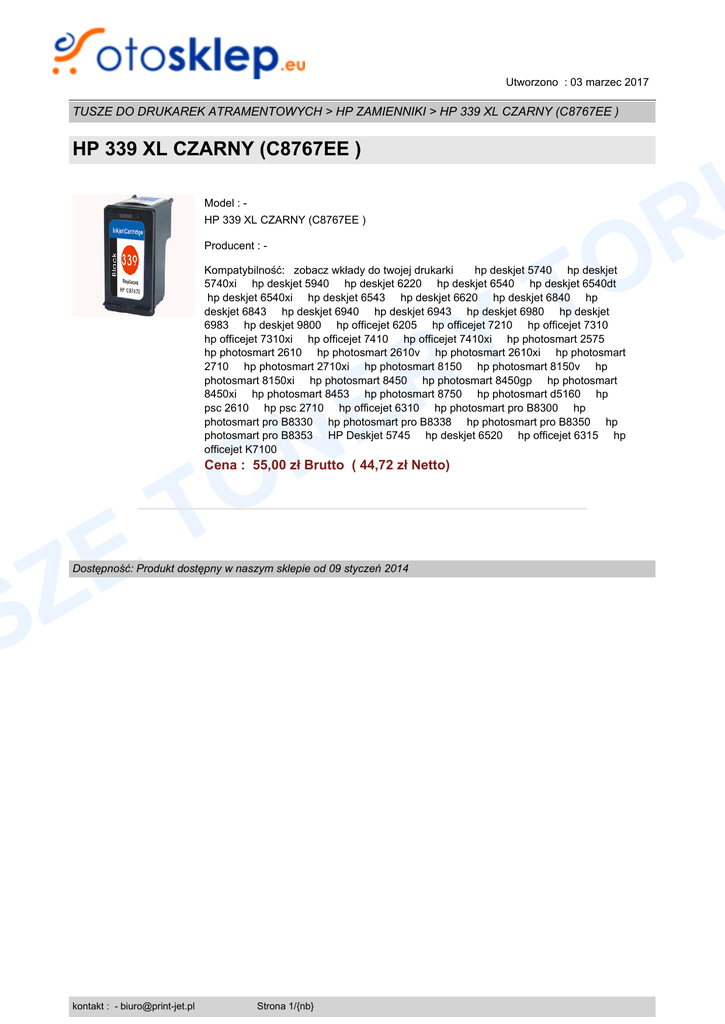 S Utworzono : 03 marzec 2017 TUSZE DO DRUKAREK ATRAMENTOWYCH > HP ZAMIENNIKI > HP 339 XL CZARNY (C8767EE ) HP 339 XL CZARNY (C8767EE ) R O Model : HP 339 XL CZARNY (C8767EE ) Producent : - T Y Kompatybilność: zobacz wkłady do twojej drukarki hp deskjet 5740 hp deskjet 5740xi hp deskjet 5940 hp deskjet 6220 hp deskjet 6540 hp deskjet 6540dt hp deskjet 6540xi hp deskjet 6543 hp deskjet 6620 hp deskjet 6840 hp deskjet 6843 hp deskjet 6940 hp deskjet 6943 hp deskjet 6980 hp deskjet 6983 hp deskjet 9800 hp officejet 6205 hp officejet 7210 hp officejet 7310 hp officejet 7310xi hp officejet 7410 hp officejet 7410xi hp photosmart 2575 hp photosmart 2610 hp photosmart 2610v hp photosmart 2610xi hp photosmart 2710 hp photosmart 2710xi hp photosmart 8150 hp photosmart 8150v hp photosmart 8150xi hp photosmart 8450 hp photosmart 8450gp hp photosmart 8450xi hp photosmart 8453 hp photosmart 8750 hp photosmart d5160 hp psc 2610 hp psc 2710 hp officejet 6310 hp photosmart pro B8300 hp photosmart pro B8330 hp photosmart pro B8338 hp photosmart pro B8350 hp photosmart pro B8353 HP Deskjet 5745 hp deskjet 6520 hp officejet 6315 hp officejet K7100 R E N O T Cena : 55,00 zł Brutto ( 44,72 zł Netto) E Z Dostępność: Produkt dostępny w naszym sklepie od 09 styczeń 2014 kontakt : - [email protected] Strona 1/{nb}
