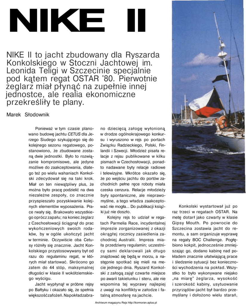 NIKE II NIKE II to jacht zbudowany dla Ryszarda Konkolskiego w Stoczni Jachtowej im. Leonida Teligi w Szczecinie specjalnie pod kątem regat OSTAR '80. Pierwotnie żeglarz miał płynąć na zupełnie innej jednostce, ale realia ekonomiczne przekreśliły te plany. Marek Słodownik Ponieważ w tym czasie planowano budowę jachtu CETUS dla Jerzego Siudego szykującego się do kolejnego sezonu regatowego, postanowiono, że zbudowane zostaną dwie jednostki. Było to rozwiązanie kompromisowe, ale jedyne możliwe do zaakceptowania, dlatego też po wielu wahaniach Konkolski zdecydował się na taki krok. Miał on ten niewątpliwy plus, że można było pracę podzielić na dwa niezależne zespoły, co znacznie przyspieszało pozyskiwanie kolejnych elementów wyposażenia. Prace rwały się. Brakowało wszystkiego oprócz zapału; na koniec żeglarz z Czechosłowacji ściągnął do prac wykończeniowych swoich rodaków, by w ogóle ukończyć jacht w terminie. Oczywiście oba Cetusy różniły się znacznie. Jacht Konkolskiego przystosowywany był od razu do regulaminu regat, w których miał startować. Skrócono go zatem do 44 stóp, maksymalnej długości w klasie II wokółziemskiego wyścigu. Jacht wypłynął w próbne rejsy po Bałtyku i okazało się, że spełnia większość zafożeń. Na pokład zabra- no dziecięcą załogę wyłonioną w drodze ogólnokrajowego konkursu i wyruszono w rejs po portach Związku Radzieckiego, Polski, Finlandii i Szwecji. Młodzież pisała relacje z rejsu publikowane w kilku pismach w Czechosłowacji, ponadto nadawane byty relacje radiowe i telewizyjne. Wkrótce okazało się, że po wejściu jachtu do portów zachodnich pełne ręce roboty miała czeska cenzura. Relacje młodzieży były spontaniczne, ale nieprawomyślne, a tego władza zaakceptować nie mogła... Do publikacji książki już nie doszło. Kolejny rejs to udział w regatach Parmelia Race, incydentalnej imprezie zorganizowanej z okazji okrągłej rocznicy zasiedlenia zachodniej Australii. Impreza miała przedziwny regulamin; uczestnicy sami deklarowali jak długo znajdować się będą w morzu, a następnie spotkać się mieli na mecie jednego dnia. Ryszard Konkolski z załogą zajął czwarte miejsce po awarii takielunku i steru, ale nie wspomina tej wyprawy najlepiej z uwagi na konflikty w załodze i fatalną atmosferę na jachcie. Archiwum magazynu Rejs http://kormoran.aplus.pl Konkolski wystartował już po raz trzeci w regatach OSTAR. Na metę dotarł jako czwarty w klasie Gipsy Mouth. Po powrocie do Szczecina zostawia jacht do remontu, a sam organizuje wyprawę na regaty BOC Challenge. Pogłębiono kokpit, jednocześnie zmniejszając go, dodano kabinę nad pokładem znacznie ułatwiającą prace i śledzenie sytuacji bez konieczności wychodzenia na pokład. Wszystko to było wykonywane niejako „na miarę" żeglarza, wysokość i szerokość kabiny, usytuowanie przyrządów-jacht był bardzo przemyślany i dołożono wielu starań, aby wykończyć go zgodnie z wymogami żeglugi dookoła świata. Ryszard sam kierował pracami remontowymi mając do pomocy kilku pracowników stoczni opłacanych z własnego budżetu. Jacht wygrywając dwa etapy zakończył regaty na trzecim miejscu w swojej klasie, ale z czasem rzeczywistym krótszym niż zwycięzca. Jak to możliwe? Otóż spóźnił się na start drugiego i trzeciego etapu, ponadto miał postój techniczny w Australii. Podczas regat NIKE II pobiła pięć światowych rekordów prędkości, ale nie wystarczyło to do zajęcia pierwszego miejsca w wyścigu. Archiwum magazynu Rejs http://kormoran.aplus.pl Po powrocie jacht poddany został kolejnym pracom remontowym i początkowo służył trzyosobowej rodzinie za mieszkanie. Jak uciążliwe jest mieszkanie na bojach wie chyba każdy, kto przez to przechodził. Jacht zostaje wkrótce odstawiony na dwa lata na brzeg. Ponownie żeglarz startuje na nim w regatach BOC w latach 1986/87. Konkurenci mają do dyspozycji lepsze jednostki. NIKE, teraz pod nazwą DECLARATION OF INDEPENDENCE, jest najcięższą jednostką w stawce i do tego ma najkrótszą linię wodną. Zajmuje piąte miejsce w klasie poprawiając swój wynik sprzed czterech lat o 41 dni. Jacht ponownie wędruje na brzeg, tym razem już na dłużej. W kolejnych regatach BOC zamierza wystartować na nim Brad Van Liew, najmłodszy żeglarz sposobiący się do startu. Konkolski oddaje mu jacht po podpisaniu kontraktu. Po tygodniowych pracach sześcioosobowego zespołu z jachtu wymontowano prawie wszystko, łącznie z instalacjami. Ale sponsor Brada wycofuje się z projektu, a w ślad za nim znika w Kalifornii sam żeglarz. Konkolski zostaje z niemal gołą skorupą jachtu i wyposażeniem wraz z silnikiem spakowanym w skrzynkach. Przystępuje do odbudowy jachtu, ale pożar domu odsuwa te plany w przyszłość, tym bardziej, że zniszczeniu uległa część wyposażenia składowana w garażu. Jacht do dzisiaj stoi na brzegu w marinie nieopodal Newport i powoli, siłami żeglarza i jego rodziny, przywracany jest do dawnego stanu. Prace posuwają się powoli, ale postęp jest widoczny. Nie padają żadne terminy ukończenia, ale Konkolski wierzy, że NIKE II odzyska dawną świetność. Fot. z arch, Ryszarda Konkolskiego NIKE II długość całkowita szerokość zanurzenie wyporność balast powierzchnia żagli 13,41 m 4,00 m 2,25 m 9,50 t 4,50 t 103,50 m2 Pierwsza NIKE NIKE to śródlądowy jacht zaprojektowany przez Zbigniewa Milewskiego jako klasa Zośka. Ryszardowi Konkolskiemu ten projekt bardzo się podobał i postanowit taką łódź zbudować, tyle że w wersji morskiej. Po otrzymaniu regulaminu regat OSTAR 72 okazało się, że jacht jest za krótki o półtora metra. Nie mógł być dopuszczony do startu, ale Konkolski mając gotowe wręgi postanowił przeprojektować cały jacht. Zaczął od przestudiowania całej dostępnej literatury po polsku. Książkę Milewskiego o projektowaniu jachtów znał niemal na pamięć, a 