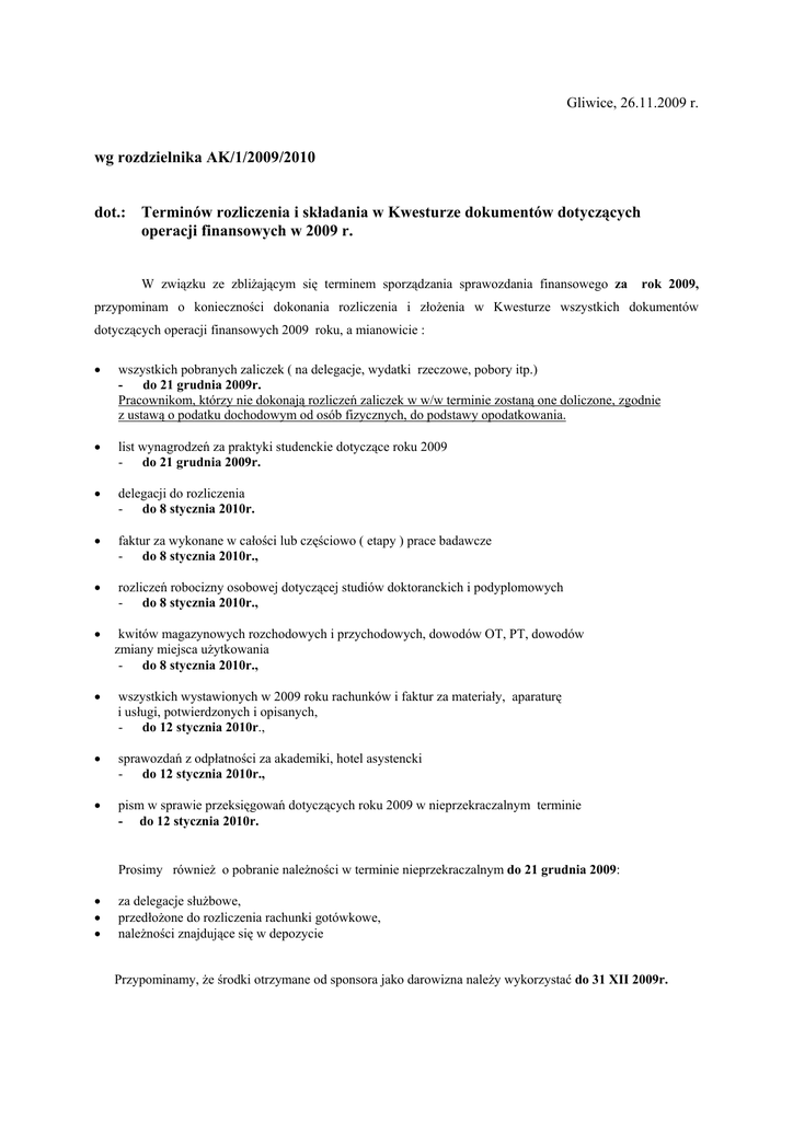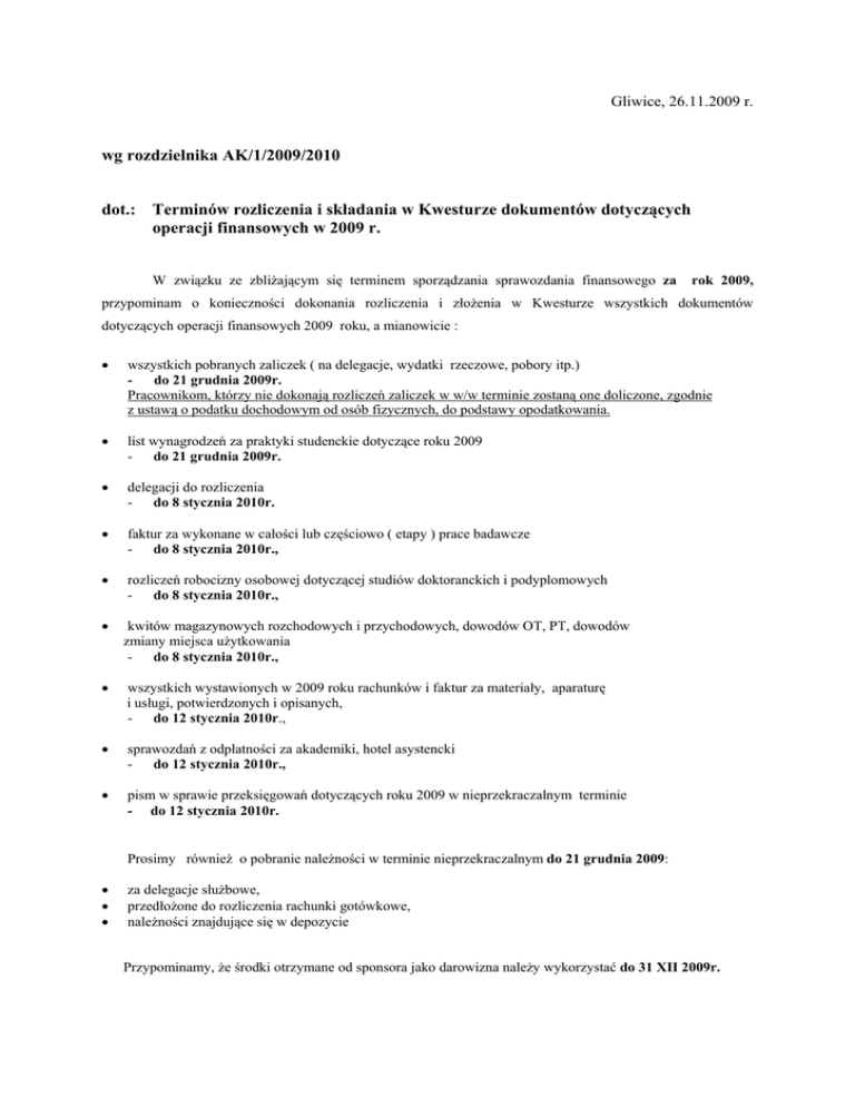 Gliwice, 26.11.2009 r. wg rozdzielnika AK/1/2009/2010 dot.: Terminów rozliczenia i składania w Kwesturze dokumentów dotyczących operacji finansowych w 2009 r. W związku ze zbliżającym się terminem sporządzania sprawozdania finansowego za rok 2009, przypominam o konieczności dokonania rozliczenia i złożenia w Kwesturze wszystkich dokumentów dotyczących operacji finansowych 2009 roku, a mianowicie : • wszystkich pobranych zaliczek ( na delegacje, wydatki rzeczowe, pobory itp.) - do 21 grudnia 2009r. Pracownikom, którzy nie dokonają rozliczeń zaliczek w w/w terminie zostaną one doliczone, zgodnie z ustawą o podatku dochodowym od osób fizycznych, do podstawy opodatkowania. • list wynagrodzeń za praktyki studenckie dotyczące roku 2009 - do 21 grudnia 2009r. • delegacji do rozliczenia - do 8 stycznia 2010r. • faktur za wykonane w całości lub częściowo ( etapy ) prace badawcze - do 8 stycznia 2010r., • rozliczeń robocizny osobowej dotyczącej studiów doktoranckich i podyplomowych - do 8 stycznia 2010r., • kwitów magazynowych rozchodowych i przychodowych, dowodów OT, PT, dowodów zmiany miejsca użytkowania - do 8 stycznia 2010r., • wszystkich wystawionych w 2009 roku rachunków i faktur za materiały, aparaturę i usługi, potwierdzonych i opisanych, - do 12 stycznia 2010r., • sprawozdań z odpłatności za akademiki, hotel asystencki - do 12 stycznia 2010r., • pism w sprawie przeksięgowań dotyczących roku 2009 w nieprzekraczalnym terminie - do 12 stycznia 2010r. Prosimy również o pobranie należności w terminie nieprzekraczalnym do 21 grudnia 2009: • • • za delegacje służbowe, przedłożone do rozliczenia rachunki gotówkowe, należności znajdujące się w depozycie Przypominamy, że środki otrzymane od sponsora jako darowizna należy wykorzystać do 31 XII 2009r. 2 Przypominamy również o obowiązku : ♦ uregulowania prawa własności aparatury zakupionej do prac badawczych. Wykazy aparatury zakupionej do prac BK i BW powinny być sporządzone szczegółowo wg poszczególnych faktur zakupu. ( wykazy można pobrać z : http://archiwalna.polsl.pl/adc/druki.htm) ♦ sporządzenia inwentaryzacji robót w toku wg stanu na dzień 31 grudnia 2009 r. w terminie do 29 stycznia 2010 r. ( druki tej inwentaryzacji znajdują się w Dziale Kosztów Kwestury – pokój 145, informacje także w Dziale Kosztów – telefony : 237-23-72, 237-23-83, 237-23-05, 237-14 -39 ). W arkuszach spisowych inwentaryzacji robót w toku prosimy wykazać wszystkie prace objęte ewidencją umownej działalności badawczej ( prace NB, U, W ), które będą kontynuowane w 2010r. bez względu na stopień ich zaawansowania. Prace BW, BK, PBU, PBR , SPB,PBS, PBZ, PC które będą kontynuowane w 2010 r. prosimy wykazać w odrębnym zestawieniu. Informujemy, że w grudniu 2009 r. przewidziane są dwa terminy wypłat z tytułu zawartych umów zlecenie i umów o dzieło – 15-go i 22-go grudnia ( tylko w przypadku zachowania terminu złożenia dokumentacji w pok. 343 – do 7 grudnia rb.). Prosimy o bezwzględne przestrzeganie wyżej podanych terminów. Kwestor / mgr Krystyna Pręda / Otrzymują : - wszystkie jednostki i komórki organizacyjne Uczelni, pełnomocnicy Kwestora jednostka zamiejscowa Katowice jednostka zamiejscowa Rybnik jednostka zamiejscowa Zabrze