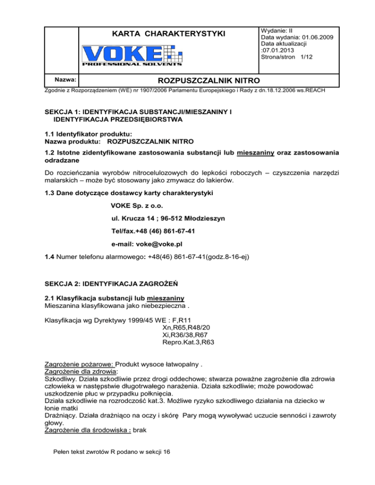 KARTA CHARAKTERYSTYKI Nazwa: Wydanie: II Data wydania: 01.06.2009 Data aktualizacji :07.01.2013 Strona/stron 1/12 ROZPUSZCZALNIK NITRO Zgodnie z Rozporządzeniem (WE) nr 1907/2006 Parlamentu Europejskiego i Rady z dn.18.12.2006 ws.REACH SEKCJA 1: IDENTYFIKACJA SUBSTANCJI/MIESZANINY I IDENTYFIKACJA PRZEDSIĘBIORSTWA 1.1 Identyfikator produktu: Nazwa produktu: ROZPUSZCZALNIK NITRO 1.2 Istotne zidentyfikowane zastosowania substancji lub mieszaniny oraz zastosowania odradzane Do rozcieńczania wyrobów nitrocelulozowych do lepkości roboczych – czyszczenia narzędzi malarskich – może być stosowany jako zmywacz do lakierów. 1.3 Dane dotyczące dostawcy karty charakterystyki VOKE Sp. z o.o. ul. Krucza 14 ; 96-512 Młodzieszyn Tel/fax.+48 (46) 861-67-41 e-mail: [email protected] 1.4 Numer telefonu alarmowego: +48(46) 861-67-41(godz.8-16-ej) SEKCJA 2: IDENTYFIKACJA ZAGROŻEŃ 2.1 Klasyfikacja substancji lub mieszaniny Mieszanina klasyfikowana jako niebezpieczna . Klasyfikacja wg Dyrektywy 1999/45 WE : F,R11 Xn,R65,R48/20 Xi,R36/38,R67 Repro.Kat.3,R63 Zagrożenie pożarowe: Produkt wysoce łatwopalny . Zagrożenie dla zdrowia: Szkodliwy. Działa szkodliwie przez drogi oddechowe; stwarza poważne zagrożenie dla zdrowia człowieka w następstwie długotrwałego narażenia. Działa szkodliwie; może powodować uszkodzenie płuc w przypadku połknięcia. Działa szkodliwie na rozrodczość kat.3. Możliwe ryzyko szkodliwego działania na dziecko w łonie matki Drażniący. Działa drażniąco na oczy i skórę Pary mogą wywoływać uczucie senności i zawroty głowy. Zagrożenie dla środowiska : brak Pełen tekst zwrotów R podano w sekcji 16 Wydanie: II Data wydania: 01.06.2009 Data aktualizacji :07.01.2013 Strona/stron 2/12 KARTA CHARAKTERYSTYKI Nazwa: ROZPUSZCZALNIK NITRO Zgodnie z Rozporządzeniem (WE) nr 1907/2006 Parlamentu Europejskiego i Rady z dn.18.12.2006 ws.REACH 2.2 Elementy oznakowania Znaki ostrzegawcze: F – Wysoce łatwopalny, Xn- Szkodliwy, Zawiera: toluen ; aceton F Xn zwroty wskazujące rodzaj zagrożenia R36/38 Działa drażniąco na oczy i skórę R48/20 Działa szkodliwie przez drogi oddechowe; stwarza poważne zagrożenie dla zdrowia człowieka w następstwie długotrwałego narażenia R63 Możliwe ryzyko szkodliwego działania na dziecko w łonie matki R65 Działa szkodliwie; może powodować uszkodzenie płuc w przypadku połknięcia R67 Pary mogą wywoływać uczucie senności i zawroty głowy zwroty określające warunki bezpiecznego stosowania S2 Chronić przed dziećmi S9 Przechowywać pojemnik w miejscu dobrze wentylowanym S16 Nie przechowywać w pobliżu źródeł zapłonu – nie palić tytoniu S36/37Nosić odpowiednią odzież ochronną i odpowiednie rękawice ochronne S62 W razie połknięcia nie wywoływać wymiotów: niezwłocznie zasięgnąć porady lekarza i pokazać opakowanie lub etykietę 2.3 Inne zagrożenia : Mieszanina nie spełnia kryteriów PBT lub vPvB zgodnie z zał.XIII rozporządzenia REACH Inne zagrożenia nie odzwierciedlone w klasyfikacji :Nieznane SEKCJA 3: SKŁAD I INFORMACJA O SKŁADNIKACH Nazwa składnika Numer rejestracji % wag Nr CAS Nr WE Nr indeksowy Toluen 01-2119471310-51XXXX 50-70% 108-88-3 203-625-9 601-021-00-3 Aceton 01-2119471330-490002 25-50% 67-64-1 200-662-2 Pełen tekst zwrotów R i uwag H podano w sekcji 16 606-001-00-8 Klasyfikacja wg dyrektywy 67/548/EWG F,R11, Repr.kat.3 ,R63; Xn,R48/20,R65 Xi,R38,R67, F,R11,Xi,R36,R66, R67 Klasyfikacja wg Rozporządzenia 1272/2008 Flam.Liq.2 , H225 Repr.2,H361d Asp. Tox.1,H304 STOT RE 2,H373 Skin Irrit.2 ,H315 STOT SE,3 H336 Flam.Liq.2 , H225 Eye Irrit.2 ,H319 STOT SE 3 H336 EUH 066 KARTA CHARAKTERYSTYKI Nazwa: Wydanie: II Data wydania: 01.06.2009 Data aktualizacji :07.01.2013 Strona/stron 3/12 ROZPUSZCZALNIK NITRO Zgodnie z Rozporządzeniem (WE) nr 1907/2006 Parlamentu Europejskiego i Rady z dn.18.12.2006 ws.REACH SEKCJA 4: ŚRODKI PIERWSZEJ POMOCY 4.1 Opis środków pierwszej pomocy Wdychanie: Wyprowadzić poszkodowaną osobę ze skażonego środowiska. Ułożyć poszkodowaną osobę w pozycji leżącej. Zapewnić ciepło i spokój . Rozluźnić ciasną odzież. Zapewnić otwartą wentylację .W przypadku wystąpienia takiej potrzeby – wykonać sztuczne oddychanie lub podać tlen. Zapewnić pomoc lekarską. Spożycie: Natychmiast zapewnić pomoc medyczną. Nie wywoływać wymiotów – ryzyko aspiracji do płuc. W przypadku wystąpienia naturalnych odruchów wymiotów trzymać poszkodowanego w pozycji nachylonej do przodu. W przypadku wystąpienia duszności podawać tlen do oddychania. Kontakt z oczami: Płukać skażone oczy większą ilością letniej wody przez 15 minut, przy wywiniętych powiekach (usunąć przedtem szkła kontaktowe). Nie używać zbyt silnego strumienia wody ,aby nie uszkodzić rogówki. W przypadku wystąpienia i utrzymywania się objawów podrażnienia zapewnić pomoc lekarską. Kontakt ze skórą: Zdjąć zanieczyszczone ubranie i buty. Zanieczyszczoną skórę umyć dokładnie dużą ilością wody z mydłem. Kontynuować płukanie przez co najmniej 10 minut . W przypadku wystąpienia i utrzymywania się objawów podrażnienia zapewnić pomoc lekarską. 4.2 Najważniejsze ostre i opóźnione objawy oraz skutki narażenia Może spowodować uszkodzenie płuc w przypadku połknięcia objawiającym się przykładowo oskrzelowym zapaleniem płuc. Długotrwałe lub częste narażenie może spowodować zaburzenia ze strony ośrodkowego układu nerwowego takie jak bóle i zawroty głowy, brak koordynacji, senność; bardzo wysokie stężenia par mogą spowodować utratę przytomności. W przypadku powtarzającego się narażenia może dojść do wysuszania, złuszczania oraz pękania skóry. 4.3 Wskazania dotyczące wszelkiej natychmiastowej pomocy lekarskiej i szczególnego postępowania z poszkodowanym Osobie nieprzytomnej nie podawać niczego doustnie i nie prowokować wymiotów. Pokazać kartę charakterystyki lub etykietę /opakowanie personelowi medy
