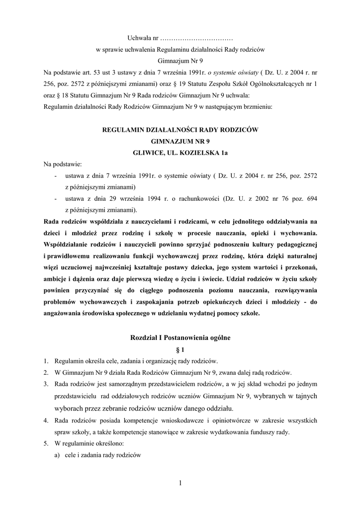 Uchwała nr …………………………… w sprawie uchwalenia Regulaminu działalności Rady rodziców Gimnazjum Nr 9 Na podstawie art. 53 ust 3 ustawy z dnia 7 września 1991r. o systemie oświaty ( Dz. U. z 2004 r. nr 256, poz. 2572 z późniejszymi zmianami) oraz § 19 Statutu Zespołu Szkół Ogólnokształcących nr 1 oraz § 18 Statutu Gimnazjum Nr 9 Rada rodziców Gimnazjum Nr 9 uchwala: Regulamin działalności Rady Rodziców Gimnazjum Nr 9 w następującym brzmieniu: REGULAMIN DZIAŁALNOŚCI RADY RODZICÓW GIMNAZJUM NR 9 GLIWICE, UL. KOZIELSKA 1a Na podstawie: - ustawa z dnia 7 września 1991r. o systemie oświaty ( Dz. U. z 2004 r. nr 256, poz. 2572 z późniejszymi zmianami) - ustawa z dnia 29 września 1994 r. o rachunkowości (Dz. U. z 2002 nr 76 poz. 694 z późniejszymi zmianami). Rada rodziców współdziała z nauczycielami i rodzicami, w celu jednolitego oddziaływania na dzieci i młodzieŜ przez rodzinę i szkołę w procesie nauczania, opieki i wychowania. Współdziałanie rodziców i nauczycieli powinno sprzyjać podnoszeniu kultury pedagogicznej i prawidłowemu realizowaniu funkcji wychowawczej przez rodzinę, która dzięki naturalnej więzi uczuciowej najwcześniej kształtuje postawy dziecka, jego system wartości i przekonań, ambicje i dąŜenia oraz daje pierwszą wiedzę o Ŝyciu i świecie. Udział rodziców w Ŝyciu szkoły powinien przyczyniać się do ciągłego podnoszenia poziomu nauczania, rozwiązywania problemów wychowawczych i zaspokajania potrzeb opiekuńczych dzieci i młodzieŜy - do angaŜowania środowiska społecznego w udzielaniu wydatnej pomocy szkole. Rozdział I Postanowienia ogólne §1 1. Regulamin określa cele, zadania i organizację rady rodziców. 2. W Gimnazjum Nr 9 działa Rada Rodziców Gimnazjum Nr 9, zwana dalej radą rodziców. 3. Rada rodziców jest samorządnym przedstawicielem rodziców, a w jej skład wchodzi po jednym przedstawicielu rad oddziałowych rodziców uczniów Gimnazjum Nr 9, wybranych w tajnych wyborach przez zebranie rodziców uczniów danego oddziału. 4. Rada rodziców posiada kompetencje wnioskodawcze i opiniotwórcze w zakresie wszystkich spraw szkoły, a takŜe kompetencje stanowiące w zakresie wydatkowania funduszy rady. 5. W regulaminie określono: a) cele i zadania rady rodziców 1 b) skład i strukturę rady rodziców, tryb wyboru i odwołania członków prezydium i komisji rewizyjnej c) zadania członków prezydium, prezydium i komisji rewizyjnej d) zasady wyraŜania stanowiska przez radę rodziców e) zasady pracy rady rodziców i jej organów f) zasady gromadzenia i wydatkowania funduszy rady rodziców 6. Regulamin rady rodziców musi być zgodny ze statutem szkoły. Rozdział II Cele i zadania rady rodziców §2 Rada rodziców jest organizacją wewnątrzszkolną mającą na celu: 1. Zapewnienie współpracy rodziców ze szkołą w doskonaleniu organizacji nauczania oraz pracy wychowawczej i opiekuńczej w szkole i środowisku. 2. Przedstawianie nauczycielom, władzom szkolnym i oświatowym opinii rodziców (opiekunów) we wszystkich istotnych sprawach szkoły. 3. Współdziałanie z dyrektorem szkoły, jego zastępcami i radą pedagogiczną w zaznajamianiu ogółu rodziców uczniów z programem wychowania i opieki, organizacją nauczania oraz wynikającymi z nich zadaniami dla szkoły i rodziców. 4. Upowszechnianie wśród rodziców - przy współpracy z organizacjami oświatowymi i społecznymi - wiedzy o wychowaniu i funkcjach opiekuńczo - wychowawczych rodziny. 5. Pozyskiwanie rodziców do czynnego udziału w realizacji programu nauczania, wychowania i opieki oraz udzielanie pomocy materialnej w tym zakresie. §3 Podstawowe zadania wynikają z celów określonych w § 2 ust.1-5 regulaminu. Do zadań tych naleŜy: 1. Współudział w realizacji zadań ogólnoszkolnych, a w szczególności: - organizowanie rodziców i środowiska społecznego do realizacji programu pracy szkoły, - popularyzowanie wiedzy o wychowaniu w placówkach oświatowych i w rodzinie, - dokonywanie wspólnie z organizacjami społecznymi analizy wychowawczych i oświatowych potrzeb środowiska, - pomoc dyrektorowi i radzie pedagogicznej w opracowaniu programu rozwoju szkoły, - organizowanie prac społecznie uŜytecznych rodziców i środowiska społecznego na rzecz szkoły, - działanie, wspólnie z instytucjami współpracującymi ze szkołą, na rzecz stałej poprawy warunków pracy i wypoczynku uczniów i nauczycieli, - uczestniczenie w planowaniu wydatków szkoły oraz podejmowanie prac słuŜących zwiększaniu funduszy szkolnych, - organizowanie wymiany doświadczeń wychowawczych między rodzicami, 2 2. Współpraca z dyrektorem i nauczycielami w podnoszeniu poziomu nauczania, a w szczególności: - pomoc w wypracowaniu jak najlepszej organizacji nauczania, - zapoznawanie ogółu rodziców z programem, organizacją i warunkami realizacji procesu nauczania, - dokonywanie, wspólnie z wychowawcami klas oraz z innymi nauczycielami, analizy i oceny zainteresowań i postaw uczniów, - udzielanie pomocy w organizowaniu pracy uczniowskich kół i zespołów zainteresowań oraz otaczanie opieką uczniów szczególnie zdolnych, - organizowanie udziału rodziców mających odpowiednie przygotowanie, na wniosek nauczyciela, w realizacji wybranych tematów przewidzianych programem nauczania, - zapoznawanie rodziców z czynnikami właściwego wyboru przez młodzieŜ zawodu i kierunku dalszego kształcenia, - wzbogacanie wyposaŜenia szkoły w pomoce naukowe. 3. Współpraca w rozszerzaniu i pogłębianiu oddziaływań wychowawczych szkoły i rodziny, a w szczególności: - dokonywanie oceny sytuacji wychowawczej w środowisku pozaszkolnym, - informowanie rodziców o organizacji czasu wolnego uczniów po zajęciach lekcyjnych, na terenie szkoły, środowiska zamieszkania i w placówkach wychowania pozaszkolnego, - współudział w organizowaniu zajęć pozalekcyjnych rozwijających zainteresowania i uzdolnienia uczniów,