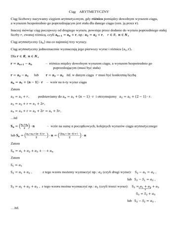 Ciąg ARYTMETYCZNY Ciąg liczbowy nazywamy cięgiem arytmetycznym, gdy różnica pomiędzy dowolnym wyrazem ciągu, a wyrazem bezpośrednio go poprzedzającym jest stała dla danego ciągu (ozn. ją przez r). Inaczej mówiąc ciąg począwszy od drugiego wyrazu, powstaje przez dodanie do wyrazu poprzedniego stałej liczby ݎ, zwanej różnicą, czyli ܖ܉ା = ܖ܉+ ܚ, np.: ܉ = ܉ + ܚ, ܴ ∈ ݎ, ∈ ࡺା Ciąg arytmetyczny ሺa୬ ሻ ma co najmniej trzy wyrazy. Ciąg arytmetyczny jednoznacznie wyznaczają jego pierwszy wyraz i różnica ሺaଵ , rሻ. Dla ࢘ ∈ ࡾ, ∈ ࡺା ܖ܉ = ܚା − ܖ܉ ܉ = ܚ − ܉ – różnica między dowolnym wyrazem ciągu, a wyrazem bezpośrednio go poprzedzającym (musi być stała) ܉ = ܚ − ܉ itd. w danym ciągu ݎmusi być konkretną liczbą lub ܉ = ܖ܉ + ሺ ܖ− ሻ ∙ ܚ – wzór na n-ty wyraz ciągu Zatem podstawiamy do a୬ = aଵ + ሺn − 1ሻ ∙ r i otrzymujemy aଶ = aଵ + ሺ2 − 1ሻ ∙ r. aଶ = aଵ + ݎ, aଷ = aଶ + r = aଵ + 2ݎ, aସ = aଷ + r = aଶ + 2 = ݎaଵ + 3ݎ, ...itd = ܖ܁ቀ ܉ ାܖ܉ lub = ܖ܁ቀ ቁ∙ܖ – wzór na sumę n początkowych, kolejnych wyrazów ciągu arytmetycznego ܉ ା܉ ାሺିܖሻ∙ܚ ቁ∙ =ܖቀ ሺ܉ ା ሺିܖሻ∙ ܚሻ ቁ∙ܖ Zatem S୬ = ܽଵ + ܽଶ + ܽଷ + ⋯ + ܽ Zatem Sଵ = ܽଵ Sଶ = ܽଵ + ܽଶ , z tego wzoru możemy wyznaczyć np.: ܽଶ (czyli drugi wyraz): Sଶ − ܽଵ = ܽଶ , lub Sଶ − ܵଵ = ܽଶ , Sଷ = ܽଵ + ܽଶ + ܽଷ , z tego wzoru można wyznaczyć np.: ܽଷ (czyli trzeci wyraz): Sଷ = ܽଵ + ܽଶ + ܽଷ Sଷ = ܵଶ + ܽଷ lub Sଷ − ܵଶ = ܽଷ , …itd. Własności ciągu arytmetycznego: Każdy wyraz ciągu arytmetycznego – oprócz pierwszego i ostatniego, jeśli ciąg jest skończony – jest średnia arytmetyczną wyrazów poprzedniego i następnego, czyli: ࢇ = ࢇష ାࢇశ np.: ܽଷ = , dla ≥ . మ ାర ଶ , (Pamiętajmy, że własność ta nie dotyczy pierwszego wyrazu bo nie ma on wyrazu poprzedniego – nie ma takiego wyrazu, jak ܽ , jak również ostatniego wyrazu bo nie ma on wyrazu następnego). W ciągu arytmetycznym skończonym suma dwóch wyrazów jednakowo odległych od pierwszego i ostatniego wyrazu tego ciągu jest równa sumie wyrazu pierwszego i wyrazu ostatniego. Dany jest ciąg skończony 2,4, , 8,10,12, , 16,18. Wówczas suma pierwszego i ostatniego wyrazu ciągu wynosi 2 + 18 = 20. Weźmy sobie dwa wyrazy równo oddalone od 2 i 18 (czyli od pierwszego i ostatniego wyrazu). np.: 6 i 14 widzimy, że ich suma również wynosi 20.