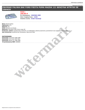 Informacje o produkcie Utworzono 03-03-2017 ZBIORNIK PALIWA BAK FORD FIESTA PUMA MAZDA 121 BENZYNA WTRYSK OE 1084659 Cena : 240,00 zł Nr katalogowy : KH2563 008 Stan magazynowy : niski Średnia ocena : brak recenzji w at ZASTOSOWANIE: Samochód: Ford Fiesta 1995-1999 Samochód: Ford Puma 1997-2001 Samochód: Mazda 121 1996-1999 Nr porównawczy OEM: 1084659 er m ar k Nowy zbiornik paliwa Pojemności: 42 L Materiał: stal Silnik: benzyna na wtrysku Nadwozie: hatchback 3/5D, Puma coupe 3D Producent / jakość: wysokiej klasy zamiennik, nie odbiegający jakością wykonania, parametrami oraz wyglądem od oryginału Stan techniczny: przedmiot jest nieużywany, fabrycznie nowy Wygenerowano w programie www.oscGold.com