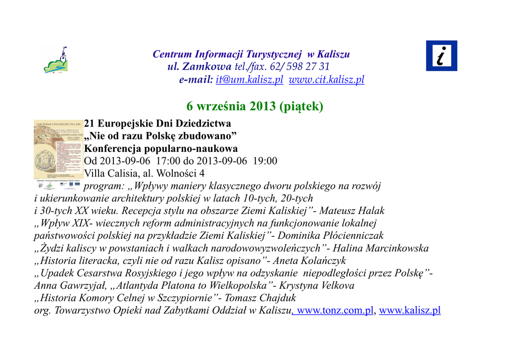 6 września 2013 (piątek) - Centrum Informacji Turystycznej w Kaliszu