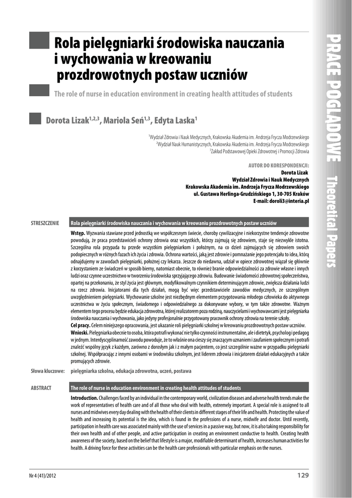 Rola pielęgniarki środowiska nauczania i wychowania w kreowaniu prozdrowotnych postaw uczniów The role of nurse in education environment in creating health attitudes of students Dorota Lizak1,2,3, Mariola Seń1,3, Edyta Laska1 1 Wydział Zdrowia i Nauk Medycznych, Krakowska Akademia im. Andrzeja Frycza Modrzewskiego 2 Wydział Nauk Humanistycznych, Krakowska Akademia im. Andrzeja Frycza Modrzewskiego 3 Zakład Podstawowej Opieki Zdrowotnej i Promocji Zdrowia AUTOR DO KORESPONDENCJI: Dorota Lizak Wydział Zdrowia i Nauk Medycznych Krakowska Akademia im. Andrzeja Frycza Modrzewskiego ul. Gustawa Herlinga-Grudzińskiego 1, 30-705 Kraków E-mail: [email protected] STRESZCZENIE Rola pielęgniarki środowiska nauczania i wychowania w kreowaniu prozdrowotnych postaw uczniów Wstęp. Wyzwania stawiane przed jednostką we współczesnym świecie, choroby cywilizacyjne i niekorzystne tendencje zdrowotne powodują, że praca przedstawicieli ochrony zdrowia oraz wszystkich, którzy zajmują się zdrowiem, staje się niezwykle istotna. Szczególna rola przypada tu przede wszystkim pielęgniarkom i położnym, na co dzień zajmujących się zdrowiem swoich podopiecznych w różnych fazach ich życia i zdrowia. Ochrona wartości, jaką jest zdrowie i pomnażanie jego potencjału to idea, którą odnajdujemy w zawodach pielęgniarki, położnej czy lekarza. Jeszcze do niedawna, udział w opiece zdrowotnej wiązał się głównie z korzystaniem ze świadczeń w sposób bierny, natomiast obecnie, to również branie odpowiedzialności za zdrowie własne i innych ludzi oraz czynne uczestnictwo w tworzeniu środowiska sprzyjającego zdrowiu. Budowanie świadomości zdrowotnej społeczeństwa, opartej na przekonaniu, że styl życia jest głównym, modyfikowalnym czynnikiem determinującym zdrowie, zwiększa działania ludzi na rzecz zdrowia. Inicjatorami dla tych działań, mogą być więc przedstawiciele zawodów medycznych, ze szczególnym uwzględnieniem pielęgniarki. Wychowanie szkolne jest niezbędnym elementem przygotowania młodego człowieka do aktywnego uczestnictwa w życiu społecznym, świadomego i odpowiedzialnego za dokonywane wybory, w tym także zdrowotne. Ważnym elementem tego procesu będzie edukacja zdrowotna, której realizatorem poza rodziną, nauczycielami i wychowawcami jest pielęgniarka środowiska nauczania i wychowania, jako jedyny profesjonalnie przygotowany pracownik ochrony zdrowia na terenie szkoły. Cel pracy. Celem niniejszego opracowania, jest ukazanie roli pielęgniarki szkolnej w kreowaniu prozdrowotnych postaw uczniów. Wnioski. Pielęgniarka obecnie to osoba, która potrafi wykonać nie tylko czynności instrumentalne, ale i dietetyk, psycholog i pedagog w jednym. Interdyscyplinarność zawodu powoduje, że to właśnie ona cieszy się znaczącym uznaniem i zaufaniem społecznym i potrafi znaleźć wspólny język z każdym, zarówno z dorosłym jak i z małym pacjentem, co jest szczególnie ważne w przypadku pielęgniarki szkolnej. Współpracując z innymi osobami w środowisku szkolnym, jest liderem zdrowia i inicjatorem działań edukacyjnych a także promujących zdrowie. Słowa kluczowe: pielęgniarka szkolna, edukacja zdrowotna, uczeń, postawa ABSTRACT The role of nurse in education environment in creating health attitudes of students Introduction. Challenges faced by an individual in the contemporary world, civilization diseases and adverse health trends make the work of representatives of health care and of all those who deal with health, extremely important. A special role is assigned to all nurses and midwives every day dealing with the health of their clients in different stages of their life and health. Protecting the value of health and increasing its potential is the idea, which is found in the professions of a nurse, midwife and doctor. Until recently, participation in health care was associated mainly with the use of services in a passive way, but now, it is also taking responsibility for their own health and of other people, and active participation in creating an environment conductive to health. Creating health awareness of the society, based on the belief that lifestyle is a major, modifiable determinant of health, increases human activities for health. A driving force for these activities can be the health care professionals with particular emphasis on the nurses. Nr 4 (41)/2012 129 Rola pielęgniarki środowiska nauczania i wychowania w kreowaniu prozdrowotnych postaw uczniów School education is an essential element of preparing young people for active participation in social life, conscious and responsible for making choices, including health. An important part of this process will be the health education, the implementer of which, besides the family, teachers and educators, is nurse in education environment, as the only professionally trained health worker in the school. Aim. The aim of this study is to show the role of school nurse in creating healthy attitudes of students. Conclusion. The nurse today is a person who is able to perform not only instrumental actions, but she is also a nutritionist, a psychologist and the educator. Interdisciplinary nature of the profession means that she has a significant respect and trust of society and is able to find common language with everyone, both adults and little patients, which is particularly important for the school nurse. While cooperating with others in the school environment, she is a health leader and initiator of educational and health promotion activities. Keywords: school nurse, health education, student, attitude WPROWADZENIE Życie we współczesnym świecie, staje się sztuką, w której sami jesteśmy zarówno reżyserami jak i aktorami i to, jaki obierzemy kierunek, zależy od nas samych. Słowo „sztuka” zwykle kojarzy się z pewnego rodzaju twórczością, osiągnięciami, działalnością artystyczną. Można zatem postawić tezę, iż umiejętność życia i pokonywania p
