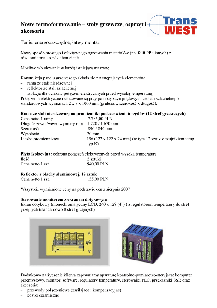 Nowe termoformowanie – stoły grzewcze, osprzęt i akcesoria Tanie, energooszczędne, łatwy montaż Nowy sposób prostego i efektywnego ogrzewania materiałów (np. folii PP i innych) z równomiernym rozdziałem ciepła. Możliwe wbudowanie w każdą istniejącą maszynę. Konstrukcja panelu grzewczego składa się z następujących elementów: – rama ze stali nierdzewnej – reflektor ze stali szlachetnej – izolacja dla ochrony połączeń elektrycznych przed wysoką temperaturą Połączenia elektryczne realizowane są przy pomocy szyn prądowych ze stali szlachetnej o standardowych wymiarach 2 x 8 x 1000 mm (grubość x szerokość x długość). Rama ze stali nierdzewnej na promienniki podczerwieni: 6 rzędów (12 stref grzewczych) Cena netto 1 ramy 7.785,00 PLN Długość zewn./wewn wymiary ram 1.720 / 1.670 mm Szerokość 890 / 840 mm Wysokość 70 mm Liczba promienników 156 (122 x 122 x 24 mm) (w tym 12 sztuk z czujnikiem temp. typ K) Płyta izolacyjna: ochrona połączeń elektrycznych przed wysoką temperaturą Ilość 2 sztuki Cena netto 1 szt. 940,00 PLN Reflektor z blachy aluminiowej, 12 sztuk Cena netto 1 szt. 155,00 PLN Wszystkie wymienione ceny na podstawie cen z sierpnia 2007 Sterowanie monitorem z ekranem dotykowym Ekran dotykowy (monochromatyczny LCD, 240 x 128 (4”) ) z regulatorem temperatury do stref grzejnych (standardowo 8 stref grzejnych) Dodatkowo na życzenie klienta zapewniamy aparaturę kontrolno-pomiarowo-sterującą: komputer przemysłowy, monitor, software, regulatory temperatury, sterowniki PLC, przekaźniki SSR oraz akcesoria: – przewody połączeniowe (zasilające i kompensacyjne) – kostki ceramiczne Dostarczamy również wysokowydajne wyposażenie dla osiągnięcia maksymalnych wydajności: Ślimaki + cylindry Głowice szczelinowe Walce / kalandry do grzania i chłodzenia KONTAKT: P.P.H.U. Trans-West GmbH Sp. z o. o. ul. Prądzyńskiego 20, 63-000 Środa Wlkp tel. (0-61) 287-02-64, tel/fax (0-61) 285-26-63 mail: [email protected] www.transwest.pl