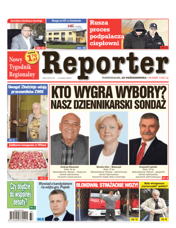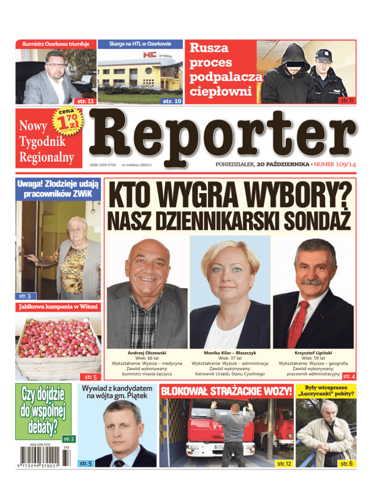 Skarga na HTL w Ozorkowie Ozorkowa2014 triumfuje 20Burmistrz PAŹDZIERNIKA str. 11 Nowy Tygodnik Regionalny str. 10 ISSN 2299-3703 Uwaga! Złodzieje udają pracowników ZWiK Rusza proces podpalacza ciepłowni 1 Nowy Tygodnik Regionalny str. 11 PONIEDZIAŁEK, 20 PAŹDZIERNIKA • numer 109/14 nr indeksu 286311 KTO WYGRA WYBORY? NASZ DZIENNIKARSKI SONDAŻ str. 3 Jabłkowa kampania w Witoni str. 5 Czy dojdzie do wspólnej debaty? Andrzej Olszewski Wiek: 66 lat Wykształcenie: Wyższe – medycyna Zawód wykonywany: burmistrz miasta Łęczyca Wywiad z kandydatem na wójta gm. Piątek Monika Kilar – Błaszczyk Wiek: 37 lat Wykształcenie: Wyższe – administracja Zawód wykonywany: kierownik Urzędu Stanu Cywilnego Krzysztof Lipiński Wiek: 59 lat Wykształcenie: Wyższe – geografia Zawód wykonywany: pracownik administracyjny str. 4 BLOKOWAŁ STRAŻACKIE WOZY! Były wiceprezes „Łęczycanki” pobity? str. 12 str. 6 str. 2 142 str. 5 2 Nowy Tygodnik Regionalny Porozumienia na razie nie ma Czy dojdzie do wspólnej debaty? ŁĘCZYCA Debata kandydatów na burmistrza, o której na swojej stronie pisał jeden z lokalnych portali internetowych, zapewne się nie odbędzie. Dwa komitety (Andrzeja Olszewskiego i Moniki Kilar – Błaszczyk) nie przystały na narzucone warunki. „Tak” dla debaty ustalonej razem przez wszystkie komitety i na wspólnie określonych zasadach. „Nie” dla chaotycznych działań i braku profesjonalizmu - usłyszeliśmy. Wszyscy kandydaci na burmistrza Łęczycy zgadzają się co do jednego – debata jest ciekawym pomysłem. Dlaczego więc spotkanie zaplanowane przez portal pierwotnie na 5 listopada najprawdopodobniej się nie odbędzie? - Nie możemy się zgodzić na taką formę debaty, o której była mowa. Nie jest to ani poważne, ani profesjonalne podejście do tematu. Gdy pojawiła się idea zorganizowania debaty, pomyślałam, że to świetny pomysł. Wszyscy kandydaci w jednym czasie mogliby zaprezentować mieszkańcom swoje poglądy i skonfrontować ze sobą różne kwestie – słyszymy od Moniki Kilar - Błaszczyk, kandydatki na burmistrza Łęczycy. - Debata powinna przyjąć formę wspólnie ustaloną przez wszystkie komitety. Jeżeli do takiej dojdzie, z przyjemnością wezmę w niej udział. Podobne stanowisko zajął KWW Andrzeja Olszewskiego, który również odmówił udziału w tej konkretnej przedwyborczej dyskusji. - Tak naprawdę, to trudno powiedzieć, żeby ktokolwiek zaproponował naszemu kandydatowi udział w dyskusji. O debacie i naszym rzekomo zajętym stanowisku dowiedzieliśmy się z portalu. Nie wpłynęło żadne zaproszenie czy propozycja. Podobnie więc jak pomysłodawca tej debaty posłużyłem się internetem i wysłałem do niego wiadomość, że nasz kandydat jest gotów do debaty w każdej chwili, ale na zasadach ogólnie przyjętych – wyjaśnia Wojciech Czaplij, pełnomocnik wyborczy A. Olszewskiego. - Jeżeli pojawia się pomysł zorganizowania debaty, to szefowie sztabów, inaczej pełnomocnicy wyborczy, powinni spotkać się i wspólnie ustalić warunki. Przede wszystkim miejsce, czas, formę, regulamin, liczbę pytań, czas wolnej wypowiedzi oraz prowadzącego. Powinna być nim osoba kompetentna, obiektywna i profesjonalna. Sytuacja w której ktoś mógłby manipulować opinią publiczną byłaby niedopuszczalna. Każdy z kandydatów powinien mieć równe szanse w dyskusji. Jakie stanowisko w tej sprawie zajął trzeci z kandydatów na burmistrza Łęczycy? - Jestem gotów do udziału w każdej debacie i nie stawiam żadnych warunków. Nie potrzebuję czasu na przygotowanie się, nie muszę też wcześniej znać pytań, żaden scenariusz nie jest mi potrzebny. O Łęczycy, o moim mieście mogę dyskutować z każdym, o dowolnej porze. Wezmę udział w debacie, bez względu na to, kto ją zaproponuje – zapewnia Krzysztof Lipiński. Z pewnością debata kandydatów na włodarza Łęczycy byłaby niezwykle ciekawą wymianą poglądów i pomysłów na rządzenie miastem. Czy komitety porozumieją się w tej sprawie między sobą? (MR) Na „królewskim osiedlu” chodnik z odzysku ŁĘCZYCA Na „Osiedlu Królów Polskich” przy ul. Jagiełły ruszyły prace związane z układaniem chodnika. Płyty są jednak z „odzysku”. Co na to mieszkańcy? W ubiegłym tygodniu na ulicy Jagiełły pojawiła się równiarka oraz ekipa z Zieleni Miejskiej, która rozpoczęła kładzenie płyt chodnikowych. Chodnik będzie na całej długości ulicy Jagiełły, z płyt odzyskanych po chodniku na ulicy Belwederskiej. Tam, zostały one zastąpione kostką brukową. 20 PAŹDZIERNIKA 2014 Kierowcy pytają co z mandatami ŁĘCZYCA Właściciele pojazdów, którzy spodziewali się mandatu z fotoradaru z dni 30 września i 9 października za przekroczenie prędkości, mogą odetchnąć z ulgą. Postępowanie z tych dni zakończono, sankcji nie będzie. Mając na uwadze liczne pytania naszych Czytelników dotyczące mandatów wystawionych na podstawie zdjęć z fotoradaru oraz podejrzeniem możliwości złego ustawienia urządzenia pomiarowego przez funkcjonariuszy podejrzanych o bycie „pod wpływem”, dowiedzieliśmy się, że w związku z wydarzeniami w straży miejskiej mandaty nie zostaną wystawione. - Zdjęcia zrobione w tych dniach (30.09.2014 oraz 09.10.2014) zostały potraktowane jako zdjęcia testowe. Tym samym nie wiąże się to z żadnymi konsekwencjami w stosunku do właścicieli pojazdów utrwalonych na zdjęciach z fotoradaru – informuje Krzysztofa Łuczak, rzecznik łęczyckiego magistratu. Oznacza to, że straż miejska nie wystawi mandatu. Można więc powiedzieć, że sprawcy wykroczeń mieli szczęście, przekroczenie prędkości ujdzie im na sucho. tekst i fot. (MR) Pobiegli dla Jana Pawła II ŁĘCZYCA W czwartek aż 295 osób wzięło udział w 6 Biegu Papieskim. W parku miejskim pobiegły przede wszystkim dzieci i młodzież, które w ten sposób uczciły 36 rocznicę pontyfikatu św. Jana Pawła II. Hasło
