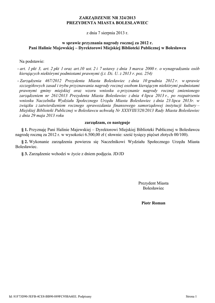 ZARZĄDZENIE NR 324/2013 PREZYDENTA MIASTA BOLESŁAWIEC z dnia 7 sierpnia 2013 r. w sprawie przyznania nagrody rocznej za 2012 r. Pani Halinie Majewskiej – Dyrektorowi Miejskiej Biblioteki Publicznej w Bolesławcu Na podstawie: - art. 1 pkt 3, art. 2 pkt 1 oraz art.10 ust. 2 i 7 ustawy z dnia 3 marca 2000 r. o wynagradzaniu osób kierujących niektórymi podmiotami prawnymi (j.t. Dz. U. z 2013 r. poz. 254) - Zarządzenia 467/2012 Prezydenta Miasta Bolesławiec z dnia 10 grudnia 2012 r. w sprawie szczegółowych zasad i trybu przyznawania nagrody rocznej osobom kierującym niektórymi podmiotami prawnymi gminy miejskiej oraz wzoru wniosku o przyznanie nagrody rocznej zmienionego zarządzeniem nr 261/2013 Prezydenta Miasta Bolesławiec z dnia 4 lipca 2013 r., po rozpatrzeniu wniosku Naczelnika Wydziału Społecznego Urzędu Miasta Bolesławiec z dnia 23 lipca 2013r. w związku z zatwierdzeniem rocznego sprawozdania finansowego samorządowej instytucji kultury – Miejskiej Biblioteki Publicznej w Bolesławcu uchwałą Nr XXXVIII/328/2013 Rady Miasta Bolesławiec z dnia 29 maja 2013 roku zarządzam, co następuje § 1. Przyznaję Pani Halinie Majewskiej – Dyrektorowi Miejskiej Biblioteki Publicznej w Bolesławcu nagrodę roczną za 2012 r. w wysokości 6.500,00 zł ( słownie: sześć tysięcy pięćset złotych 00/100). § 2. Wykonanie zarządzenia powierza się Naczelnikowi Wydziału Społecznego Urzędu Miasta Bolesławiec. § 3. Zarządzenie wchodzi w życie z dniem podjęcia. JD/JD Prezydent Miasta Bolesławiec Piotr Roman Id: 81F73D90-5EFB-4CE8-BB90-889FC95BA6EE. Podpisany Strona 1 UZASADNIENIE Przesłanki merytoryczne przyznania nagrody. Na bieżącą działalność w roku 2012 Biblioteka pozyskała m.in. dodatkowe fundusze: - dotację z Ministerstwa Kultury i Dziedzictwa Narodowego z programu "Promocja czytelnictwa – Rozwój księgozbiorów bibliotek" w kwocie 24.700 zł, - dary książkowe od darczyńców fizycznych i prawnych o łącznej wartości ok. 10.000 zł, - środki z Fundacji ORANGE na rozwój infrastruktury elektronicznej. Ogółem w 2012 roku Miejska Biblioteka z budżetu miasta) przekraczające 57 tysięcy zł. Publiczna pozyskała fundusze (poza dotacją Dzięki uzyskanym środkom od Ministra Kultury i Dziedzictwa Narodowego na zakup książek w ramach programu operacyjnego "Promocja czytelnictwa – Rozwój księgozbiorów bibliotek", które wzbogacone o dotacje z Miasta Bolesławiec oraz dary od osób fizycznych i prawnych pozwoliły na wykonanie zakupów w zakresie: 4.354 wol. książek, o wartości 97.191,07 zł. oraz 419 woluminów zbiorów specjalnych, o wartości 8.928,21 zł. (płyty DVD, CD). Biblioteka – ze zbiorami na poziomie 150 tys. wol. i czytelnikami w granicach 8,5 tys. oraz bogatą ofertą edukacyjno-kulturalną plasuje się w czołówce Dolnego Śląska i kraju. Ponadto wymierne korzyści przyniósł udział w projekcie Dyskusyjne Kluby Książki. Otrzymano zestaw ciekawej literatury, a także zostały pokryte koszty 2 spotkań autorskich W roku 2012 dołączono do oferty Biblioteki możliwość korzystania z książek w formacie elektronicznym poprzez portal World eBook Library, oferujący dostęp do ponad 2 milionów pełnotekstowych źródeł naukowych w prawie 100 językach (w tym blisko 3 tysiące w języku polskim) oraz około 23 tysięcy audiobooków. Kolejny zbiór to ponad tysiąc polskojęzycznych ibuków udostępniany za pośrednictwem czytelni ibuk.pl. Są to głównie książki naukowe. Odnotowano blisko 34 tysiące pobranych dokumentów z obydwu baz. Z urozmaiconej oferty Biblioteki mogły skorzystać wszystkie grupy wiekowe – poczynając od najmłodszych po seniorów. Dodatkowo w ramach stałych zajęć w Bibliotece związanych z aktywnością osób starszych w zakresie zdobywania umiejętności korzystania z komputera i Internetu uruchomiono: Akademię Seniora i Internetowy Krąg Przyjaciół Biblioteki. Jednym z najbardziej znaczących osiągnięć doceniających pracę Miejskiej Biblioteki Publicznej z młodym czytelnikiem w zakresie promocji czytelnictwa jest zdobycie zaszczytnego – najwyższego wyróżnienia - Medalu w konkursie na najlepiej przeprowadzoną kampanię społeczną w ramach akcji „Cała Polska Czyta Dzieciom”. Przesłanki formalno-prawne przyznania nagrody. Dyrektor Miejskiej Biblioteki Publicznej w Bolesławcu w ustawowym terminie złożył sprawozdanie finansowe z działalności instytucji w 2012 r. 29 maja 2013 r. Rada Miasta Bolesławiec podjęła uchwałę w sprawie zatwierdzenia w/w sprawozdania. 23 lipca 2013 r. Naczelnik Wydziału Społecznego wystąpiła z wnioskiem o przyznanie nagrody rocznej dla Dyrektora MBP. Wniosek został zaakceptowany przez Prezydenta Miasta. Jednocześnie spełnione zostały pozostałe przesłanki, określone w zarządzeniu Prezydenta Miasta w sprawie szczegółowych zasad i trybu przyznawania nagrody rocznej osobom kierującym niektórymi podmiotami prawnymi gminy miejskiej oraz wzoru wniosku o przyznanie nagrody Id: 81F73D90-5EFB-4CE8-BB90-889FC95BA6EE. Podpisany Strona 1 rocznej, aby Dyrektor mógł otrzymać nagrodę roczną za 2012 r. JD/JD Prezydent Miasta Bolesławiec Piotr Roman Id: 81F73D90-5EFB-4CE8-BB90-889FC95BA6EE. Podpisany Strona 2