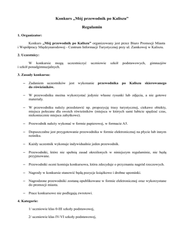 Konkurs „Mój przewodnik po Kaliszu” Regulamin 1. Organizator: Konkurs „Mój przewodnik po Kaliszu” organizowany jest przez Biuro Promocji Miasta i Współpracy Międzynarodowej - Centrum Informacji Turystycznej przy ul. Zamkowej w Kaliszu. 2. Uczestnicy: W konkursie mogą i szkół ponadgimnazjalnych. uczestniczyć uczniowie szkół podstawowych, gimnazjów 3. Zasady konkursu: – Zadaniem uczestników jest wykonanie przewodnika po Kaliszu skierowanego do rówieśników. – W przewodniku można wykorzystać jedynie własne rysunki lub zdjęcia, a nie gotowe materiały. – W przewodniku należy przedstawić np. propozycję trasy turystycznej, ciekawe obiekty, miejsca polecane dla swoich rówieśników (miejsca w których sami lubicie spędzać czas, niekoniecznie miejsca zabytkowe). – Przewodnik należy wykonać w formie papierowej, w formacie A5. – Dopuszczalne jest przygotowanie przewodnika w formie elektronicznej na płycie lub innym nośniku. – Każdy uczestnik wykonuje indywidualnie jeden przewodnik. – Przewodniki, które nie spełnią zasad określonych w niniejszym regulaminie, nie będą przyjmowane. – Przewodniki oceni komisja konkursowa, która zdecyduje o przyznaniu nagród rzeczowych. – Nagrody w konkursie stanowić będą pozycje książkowe i drobne upominki. – Nagrodzone przewodniki zostaną opublikowane w formie elektronicznej oraz wykorzystane do promocji miasta. – Prace konkursowe nie podlegają zwrotowi. 4. Kategorie: 1/ uczniowie klas 0-III szkoły podstawowej, 2/ uczniowie klas IV-VI szkoły podstawowej, 3/ uczniowie gimnazjów, 4/ uczniowie szkół ponadgimnazjalnych. 5. Kryteria oceny: 1/ pomysłowość zawartości merytorycznej, 2/ oryginalne wykonanie, 3/ rzetelność zawartych w przewodniku informacji. 6. Terminy 1/ Przewodnik należy dostarczyć do Centrum Informacji Turystycznej w Kaliszu przy ulicy Zamkowej do 25 lutego 2014r. Nieodłącznym elementem przewodnika jest metryczka pracy (wzór – załącznik do regulaminu). 2/ Rozstrzygnięcie konkursu nastąpi 27 lutego 2014r., o godz. 15:30 w Centrum Informacji Turystycznej przy ul. Zamkowej. Wówczas wręczone zostaną nagrody za najlepsze prace. Lista laureatów będzie opublikowana na stronach internetowych: www.kalisz.pl, www.cit.kalisz.pl. 7. Dodatkowe warunki: 1/ Sprawy nie objęte regulaminem rozstrzyga organizator konkursu. Kalisz, dn. 06.02.2015r. Załącznik do Regulaminu konkursu „Mój przewodnik po Kaliszu” Metryczka pracy Imię i Nazwisko Wiek Klasa Telefon kontaktowy Oświadczam, że zapoznałem/ am się z regulaminem konkursu „Mój przewodnik po Kaliszu” i bez zastrzeżeń przyjmuję jego postanowienia. Wyrażam zgodę na przetwarzanie moich (mojego dziecka) danych osobowych przez organizatora na potrzeby konkursu zgodnie z Ustawą o ochronie danych osobowych z dnia 29 sierpnia 1997r. Podpis uczestnika, a w przypadku osób niepełnoletnich - rodzica lub opiekuna prawnego