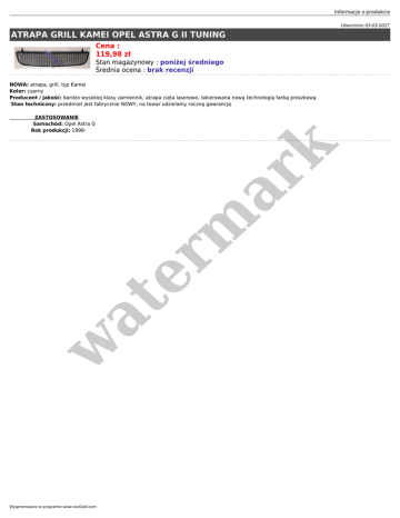 Informacje o produkcie Utworzono 03-03-2017 ATRAPA GRILL KAMEI OPEL ASTRA G II TUNING Cena : 119,98 zł Stan magazynowy : poniżej średniego Średnia ocena : brak recenzji NOWA: atrapa, grill. typ Kamei Kolor: czarny Producent / jakość: bardzo wysokiej klasy zamiennik, atrapa cięta laserowo, lakierowana nową technologią farbą proszkową Stan techniczny: przedmiot jest fabrycznie NOWY, na towar udzielamy roczną gwarancję w at er m ar k ZASTOSOWANIE Samochód: Opel Astra G Rok produkcji: 1998- Wygenerowano w programie www.oscGold.com