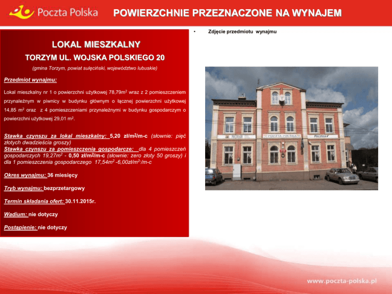 POWIERZCHNIE PRZEZNACZONE NA WYNAJEM LOKAL MIESZKALNY TORZYM UL. WOJSKA POLSKIEGO 20 (gmina Torzym, powiat sulęciński, województwo lubuskie) Przedmiot wynajmu: Lokal mieszkalny nr 1 o powierzchni użytkowej 78,79m2 wraz z 2 pomieszczeniem przynależnym w piwnicy w budynku głównym o łącznej powierzchni użytkowej 14,85 m2 oraz z 4 pomieszczeniami przynależnymi w budynku gospodarczym o powierzchni użytkowej 29,01 m2. Stawka czynszu za lokal mieszkalny: 5,20 zł/m2/m-c (słownie: pięć złotych dwadzieścia groszy) Stawka czynszu za pomieszczenia gospodarcze: dla 4 pomieszczeń gospodarczych 19,27m2 - 0,50 zł/m2/m-c (słownie: zero złoty 50 groszy) i dla 1 pomieszczenia gospodarczego 17,54m2 -6,00zł/m2-/m-c Okres wynajmu: 36 miesięcy Tryb wynajmu: bezprzetargowy Termin składania ofert: 30.11.2015r. Wadium: nie dotyczy Postąpienie: nie dotyczy • Zdjęcie przedmiotu wynajmu Kliknij i zlokalizuj na mapie Opis przedmiotu wynajmu: Pokoje nr 1, 2, 3 Lokal mieszkalny usytuowany jest na I piętrze i poddaszu, budynku stanowiącego własność Poczty Polskiej S.A. składa się z 4 izb, o łącznej powierzchni użytkowej 78,79 m², w tym powierzchni pokoi 54,43 m² (1 pokój 22,52 m², 2 pokój 19,45 m² , 3 pokój 12,46 m²), kuchni 10,67 m², łazienki 6,39 m², wc 1,08 m², przedpokój 0,64 m² , korytarz 5,58 m². Lokal wyposażony jest w instalacje: elektryczną, wodną (miejską), kanalizacyjną (miejską), system centralnego ogrzewania – własna kotłownia gazowa Niezależnie od czynszu Najemca będzie ponosił opłaty za : •powierzchnię dodatkową 0,50 zł/m² x 19,27m2 = 9,64 zł miesięcznie netto, •powierzchnię dodatkową 6,00 zł/m² x 17,54m2 = 105,24zł miesięcznie netto, •Kuchnia, Łazienka,wc, budynek gospodarczy •centralne ogrzewanie w formie zaliczki miesięcznie w wysokości:3,23zł/m2 netto x 78,79m3/m2 =254,49zł netto + podatek VAT (wg obowiązującej stawki), •dostarczanie wody zimnej (według odczytu wodomierzy/2,75 zł/m3 netto …..m3 = …… zł netto + podatek VAT (wg obowiązującej stawki), x •odprowadzanie ścieków (według odczytu wodomierzy /4,58zł/m3 netto ……m3 = …….. zł netto + podatek VAT(wg obowiązującej stawki , x •energia elektryczna,odbiór odpadów stałych w ramach samodzielnie podpisanych umów z usługodawcami, •brak bieżącej ciepłej wody. Wytworzenie we własnym zakresie Opis nieruchomości: Miejscowość Torzym Ulica, nr budynku Wojska Polskiego 20 Powierzchnia budynku, w których zlokalizowany jest przedmiot wynajmu 484,48m2 Nr działki ewidencyjnej, obręb 96, 0073Torzym Księga wieczysta, Sąd Rejonowy, Nr Wydziału GW1U/00016053/8 prowadzona przez Sąd Rejonowy w Sulęcinie Wydział Ksiąg Wieczystych Stan prawny gruntu Użytkowanie wieczyste stanowiące własność Poczty Polskiej S.A. Lokalizacja i dostępność komunikacyjna: Nieruchomość położona jest w Torzymiu, obręb Torzym przy ul. Wojska Polskiego 20 – w centrum miasta – w odległości około 5km od wjazdu na autostradę A2. Od północy i zachodu działka graniczy z nieruchomościami zabudowanymi budynkami mieszkalnymi,, od południa z droga krajową. Od strony wschodniej z ogrodem. Wzdłuż ulicy Wojska Polskiego dominuje zabudowa zwarta – budynki prywatne i użyteczności publicznej. Miejscowość dobrze skomunikowana z miastem powiatowym Sulęcin. • Mapa sytuacyjna miejscowości Opis nieruchomości: Nieruchomość zabudowana jest : budynkiem głównym i budynkiem gospodarczym •Zdjęcia budynków •Zdjęcia nieruchomości OBWIESZCZENIE O KONKURSIE OFERT NA NAJEM CZĘŚCI NIERUCHOMOŚCI Wynajmujący: POCZTA POLSKA S.A. z siedzibą w Warszawie, 00-940 Warszawa, ul. Rodziny Hiszpańskich 8 Prowadzący konkurs ofert: Poczta Polska S.A., Pion Infrastruktury Obszar Operacyjny ds. Nieruchomości w Poznaniu, ul. Głogowska 17, 60-943 Poznań. Miejsce składania ofert: Poczta Polska S.A. Pion Infrastruktury Obszar Operacyjny ds. Nieruchomości w Poznaniu, ul. Jagiellończyka 4, 66-400 Gorzów Wlkp. pokój nr 207 ogłasza konkurs ofert. Przedmiot najmu: Łączna powierzchnia użytkowa lokalu mieszkalnego wynosi – 78,79 m2. W pomieszczeniach lokalu zamontowane są grzejniki konwektorowe, płytowe. Stolarka okienna plastikowa i drewniana, oszklenie pełne. Drzwi wejściowe drewniane w stanie dobrym. Podłogi – w pokojach podłoga drewniana –deski sosnowe pokryte wykładziną w łazience płytki ceramiczne w stanie dobrym. Otynkowanie ścian i sufitów w stanie dobrym. Lokal wyposażony w instalacje: elektryczną, wodno-kanalizacyjną, wentylacyjną, centralnego ogrzewania z lokalnej kotłowni gazowej – wszystkie instalacje są sprawne. Ogólny stan techniczny lokalu dobry. Charakterystyka nieruchomości: Nieruchomość znajduje się w centrum miasta. W sąsiedztwie nieruchomości znajduje się zabudowa usługowo-handlowa, mieszkalna. Na parterze budynku znajduje się Urząd Pocztowy Torzym, na I piętrze inny lokal mieszkalny. Minimalna stawka czynszu netto: 5,20 zł/m2/m-c (słownie: pięć i 20/100 złotych) za 1 metr kwadratowy powierzchni mieszkalnej, 0,50 zł/m2/m-c (słownie: zero i 50/100 złotych) z za 1 metr kwadratowy dla 4 pomieszczeń gospodarczych o łącznej powierzchni 19,27m2 6,00 zł/m2/m-c (słownie: sześć i 00/100 złotych) z za 1 metr kwadratowy dla 1 pomieszczenia gospodarczego o łącznej powierzchni 17,54m2 Postąpienia: nie dotyczy Wadium: nie dotyczy Termin składania ofert: 30.11.2015r. Warunkiem przystąpienia do konkursu ofert jest: 1. Złożenie przez Oferenta pisemnej oferty zawierającej nazwę i adres oferenta, stawkę czynszu netto za 1 metr kwadratowy pow. lokalu mieszkalnego. 2. Ofertę należy przesłać w zamkniętej kopercie na adres: Poczta Polska S.A. Pion Infrastruktury, Obszar Operacyjny ds. Nieruchomości w Poznaniu Dział Administrowania Nieruchomościami i Konserwacji, ul. Jagiellończyka 4, 66-400 Gorzów Wlkp., pokój nr 207 z dopiskiem „Oferta – wynajem lokalu mieszkalne