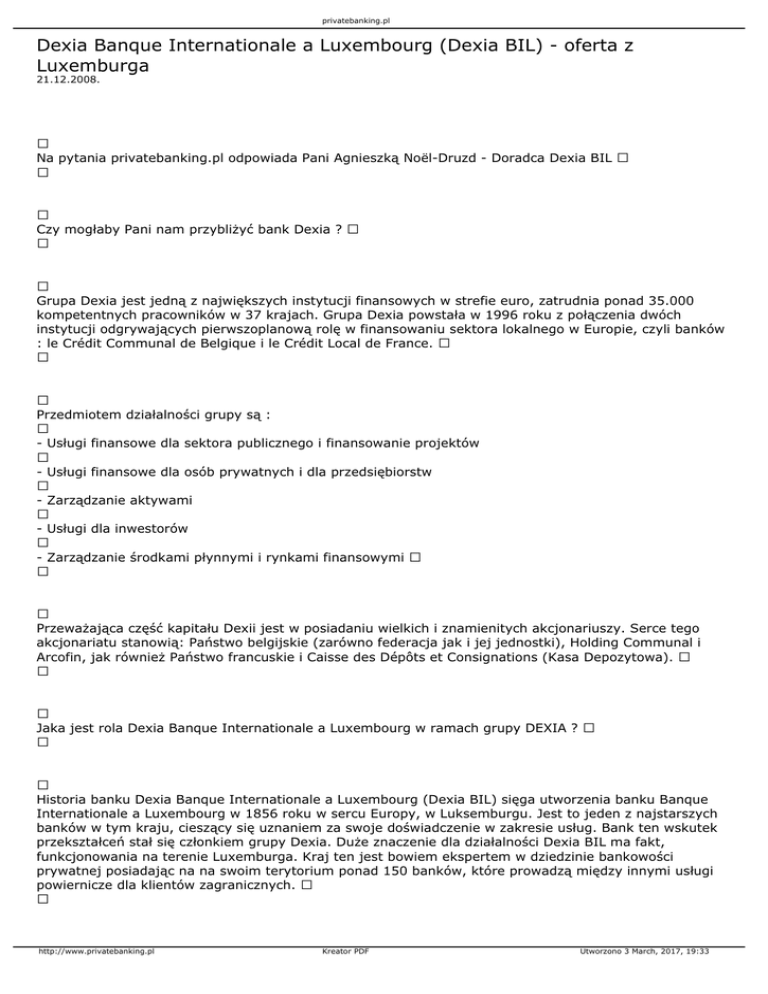 privatebanking.pl Dexia Banque Internationale a Luxembourg (Dexia BIL) - oferta z Luxemburga 21.12.2008. Na pytania privatebanking.pl odpowiada Pani Agnieszką Noël-Druzd - Doradca Dexia BIL Czy mogłaby Pani nam przybliżyć bank Dexia ? Grupa Dexia jest jedną z największych instytucji finansowych w strefie euro, zatrudnia ponad 35.000 kompetentnych pracowników w 37 krajach. Grupa Dexia powstała w 1996 roku z połączenia dwóch instytucji odgrywających pierwszoplanową rolę w finansowaniu sektora lokalnego w Europie, czyli banków : le Crédit Communal de Belgique i le Crédit Local de France. Przedmiotem działalności grupy są : - Usługi finansowe dla sektora publicznego i finansowanie projektów - Usługi finansowe dla osób prywatnych i dla przedsiębiorstw - Zarządzanie aktywami - Usługi dla inwestorów - Zarządzanie środkami płynnymi i rynkami finansowymi Przeważająca część kapitału Dexii jest w posiadaniu wielkich i znamienitych akcjonariuszy. Serce tego akcjonariatu stanowią: Państwo belgijskie (zarówno federacja jak i jej jednostki), Holding Communal i Arcofin, jak również Państwo francuskie i Caisse des Dépôts et Consignations (Kasa Depozytowa). Jaka jest rola Dexia Banque Internationale a Luxembourg w ramach grupy DEXIA ? Historia banku Dexia Banque Internationale a Luxembourg (Dexia BIL) sięga utworzenia banku Banque Internationale a Luxembourg w 1856 roku w sercu Europy, w Luksemburgu. Jest to jeden z najstarszych banków w tym kraju, cieszący się uznaniem za swoje doświadczenie w zakresie usług. Bank ten wskutek przekształceń stał się członkiem grupy Dexia. Duże znaczenie dla działalności Dexia BIL ma fakt, funkcjonowania na terenie Luxemburga. Kraj ten jest bowiem ekspertem w dziedzinie bankowości prywatnej posiadając na na swoim terytorium ponad 150 banków, które prowadzą między innymi usługi powiernicze dla klientów zagranicznych. http://www.privatebanking.pl Kreator PDF Utworzono 3 March, 2017, 19:33 privatebanking.pl Działalność Dexia BIL opiera się przede wszystkim na bankowości prywatnej. Bank jest wyspecjalizowany w tych usługach, związanych głównie z obsługą oszczędności i inwestycji dla zamożniejszych klientów indywidualnych i przedsiębiorców. Dexia BIL działa nie tylko lokalnie, ale rozwija też na arenie międzynarodowej, dla grupy Dexia, bankowość prywatną poprzez prowadzenie różnych placówek grupy w świecie (Bahrajn, Dania, Jersey, Księstwo Monako, Singapur, Szwajcaria, Urugwaj, i w formie spółki joint venture, Hiszpania). Jakie doświadczenie ma Dexia BIL w zakresie bankowości prywatnej ? W dziedzinie bankowości prywatnej Dexia BIL jest ekspertem w całościowym zarządzaniu majątkiem osób prywatnych. Bankowość prywatna łączy biegłość analizy majątku i planowanie finansowe, dla solidnego zarządzania portfelem i rzeczoznawstwa majątkowego. Działalność ta opiera się na nieugiętych wartościach : Odpowiedzialności, Jasności, Zaangażowaniu, osiąganiu wysokich Wyników i Przejrzystości. Dexia BIL poprzez plasowanie się na głównych miejscach wśród prywatnych banków Europy jest instytucją prestiżową. Oferuje ona wydajne rozwiązania w planowaniu majątkiem i inwestowaniu oszczędności zamożnych klientów indywidualnych. Dexia proponuje szeroką gamę dyskrecjonalnych rozwiązań zaadoptowanych do Waszych potrzeb w dziedzinie inwestycji i zarządzania portfelem. Jak krótko może Pani określić Państwo Waszą ofertę ? Myślę, że naszą największą wartością jest zespół wielokierunkowych, wysokokwalifikowanych i doświadczonych doradców w zarządzaniu majątkiem. Oferujemy pełną paletę usług z zakresu private banking. W szczególności obejmuje ona: pomoc w zarządzaniu i strukturacji majątku, wgłębną diagnostykę majątkową, indywidualne doradztwo i adekwatne rozwiązania, dzięki biegłości nabytej w międzynarodowej sieci swoich banków. Należy też podkreślić szczególną rolę tajemnicy bankowej i poufności, tak charakterystyczną dla Luxemburga. Czy możliwa jest obsługa polskich Klientów przez Dexia BIL ? Tak oczywiście, zainteresowane osoby proszę o bezpośredni kontakt: Agnieszka Noël-Druzd tel. 00352 45 90 50 23 email : [email protected] http://www.privatebanking.pl Kreator PDF Utworzono 3 March, 2017, 19:33 privatebanking.pl Dziękuję za rozmowę. Więcej informacji o Dexia BIL znaleźć też można bezpośrednio na stronie banku: www.dexia-bil.lu http://www.privatebanking.pl Kreator PDF Utworzono 3 March, 2017, 19:33