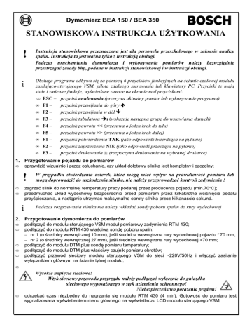 Dymomierz BEA 150 / BEA 350 STANOWISKOWA INSTRUKCJA UśYTKOWANIA ! Instrukcja stanowiskowa przeznaczona jest dla personelu przeszkolonego w zakresie analizy spalin. Instrukcja ta jest waŜna tylko z instrukcją obsługi. Podczas uruchamiania dymomierza i wykonywania pomiarów naleŜy bezwzględnie przestrzegać zasady bhp, podane w instrukcji stanowiskowej i w instrukcji obsługi. Obsługa programu odbywa się za pomocą 6 przycisków funkcyjnych na ścianie czołowej modułu zasilająco-sterującego VSM, pilota zdalnego sterowania lub klawiatury PC. Przyciski te mają stałe i zmienne funkcje, wyświetlane zawsze na ekranie nad przyciskami: • ESC – przycisk anulowania (przerywa aktualny pomiar lub wykonywanie programu) • F1 – przycisk przewijania do góry • F2 – przycisk przewijania w dół • F3 – przycisk tabulatora ı (wskazuje następną grupę do wstawiania danych) • F4 – przycisk powrotu << (przesuwa o jeden krok do tyłu) • F5 – przycisk powrotu >> (przesuwa o jeden krok dalej) • F1 – przycisk potwierdzenia TAK (jako odpowiedź twierdząca na pytanie) • F2 – przycisk zaprzeczenia NIE (jako odpowiedź przecząca na pytanie) • F3 – przycisk drukowania (rozpoczyna drukowanie na wybranej drukarce) i 1. Przygotowanie pojazdu do pomiarów • sprawdzić wizualnie i przez osłuchanie, czy układ dolotowy silnika jest kompletny i szczelny; ! • • W przypadku stwierdzenia usterek, które mogą mieć wpływ na prawidłowość pomiaru lub mogą doprowadzić do uszkodzenia silnika, nie naleŜy przeprowadzać kontroli zadymienia ! zagrzać silnik do normalnej temperatury pracy podanej przez producenta pojazdu (min.70°C); przedmuchać układ wydechowy bezpośrednio przed pomiarem przez kilkakrotne wciśnięcie pedału przyśpieszania, a następnie utrzymać maksymalne obroty silnika przez kilkanaście sekund. i Podczas rozgrzewania silnika nie naleŜy wkładać sondy poboru spalin do rury wydechowej 2. Przygotowanie dymomierza do pomiarów • • • • • podłączyć do modułu sterującego VSM moduł pomiarowy zadymienia RTM 430; podłączyć do modułu RTM 430 właściwą sondę poboru spalin: − nr 1 (o średnicy wewnętrznej 10 mm), jeśli średnica wewnętrzna rury wydechowej pojazdu ≤70 mm, − nr 2 (o średnicy wewnętrznej 27 mm), jeśli średnica wewnętrzna rury wydechowej >70 mm; podłączyć do modułu DTM plus sondę pomiaru temperatury; podłączyć do modułu DTM plus właściwy czujnik pomiaru obrotów; podłączyć przewód sieciowy modułu sterującego VSM do sieci ~220V/50Hz i włączyć zasilanie wyłącznikiem głównym na ścianie tylnej modułu; • Wysokie napięcie sieciowe! Wtyk sieciowy przewodu przyrządu naleŜy podłączać wyłącznie do gniazdka sieciowego wyposaŜonego w styk uziemienia ochronnego! Niebezpieczeństwo poraŜenia prądem! • odczekać czas niezbędny do nagrzania się modułu RTM 430 (4 min). Gotowość do pomiaru jest sygnalizowana wyświetleniem menu głównego na wyświetlaczu LCD modułu sterującego VSM; 3. Zainstalowanie oprzyrządowania pomiarowe obrotów i temperatury oleju silnika • wyjąć wskaźnik poziomu oleju i dopasować długość sondy temperatury oleju do długości wskaźnika przez przesuwanie gumowego korka z zaciskiem, a następnie wsunąć sondę w otwór wskaźnika i wcisnąć mocno korek w celu szczelnego zamknięcia otworu; Niebezpieczeństwo poparzenia! Nie naleŜy wyjmować wskaźnika poziomu oleju i wkładać sondy pomiaru temperatury oleju podczas pracy silnika! • podłączyć przewód elektryczny B-/B+ do biegunów akumulatora lub inny czujnik pomiaru obrotów; Niebezpieczeństwo urazu! Czynności związane z przyłączeniem czujników pomiaru obrotów na silniku samochodu wykonywać bardzo ostroŜnie, najlepiej przy wyłączonym silniku! 4. Kontrola zadymienia • w menu głównym wybrać Analiza spalin; • w menu Rodzaj badania wybrać program pomiarowy w zaleŜności od rodzaju silnika: − Silnik ZS wolnossący - kontrola zadymienia spalin silnika wolnossącego, − Silnik ZS turbo - kontrola spalin silnika z turbodoładowaniem, • wprowadzić dane identyfikacyjne pojazdu; • wprowadzić dane wymagane do oceny pomiaru, zgodnie z wyświetlanymi poleceniami (temperatura oleju, zakres obrotów jałowych i maksymalnych, zadymienie dopuszczalne k i nr sondy poboru spalin); • ustalić właściwą liczbę impulsów do pomiaru obrotów, aby wskazania odpowiadały rzeczywistej prędkości obrotowej biegu jałowego; • ustalić na podstawie pomiaru temperatury oleju, czy silnik jest nagrzany do normalnej temperatury pracy (min. 70ºC); • ustalić na podstawie pomiarów obroty biegu jałowego i obroty maksymalne; • przedmuchać układ wydechowy bezpośrednio przed pomiarem przez kilkakrotne wciśnięcie pedału przyśpieszania, a następnie utrzymać maksymalne obroty silnika przez kilkanaście sekund; • wsunąć sondę poboru spalin w prostoliniowy odcinek rury wydechowej, moŜliwie centrycznie, na głębokość równą co najmniej 3 średnicom wewnętrznym rury wydechowej, lecz nie mniej niŜ 300 mm; i • w przypadku stosowania wyciągów spalin końcówka odsysająca spaliny nie powinna być ustawiona za blisko rury wydechowej, poniewaŜ moŜe to spowodować powstanie podciśnienia w rurze wydechowej i zafałszowanie wyników pomiaru przeprowadzić pomiary zadymienia, wykonując kolejno swobodne przyspieszenia od obrotów jałowych do maksymalnych, zgodnie z komunikatami, wyświetlanymi na ekranie modułu sterującego VSM; Niebezpieczeństwo uduszenia i zatrucia ! Spaliny są trujące! W przypadku pracy w pomieszczeniach zamkniętych konieczne jest intensywne przewietrzanie lub odprowadzanie spalin na zewnątrz pomieszczenia! Niebezpieczeństwo poparzenia dróg oddechowych ! Do analizy spalin uŜywane są przewody do próbkowania spalin, które w razie podgrzania do temperatury powyŜej 250ºC lub w razie poŜaru uwalniają silnie Ŝrący gaz (fluorowodór)