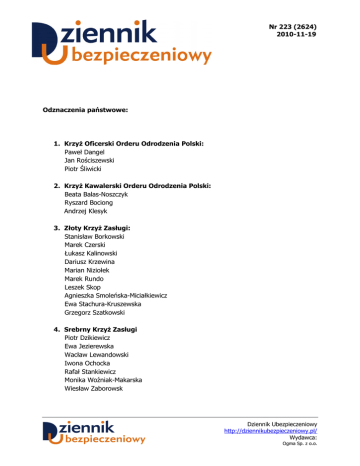 Nr 223 (2624) 2010-11-19 Odznaczenia państwowe: 1. Krzyż Oficerski Orderu Odrodzenia Polski: Paweł Dangel Jan Rościszewski Piotr Śliwicki 2. Krzyż Kawalerski Orderu Odrodzenia Polski: Beata Balas-Noszczyk Ryszard Bociong Andrzej Klesyk 3. Złoty Krzyż Zasługi: Stanisław Borkowski Marek Czerski Łukasz Kalinowski Dariusz Krzewina Marian Niziołek Marek Rundo Leszek Skop Agnieszka Smoleńska-Miciałkiewicz Ewa Stachura-Kruszewska Grzegorz Szatkowski 4. Srebrny Krzyż Zasługi Piotr Dzikiewicz Ewa Jezierewska Wacław Lewandowski Iwona Ochocka Rafał Stankiewicz Monika Woźniak-Makarska Wiesław Zaborowsk Dziennik Ubezpieczeniowy http://dziennikubezpieczeniowy.pl/ Wydawca: Ogma Sp. z o.o. 2 5. Brązowy Krzyż Zasługi Andrzej Gładysz Maciej Piankowski Hanna Karczewska-Czyż Andrzej Kinal Zygmunt Kostkiewicz Jarosław Piątkowski Konrad Rojewski Adam Uszpolewicz Anna Włodarczyk-Moczkowska Lista nagrodzonych przez PIU za zasługi dla ubezpieczeń: Anita Bogusz Marcin Borowiec Grzegorz Buczkowski Tomasz Chełmicki Krystyna Chodnicka Halina Cieślak Sława Cwalińska-Weychert Andrzej Czub Robert Dąbrowski Joanna Domańska Ryszard Domański Wacław Drozdowicz Mario Everado Zamarripa Gonzalez Thierry Jeantet Jacek Jurzyk Magdalena Kampowska Małgorzata Knut Jacek Kugacz Mariusz Kulig Dariusz Kwiatkowski Jean Bertrand Laroche Katarzyna Lewandowska Agnieszka Lewandowska Janusz Lipiński Eric Lombard Marek Łepik Michał Makarczyk Zbigniew Mikulski Jacek Nowotarski Iwona Ochocka Dziennik Ubezpieczeniowy http://dziennikubezpieczeniowy.pl/ Wydawca: Ogma Sp. z o.o. 3 Jacek Ojrzyński Elwira Ostrowska-Graczyk Ryszarda Otto Adam H. Pustelnik Robert Pusz Jan Rejdych Katarzyna Rubel Katarzyna Rudzka Anna Sitek Grażyna Sudzińska-Amroziewicz Elżbieta Szambelan-Bakuła Piotr Szczepiórkowski Bogdan Szymczak Pierre de Villeneuve Agnieszka Wieczorek-Nowak Stanisław Wlazło Elżbieta Wojciechowska Ilona Wolszleger-Dunajska Ewa Woźniak Ambroży Wójcik Elżbieta Wójcik Paweł Zylm Wojciech Żernicki Dziennik Ubezpieczeniowy http://dziennikubezpieczeniowy.pl/ Wydawca: Ogma Sp. z o.o.