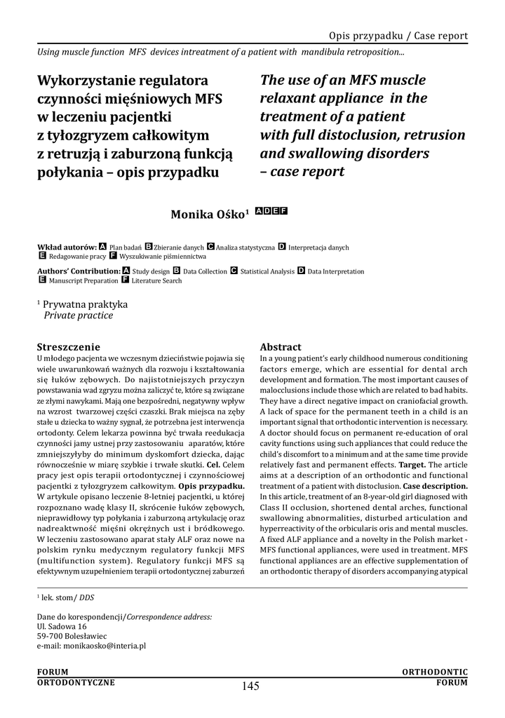 Opis przypadku / Case report Using muscle function MFS devices intreatment of a patient with mandibula retroposition... The use of an MFS muscle relaxant appliance in the treatment of a patient with full distoclusion, retrusion and swallowing disorders – case report Wykorzystanie regulatora czynności mięśniowych MFS w leczeniu pacjentki z tyłozgryzem całkowitym z retruzją i zaburzoną funkcją połykania – opis przypadku Monika Ośko1 AD E F Wkład autorów: A Plan badań B Zbieranie danych C Analiza statystyczna D Interpretacja danych E Redagowanie pracy F Wyszukiwanie piśmiennictwa Authors’ Contribution: A Study design B Data Collection C Statistical Analysis D Data Interpretation E Manuscript Preparation F Literature Search 1 Prywatna praktyka Private practice Streszczenie U młodego pacjenta we wczesnym dzieciństwie pojawia się wiele uwarunkowań ważnych dla rozwoju i kształtowania się łuków zębowych. Do najistotniejszych przyczyn powstawania wad zgryzu można zaliczyć te, które są związane ze złymi nawykami. Mają one bezpośredni, negatywny wpływ na wzrost twarzowej części czaszki. Brak miejsca na zęby stałe u dziecka to ważny sygnał, że potrzebna jest interwencja ortodonty. Celem lekarza powinna być trwała reedukacja czynności jamy ustnej przy zastosowaniu aparatów, które zmniejszyłyby do minimum dyskomfort dziecka, dając równocześnie w miarę szybkie i trwałe skutki. Cel. Celem pracy jest opis terapii ortodontycznej i czynnościowej pacjentki z tyłozgryzem całkowitym. Opis przypadku. W artykule opisano leczenie 8-letniej pacjentki, u której rozpoznano wadę klasy II, skrócenie łuków zębowych, nieprawidłowy typ połykania i zaburzoną artykulację oraz nadreaktwność mięśni okrężnych ust i bródkowego. W leczeniu zastosowano aparat stały ALF oraz nowe na polskim rynku medycznym regulatory funkcji MFS (multifunction system). Regulatory funkcji MFS są efektywnym uzupełnieniem terapii ortodontycznej zaburzeń 1 lek. stom/ DDS Dane do korespondencji/Correspondence address: Ul. Sadowa 16 59-700 Bolesławiec e-mail: [email protected] Abstract In a young patient’s early childhood numerous conditioning factors emerge, which are essential for dental arch development and formation. The most important causes of malocclusions include those which are related to bad habits. They have a direct negative impact on craniofacial growth. A lack of space for the permanent teeth in a child is an important signal that orthodontic intervention is necessary. A doctor should focus on permanent re-education of oral cavity functions using such appliances that could reduce the child’s discomfort to a minimum and at the same time provide relatively fast and permanent effects. Target. The article aims at a description of an orthodontic and functional treatment of a patient with distoclusion. Case description. In this article, treatment of an 8-year-old girl diagnosed with Class II occlusion, shortened dental arches, functional swallowing abnormalities, disturbed articulation and hyperreactivity of the orbicularis oris and mental muscles. A fixed ALF appliance and a novelty in the Polish market MFS functional appliances, were used in treatment. MFS functional appliances are an effective supplementation of an orthodontic therapy of disorders accompanying atypical ForumOrthodontic Ortodontyczneforum 145 Opis przypadku / Case report M. Ośko towarzyszących atypowemu połykaniu. Mogą być narzędziem lekarza w terapii pacjentów. Stanowią alternatywę dla tradycyjnych metod usprawniania funkcji warg i języka u pacjentów. Wymuszają długotrwałą, pożądaną w terapii pracę poszczególnych mięśni zespołu ustno-twarzowego. (Ośko M. Wykorzystanie regulatora czynności mięśniowych MFS w leczeniu pacjentki z tyłozgryzem całkowitym z retruzją i zaburzoną funkcją połykania – opis przypadku. Forum Ortod 2015; 11: 145-53). swallowing. They may become an orthodontist’s tool for patients’ treatment. They constitute an alternative for traditional methods of re-education of lip and tongue functions in patients. They force long-term desired in therapy work of individual muscles of the orofacial complex. (Ośko M. The use of an MFS muscle relaxant appliance in the treatment of a patient with full distoclusion, retrusion and swallowing disorders - case description. Orthod Forum 2015; 11: 145-53). Nadesłano: 10.08.2014 Przyjęto do druku: 26.06.2015 Received: 10.08.2014 Accepted: 26.06.2015 Wprowadzenie Introduction Słowa kluczowe: regulator funkcji MFS, dysfunkcja połykania, skrócony łuk zębowy W XX wieku rozwój ortodoncji i związanej z nią technologii pozwoliły na rozwiązywanie wielu problemów dotyczących wad zgryzu. Często jednak postawienie właściwej diagnozy jest trudne, bo z reguły są one wynikiem działania wielu czynników, które dodatkowo mogą na siebie wpływać, tworząc efekt synergii. Już we wczesnym dzieciństwie pojawia się wiele uwarunkowań istotnych dla rozwoju i kształtowania się łuków zębowych u młodego pacjenta. Do najistotniejszych przyczyn wad zgryzu można zaliczyć te związane ze złymi nawykami: nieprawidłową pozycją dziecka podczas snu czy karmienia, przetrwałym niemowlęcym typem połykania, oddychaniem przez usta, przerostem migdałków. Są to problemy przyczynowe, lekceważone nie tyle przez lekarza, ile przez pacjenta i rodziców. Zaburzenia oddychania, połykania i wzorca żucia mają bezpośredni wpływ na wzrost twarzowej części czaszki i dlatego celem leczenia ortodontycznego powinna być także trwała reedukacja czynności narządu żucia (1, 2). Zaprogramowana stymuloterapia, stworzona przez profesora Jose Durana von Arx, szefa Departamentu Ortodoncji na Uniwersytecie w Barcelonie, jest nową metodą reedukacji funkcji jamy ustnej, takich jak oddychanie, połykanie oraz wzorców żucia. Może być wykorzystana do normalizacji tych funkcji u pacjentów ze stałymi i zdejmo