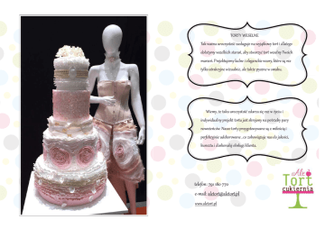 !!!!!!!!!!!!!!!!!!!!!!!!!!!!!!!!!!TORTY!WESELNE! Tak!ważna!uroczystość!zasłKgKje!na!wyjątkowy!tor3!i!dlatego! dołożyPy!wszelkich!starań,!aby!stUorzyć!tor3!weselny!Twoich! marzeń.!ProjektKjemy!ładne!i!eleganckie!wzorW,!które!są!nie! tWlko!atYakcyjne!wizualnie,!ale!także!pyszne!w!smaku.!! !!!! !!!!!!Wiemy,!że!taka!uroczystość!zdarza!się!raz!w!życiu!i! indyUidualny!projekt!tor3K!jest!skrojony!na!potYzeby!parW! nowożeńców.!Nasze!tor3W!przygotowyUane!są!z!miłością!i! perfekcyjnie!udekorowane!,!co!zobowiązuje!nas!do!jakości,! kunsztK!i!doskonałej!obsłKgi!klienta. !!!!!!!!!!!telefon:!791!180!770! !!!!!!!!!!e.mail:[email protected]! !!!!!!!!!!!www.aletor3.pl! !!!!!!!!!!!!!!!!!!!!!!!!!!!!!CENNIK!TORTÓW! Cena!jednej!porcji!naszego!tor:;!zaczy=a!się!od!10!zł.! Przy!bardziej!skomplikowanych!i!pracochłonnych! wzorach!cena!porcji!może!być!większa. Nasze!ciasta!smakują!tak!dobrze!jak!wyglądają.! Zawsze!użyOamy!najlepszych!i!najświeższych!składników.! Proponujemy!duży!wybór!nadzień!i!smaków,!a!każde!z! naszych!ciast!jest!świeże,!zrobione!na!miejscu,!przez!nas,! ręcznie.!Jeśli!nie!wiesz!jakie!wybrać…!zawsze!możemy!Ci! doradzić. !!!!!!!!!!!telefon:!791!180!770! !!!!!!!!!!!e[mail:!aletor:@aletor:.pl! !Biszkopt*:!!!!!!!!!!!!!!!!!!!!!!!!Nadzienia:!!!!! !!!!!!!!Waniliowy!!!!!!!!!!!!!!!!!!!Krem!Śmietankowy!!!!!!!!!!!!! !!!!!!!!Czekoladowy!!!!!!!!!!!!!!Krem!Czekoladowy!!!!!!!!!!!!!!! !!!!!!!!Pomarańczowy!!!!!!!!!!!Krem!Tiramisu!!!!!!!!!!!!!!!!!!!!! !!!!!!!!Cy?@*Aowy!!!!!!!!!!!!!!!!!!!Krem!Malinowy!!!!!!!!!!! Wszystkie!ciasta!mogą!być!odbierane!z!naszej!pracowni!w! Warszawie.!IstAieje!możliwość!dostarczenia!produktT!pod! wskazany!adres.! Cena!dostawy!do!miejscowości!w!WojewództVie!Mazowieckim!=! 2,5!zł/km !!!!!!!!!!!telefon:!791!180!770! !!!!!!!!!!eImail:!aletor?@aletor?.pl! !!!!!!!!!!!!www.aletor?.pl! Zestawy!muffinek!stanowią!wspaniałą!alter@atABę!dla!tor3ów! i!ciast!okolicznościowych,!gdyż!nie!tMzeba!ich!kroić!i!dają! większe!możliwości!przygotowania!niepowtarzalnych! dekoracji.!Nasi!Klienci!często!decydują!się!na!takie! kompozycje!jako!uzupeł@ienie!klasycznego!tor3S.! !!!Ceny:! !!!!!!!!!!!!!!!!!!!!!!!!!!!!!!!!!!!z!kremem!7!zł! z!małAUi!kwiatkami,!serduszkami,!perełkami!na!kremie!10!zł! z!małAUi!kwiatkami,!serduszkami,!na!krążku!12,5!zł! !!!!!!!!!!!telefon:!791!180!770! !!!!!!!!!!e.mail:[email protected]! !!!!!!!!!!!!www.aletor3.pl! !!!!!!!!!!!telefon:!791!180!770! !!!!!!!!!e.mail:[email protected]! !!!!!!!!!www.aletor3.pl