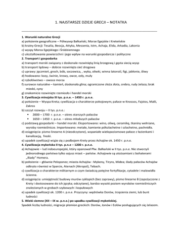 1. NAJSTARSZE DZIEJE GRECJI – NOTATKA _________________________________________________________________________________ 1. Warunki naturalne Grecji a) położenie geograficzne – Półwysep Bałkaoski, Morze Egejskie i Kreteoskie b) krainy Grecji: Tesalia, Beocja, Attyka, Messenia, Istm, Achaja, Elida, Arkadia, Lakonia c) wyspy Morza Egejskiego i Śródziemnego c) ukształtowanie powierzchni i jego wpływ na warunki gospodarcze i polityczne 2. Transport i gospodarka a) transport morski związany z doskonale rozwiniętą linią brzegową i gęsta siecią wysp b) transport lądowy – dobrze rozwinięta sied drogowa c) uprawy: jęczmieo, groch, bób, soczewica, , wyka, oliwki, winna latorośl, figi, jabłonie, śliwy d) hodowano: kozy, świnie, krowy, owce, osły, muły e) rybołówstwo – owoce morza f) surowce naturalne – kamieo, doskonała glina; ograniczone złoża złota, srebra, rudy żelaza; brak miedzi, cyny g) znakomicie rozwinięte rzemiosło i handel morski 3. Cywilizacja minojska III tys. p.n.e. – 1450 r. p.n.e. a) położenie – Wyspa Kreta; cywilizacja o charakterze pokojowym; pałace w Knossos, Fajstos, Malii, Zakros b) szczyt rozwoju – II tys. p.n.e.: 2000 – 1700 r. p.n.e. – okres starszych pałaców 1650 – 1450 r. p.n.e. – okres młodszych pałaców c) podstawą gospodarki – handel morski. Eksportowano: wino, oliwę, ceramikę, tkaniny wełniane, wyroby rzemieślnicze. Importowano: metale, kamienie półszlachetne i szlachetne, pachnidła. d) osiągnięcia: pismo linearne A (nieodczytane), wspaniałe wielopoziomowe pałace z łazienkami i kanalizacją, freski. e) upadek cywilizacji wiąże się z podbojem Krety przez Achajów ok. 1450 r. p.n.e. 4. Cywilizacja mykeńska II tys. p.n.e – 1200 r. p.n.e. a) Achajowie – lud indoeuropejski, który opanował Płw. Bałkaoski w II tys. p.n.e. Nie stworzyli jednorodnego paostwa tylko sojusz miast – paostw. Achajowie są utożsamiani z bohaterami „Iliady” Homera. b) położenie – głównie Peloponez; miasta Achajów : Mykeny, Tiryns, Midea; ślady pałaców Achajów odkryto również w Sparcie, Atenach (Akropol), Tebach. c) cywilizacja o charakterze militarnym o czym świadczą potężne fortyfikacje, cytadele i malowidła ścienne. d) osiągnięcia: umiejętnośd budowy murów cyklopich (bez zaprawy), pismo linearne B (zapożyczone z Krety i dostosowane do ich języka; odczytane), bardzo wysoki poziom wyrobów rzemieślniczych znalezionych w grobach szybowych i kopułowych e) upadek cywilizacji ok. 1200 r. p.n.e. Przyczyny: wędrówka Dorów, trzęsienia ziemi, lub bunt ludności 5. Wieki ciemne (XII – IX w. p.n.e.) po upadku cywilizacji mykeńskiej. Spadek liczby ludności, migracje plemion greckich: Dorów, Jonów i Eolów posługujących się żelazem.