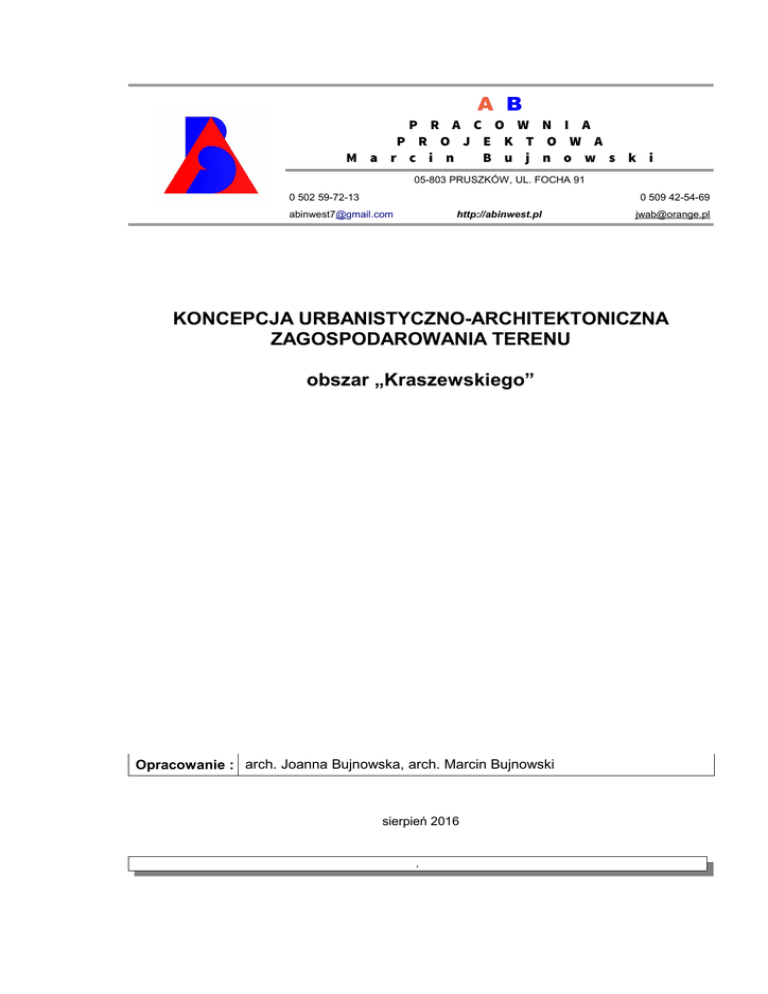 A B P R A C O W N I A P R O J E K T O W A M a r c i n B u j n o w s k i 05-803 PRUSZKÓW, UL. FOCHA 91 0 502 59-72-13 0 509 42-54-69 [email protected] http://abinwest.pl [email protected] KONCEPCJA URBANISTYCZNO-ARCHITEKTONICZNA ZAGOSPODAROWANIA TERENU obszar „Kraszewskiego” Opracowanie : arch. Joanna Bujnowska, arch. Marcin Bujnowski sierpień 2016 , Koncepcja urbanistyczno-architektoniczna zagospodarowania terenu – obszar „Kraszewskiego” OPIS KONCEPCJI URBANISTYCZNO-ARCHITEKTONICZNEJ ZAGOSPODAROWANIA TERENU obszar „Kraszewskiego” Lokalizacja : Pruszków, teren ograniczony ulicami : Kraszewskiego ( wraz z działką nr 472/8), Lipową, Kopernika, Hubala Zamawiający : Gmina Miasto Pruszków ul. Kraszewskiego 14/16, 05-800 Pruszków Wykonawca : „AB Pracownia Projektowa Marcin Bujnowski” ul. Focha 91, 05-803 Pruszków Zespół projektowy ● ● arch. Joanna Bujnowska arch. Marcin Bujnowski BŁ/299/94, MA-0118 1. Przedmiot koncepcji projektowej : Przedmiotem koncepcji urbanistyczno-projektowej jest uporządkowanie fragmentu przestrzeni miejskiej obszaru „Kraszewskiego” wraz z propozycją wizji nowej przestrzeni publicznej . 2. Stan istniejący Teren określony w koncepcji obszarem „Kraszewskiego” znajduje się w ścisłym centrum Pruszkowa. Zlokalizowany jest w obrębie ulic Kraszewskiego, Hubala, Kopernika i Lipowej. Do obszaru zalicza się też plac przed Powiatowa i Miejska Publiczną Biblioteką. Na południową część obszaru składają się działki ,należące do instytucji publicznych (Komendy Powiatowej Policji, Urzędu Miasta i Gminy Pruszków, Poradni Zdrowia Psychicznego i Sądu Rejonowego). W północnej części znajdują się tereny należące do Pruszkowskiej Spółdzielni Mieszkaniowej z wielorodzinnymi budynkami mieszkalnymi i zespołem pawilonów handlowych. Obecne podziały terenów oraz sposób ich zabudowy wpłynęły na wyizolowanie strefy mieszkalnej i usług przy ul. Kopernika od strefy ul. Kraszewskiego. Działki przynależne do instytucji państwowych stanowią zamknięte enklawy niedostępne dla mieszkańców poza godzinami pracy urzędów, co dodatkowo utrudnia komunikację mieszkańcom pomiędzy obydwoma strefami obszaru (północną i południową). Na terenie obszaru „Kraszewskiego” znajduje się dużo wartościowych, starych drzew, które tylko w obrębie ul. Kraszewskiego są prawidłowo wyeksponowane. Przestronny ciąg pieszy po pólnocnej stronie ulicy Kraszewskiego z licznymi pozostawionymi drzewami jest w dysonansie z południową stroną ulicy z wąskim chodnikiem i ciągiem zaparkowanych samochodów. W zamierzeniu ulica, która miała być deptakiem miejskim stała się na całej swej długości parkingiem. Pozostały drzewostan tego obszaru ukryty jest na parkingach instytucji publicznych i na zapleczach garażowych zlokalizowanych za budynkami mieszkalnymi. Tereny zielone i zachowany drzewostan to niewątpliwie duża wartość tego obszaru. Pozyskanie jej dla przestrzeni publicznej może stanowić o jej niepowtarzalnej jakości w szczególności w odniesieniu do obecnego trendu wyposażania w usługi i mieszkalnictwo każdej wolnej przestrzeni miejskiej. 3. Założenia koncepcyjne a) przeciwstawienie się komercyjnej zasadzie zabudowywania każdej wolnej przestrzeni usługami bądż budynkami mieszkalnymi na rzecz odzyskania naturalnych i bliskich człowiekowi stref zielonych. b) stworzenie nowej przestrzeni miejskiej – skweru deptaka na osi dwóch fontann, istniejącej przy Bibliotece Miejskiej „ fontanny – kamień” i projektowanej bliźniaczej fontanny „kamień– bis” przy ul. Kopernika c) powiązanie wyizolowanej dotąd przestrzeni handlowej ul. Kopernika z przestrzenią ul. Kraszewskiego d) generalna modernizacja układu miejsc postojowych w opracowanym obszarze Koncepcja urbanistyczno-architektoniczna zagospodarowania terenu – obszar „Kraszewskiego” „Kraszewskiego” e) poprawienie i ujednolicenie estetyki budynków w pierzejach ulic Kraszewskiego, Kopernika i Lipowej wraz z uporządkowaniem obszaru w zakresie zabudowań gospodarczych i garażowych 4. Tereny i działki przynależące do obszaru „Kraszewskiego” objęte opracowaniem opis proponowanych zmian a) placyk i ulica Kraszewskiego w strefie Biblioteki Miejskiej ◊ Likwidacja części istniejących miejsc postojowych przy ulicy od strony Biblioteki Miejskiej na całej szerokości projektowanego skweru ( likwidacja ok. 18 m.p.). Miejsca postojowe zorganizowane w tym miejscu w większości służą zaspokojeniu potrzeb petentów Urzędu Miejskiego dla których jest przewidziany parking podziemny pod budynkiem Urzędu Miejskiego. ◊ Wizualne i funkcjonalne włączenie fragmentu ulicy Kraszewskiego w strefę ciągu pieszego. Na szerokości skweru fragment ulicy Kraszewskiego będzie nawiązywał poziomem i rodzajem nawierzchni do ciągu pieszego. Miejsce to wizualnie będzie tworzyło plac miejski, przez który będą przejeżdżać samochody. Z uwagi na brak usług w tym rejonie ruch pieszy jest w tym obszarze ograniczony do komunikacji wzdłuż ulicy. Ewentualna kolizja ruchu pieszego i przejeżdżających samochodów rozwiązana będzie przez ustawienie pachołków ograniczających niepożądany wjazd aut na teren ciągu pieszego. ◊ Modernizacja obecnego, promienistego układu alejek doprowadzających do fontanny przed Biblioteką Miejską i stworzenie większego, regularnego placyku przy fontannie. Podniesienie fragmentów trawników i ujęcie ich w betonowe murki o zróżnicowanej wysokości. Zastąpienie obecnych stylizowanych ławek parkowych siedziskami drewnianymi zorganizowanymi w oparciu o betonowe murki ograniczające trawniki. ◊ Proponowana jest modernizacja chodnika i miejsc postojowych w narożniku ulic Lipowej i Kraszewskiego. Wyniesiony podest chodnika przy parterze usługowym został zawężony w celu poszerzenia chodnika poniżej. b) Skwer miejski ◊ Generalnym założeniem koncepcji urbanistycznej obszaru „K