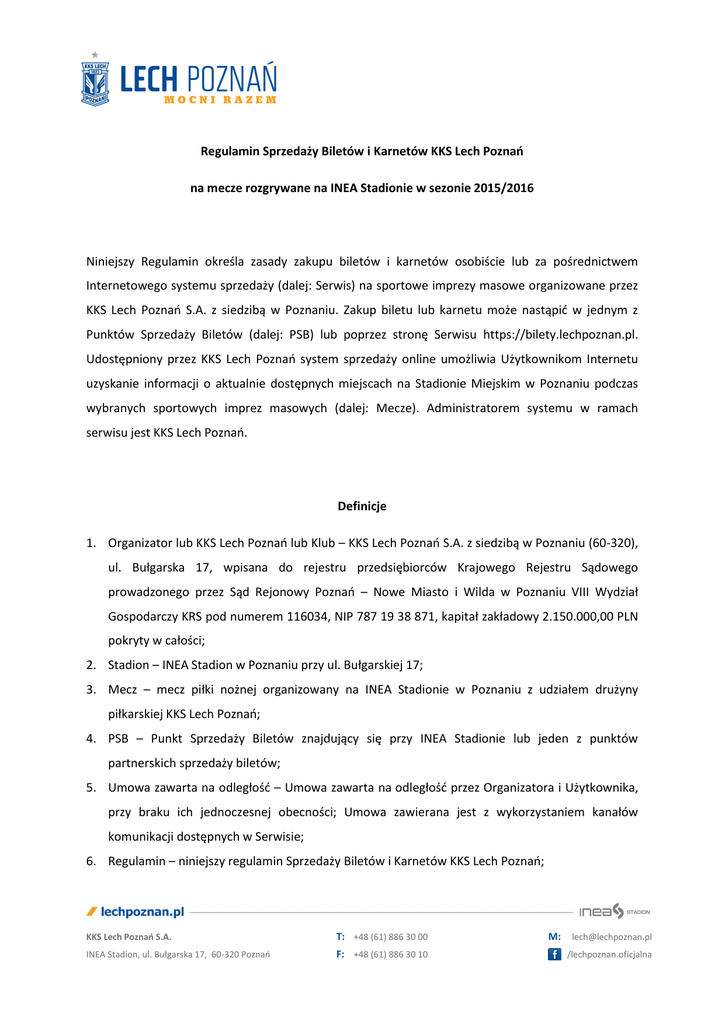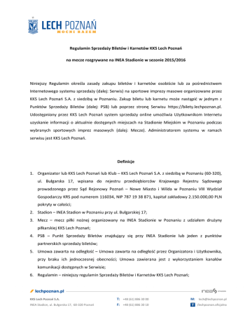 Regulamin Sprzedaży Biletów i Karnetów KKS Lech Poznań na mecze rozgrywane na INEA Stadionie w sezonie 2015/2016 Niniejszy Regulamin określa zasady zakupu biletów i karnetów osobiście lub za pośrednictwem Internetowego systemu sprzedaży (dalej: Serwis) na sportowe imprezy masowe organizowane przez KKS Lech Poznań S.A. z siedzibą w Poznaniu. Zakup biletu lub karnetu może nastąpić w jednym z Punktów Sprzedaży Biletów (dalej: PSB) lub poprzez stronę Serwisu https://bilety.lechpoznan.pl. Udostępniony przez KKS Lech Poznań system sprzedaży online umożliwia Użytkownikom Internetu uzyskanie informacji o aktualnie dostępnych miejscach na Stadionie Miejskim w Poznaniu podczas wybranych sportowych imprez masowych (dalej: Mecze). Administratorem systemu w ramach serwisu jest KKS Lech Poznań. Definicje 1. Organizator lub KKS Lech Poznań lub Klub – KKS Lech Poznań S.A. z siedzibą w Poznaniu (60-320), ul. Bułgarska 17, wpisana do rejestru przedsiębiorców Krajowego Rejestru Sądowego prowadzonego przez Sąd Rejonowy Poznań – Nowe Miasto i Wilda w Poznaniu VIII Wydział Gospodarczy KRS pod numerem 116034, NIP 787 19 38 871, kapitał zakładowy 2.150.000,00 PLN pokryty w całości; 2. Stadion – INEA Stadion w Poznaniu przy ul. Bułgarskiej 17; 3. Mecz – mecz piłki nożnej organizowany na INEA Stadionie w Poznaniu z udziałem drużyny piłkarskiej KKS Lech Poznań; 4. PSB – Punkt Sprzedaży Biletów znajdujący się przy INEA Stadionie lub jeden z punktów partnerskich sprzedaży biletów; 5. Umowa zawarta na odległość – Umowa zawarta na odległość przez Organizatora i Użytkownika, przy braku ich jednoczesnej obecności; Umowa zawierana jest z wykorzystaniem kanałów komunikacji dostępnych w Serwisie; 6. Regulamin – niniejszy regulamin Sprzedaży Biletów i Karnetów KKS Lech Poznań; KKS Lech Poznań S.A. T: +48 (61) 886 30 00 INEA Stadion, ul. Bułgarska 17, 60-320 Poznań F: +48 (61) 886 30 10 M: [email protected] /lechpoznan.oficjalna 7. Serwis – Elektroniczny System sprzedaży Biletów i Karnetów KKS Lech Poznań, służący także do zamawiania Karty Identyfikacyjnej; 8. Serwis PayU – serwis internetowy umożliwiający dokonywanie szybkich płatności (przelewów) internetowych prowadzony przez PayU SA z siedzibą w Poznaniu, 60-166 Poznań, przy ul. Grunwaldzkiej 182, wpisaną do rejestru przedsiębiorców prowadzonego przez Sąd Rejonowy w Poznaniu – Nowe Miasto i Wilda w Poznaniu, Wydział VIII Gospodarczy Krajowego Rejestru Sądowego pod numerem KRS 0000274399, o kapitale zakładowym w wysokości 4.000.000 PLN, w całości opłaconym, posiadająca numer identyfikacji podatkowej NIP: 779-23-08-495, REGON 300523444; 9. Klient – osoba, która zamierza dokonać lub która dokonała zakupu Biletu wstępu lub Karnetu na dany Mecz; 10. Użytkownik – Klient zarejestrowany w serwisie i posiadający Konto, do którego przypisane są login i hasło do Serwisu; 11. Konto – indywidualny panel administracyjny Użytkownika dostępny po dokonaniu rejestracji i zalogowaniu w Serwisie oznaczony loginem i hasłem, służący zawieraniu umów sprzedaży na odległość; 12. Rejestracja – proces polegający na utworzeniu przez Użytkownika Konta w Serwisie; 13. Zamówienie – złożona przez Użytkownika Organizatorowi za pośrednictwem Serwisu oferta zawarcia umowy Sprzedaży; 14. Karta Identyfikacyjna – karta MiFare wydana przez system kontroli dostępu funkcjonujący na INEA Stadionie w Poznaniu, umożliwiająca Uczestnikom wstęp na Stadion bez konieczności legitymowania się Biletem wstępu albo Karnetem, oznaczona imieniem i nazwiskiem, oraz numerem PESEL, a w razie gdy nie został on nadany – rodzajem, serią i numerem dokumentu potwierdzającego tożsamość; 15. Karta Płatnicza – specjalna karta płatnicza, wydawana przez Bank współpracujący z Organizatorem umożliwiająca Uczestnikom wstęp na Stadion bez konieczności legitymowania się Biletem albo Karnetem, oznaczona znakiem Organizatora, imieniem i nazwiskiem, oraz numerem PESEL, a w razie gdy nie został on nadany – rodzajem, serią i numerem dokumentu potwierdzającego tożsamość; KKS Lech Poznań S.A. T: +48 (61) 886 30 00 INEA Stadion, ul. Bułgarska 17, 60-320 Poznań F: +48 (61) 886 30 10 M: [email protected] /lechpoznan.oficjalna 16. Karnet – uprawnienie określonego Użytkownika do wejścia na Stadion, na przypisane mu miejsce, na wszystkie Mecze wyraźnie wskazane przez Organizatora w określonym okresie obowiązywania Karnetu; 17. Bilet wstępu – jednorazowe uprawnienie określonego Użytkownika do wejścia na Stadion, na miejsce przypisane Użytkownikowi, na określony Mecz; 18. Voucher – kupon promocyjny, który upoważnia Użytkownika do otrzymania rabatu o wskazanej na nim wysokości oraz na określonych w nim warunkach. 19. Kodeks Dobrych Praktyk – zbiór zasad postępowania, przyjęty w powszechnie obowiązującym prawie w postaci norm etycznych oraz zawodowych w celu przeciwdziałania nieuczciwym praktykom rynkowym, który stosowany jest przez Organizatora; 20. Siła wyższa – okoliczność wynikająca z lub dająca się przypisać działaniom, zdarzeniom, brakowi zdarzeń lub wypadkom, których Organizator nie mógł przewidzieć w granicach zdrowego rozsądku, a które pozostają poza kontrolą Organizatora, w tym m.in.: pogoda uniemożliwiająca rozgrywanie meczów piłki nożnej, powódź, pożar, wybuch, trzęsienie ziemi, osunięcie, szkoda strukturalna, epidemia lub inna naturalna fizyczna katastrofa, brak lub niewystarczająca dostawa prądu, połączeń satelitarnych i innych połączeń komunikacyjnych, działania wojskowe, zamieszki, działania terrorystyczne, niepokoje społeczne. I. Postanowienia Ogólne 1. Zakupu Biletu lub Karnetu można dokonać w następujący sposób: a) bezpośrednio w PSB lub b) w kasach biletowych Klubu przy Stadionie lub c) online za pośrednictwem Serwisu zgodnie z postanowieniami punktu II Regulaminu