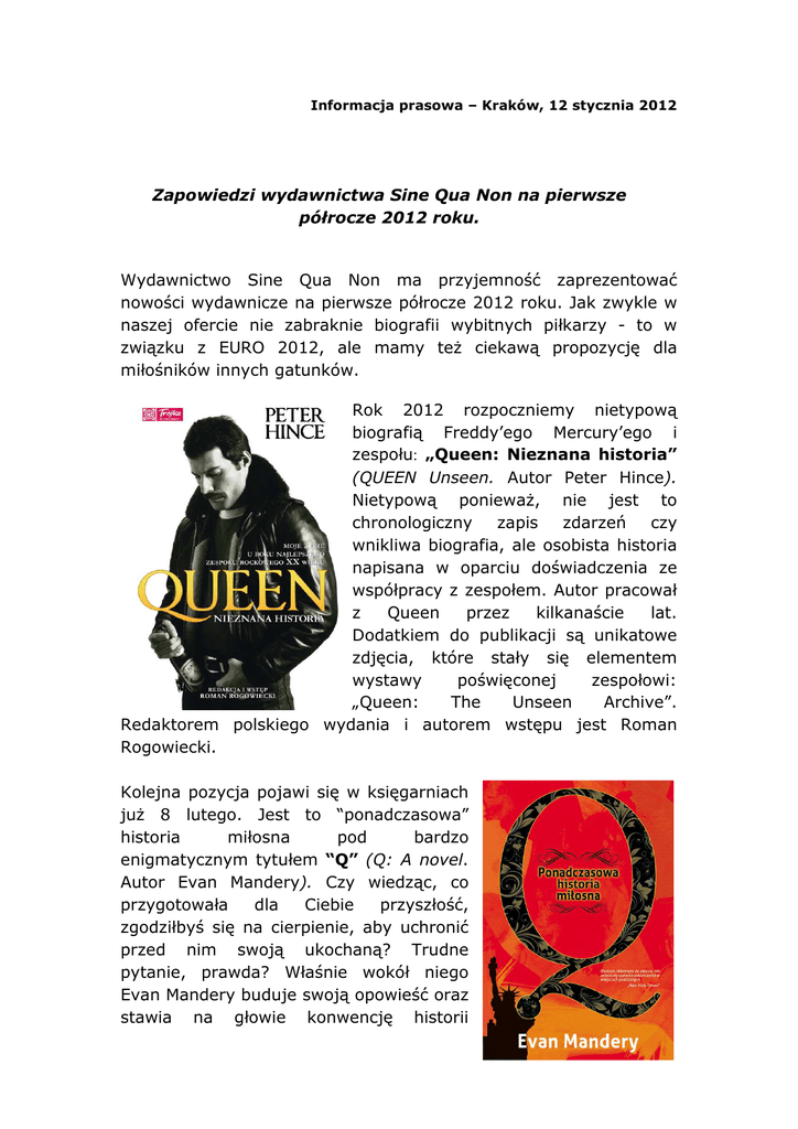 Informacja prasowa – Kraków, 12 stycznia 2012 Zapowiedzi wydawnictwa Sine Qua Non na pierwsze półrocze 2012 roku. Wydawnictwo Sine Qua Non ma przyjemność zaprezentować nowości wydawnicze na pierwsze półrocze 2012 roku. Jak zwykle w naszej ofercie nie zabraknie biografii wybitnych piłkarzy - to w związku z EURO 2012, ale mamy też ciekawą propozycję dla miłośników innych gatunków. Rok 2012 rozpoczniemy nietypową biografią Freddy’ego Mercury’ego i zespołu: „Queen: Nieznana historia” (QUEEN Unseen. Autor Peter Hince). Nietypową ponieważ, nie jest to chronologiczny zapis zdarzeń czy wnikliwa biografia, ale osobista historia napisana w oparciu doświadczenia ze współpracy z zespołem. Autor pracował z Queen przez kilkanaście lat. Dodatkiem do publikacji są unikatowe zdjęcia, które stały się elementem wystawy poświęconej zespołowi: „Queen: The Unseen Archive”. Redaktorem polskiego wydania i autorem wstępu jest Roman Rogowiecki. Kolejna pozycja pojawi się w księgarniach już 8 lutego. Jest to “ponadczasowa” historia miłosna pod bardzo enigmatycznym tytułem “Q” (Q: A novel. Autor Evan Mandery). Czy wiedząc, co przygotowała dla Ciebie przyszłość, zgodziłbyś się na cierpienie, aby uchronić przed nim swoją ukochaną? Trudne pytanie, prawda? Właśnie wokół niego Evan Mandery buduje swoją opowieść oraz stawia na głowie konwencję historii miłosnej, ale robi to w niezwykle przemyślany sposób, pełen humoru i emocji. Jego błyskotliwa, romantyczna i zabawna, a jednocześnie bardzo inteligentna opowieść prowadzi do całkowicie nieoczekiwanego zakończenia. Kolejne premiery związane są z tematyką piłki nożnej oraz EURO 2012. Już w lutym będzie miała miejsce światowa premiera (!!!) książki o jednym z najlepszych piłkarzy Europy oraz gwiazdy EURO w Polsce na Ukrainie: “Ronaldo. Obsesja doskonałości” (Ronaldo. The Obsession for Perfection. Autor: Luca Caioli – jest on również autorem bestsellera o Messim). Caioli w swojej książce opisuje historię piłkarza nie tylko z perspektywy boiska, ale - jak nikt wcześniej – dociera do sekretów życia prywatnego, co w przypadku tak rozpoznawalnego piłkarza – celebryty nie jest sprawą łatwą. W marcu pojawią się kolejne książki dla fanów piłki nożnej. Będą mogli przeczytać biografie: Van Persiego, Ibrahimovića czy Wayne’a Rooneya. Zacznijmy od Ibrahimovića. W „Ja, Ibra” (Jag är Zlatan. Autorzy: Zlatan Ibrahimović, David Lagercrantz), piłkarz po raz pierwszy opowiada o swoich przeżyciach na boisku i poza nim, o radościach i szaleństwach w życiu nie zawsze w pełni kontrolowanym. Autobiografia została nazwana w Szwecji kontrowersyjną, przede wszystkim dlatego, że piłkarz ostro krytykuje w niej Pepa Guardiolę, który uważany jest za najlepszego trenera Europy. Kolejny niepokorny europejskich boisk (wkrótce będzie można go zobaczyć na żywo w czasie meczów Euro 2012) to Wayne Rooney. W książce “Moja Historia” (Wayne Rooney: My Story So Far. Autor: Wayne Rooney) opowiada o zwycięstwie na przekór przeciwnościom losu, mistrzach i mistrzostwach, życiu prywatnym, które nigdy nie pozwala na spokój, a także o sportowcu, którego los na zawsze odmienił Sir Alex Ferguson, powołując do składu Manchesteru United. Ostatni, ale nie mniej ważny, to holender Robin Van Persie. Od pierwszych szlifów piłkarskich zdobywanych w Feyenoordzie, aż do dnia, kiedy w finale Mistrzostw Świata w RPA w 2010 roku potwierdził swoją wartość jako gracza światowej klasy – Robin van Persie tworzy na naszych oczach fascynującą historię jednego z najbardziej utalentowanych zawodników swojego pokolenia. Van Persie będzie jedną z największych gwiazd nadchodzącego EURO 2012, a więcej będzie można się o nim dowiedzieć po przeczytaniu „Biografii” (Robin van Persie: The Biography. Autor: Andy LloydWilliams). Oczywiście jeśli pojawiają się książki piłkarskie nie możemy zapomnieć o fanach FC Barcelony. Na początek książka nie tylko dla fanów piłki. Chociaż Mourinho i Guardiola są znani jako głównie jako trenerzy to książka „Mourinho versus Guardiola” (Mourinho vs. Guardiola. Autorzy: Juan Carlom Cubeiro, Leonor Gallardo) skierowana jest do każdego, kto chce dobrze zarządzać firmą. Zawiera istotne lekcje na temat liderowania, strategii i kierowania zespołami. Kolejna pozycja z cyklu barcelońskiego to „Barca: sens życia.” (Barça: A People’s Passion. Autor: Jimmy Burns). Jedyna pełna opowieść spinająca ze sobą losy piłki nożnej i ludzkiego życia – opowieść o FC Barcelonie i Katalonii. Zabiera czytelnika w bordowogranatową podróż w czasie, przez doniosłe chwile z wybitnymi osobistościami: przeciwstawienie się generałowi Franco podczas Hiszpańskiej Wojny Domowej, rozpoczęcie odwiecznej rywalizacji z Realem Madryt, nieustanne dążenie do perfekcji na boisku i poza nim. Wydawnictwo Sine Qua Non to jednak nie tylko książki sportowe. Udowodnimy to wydając w maju publikację pod tytułem „Bractwo Pif Paf.” (The Bang Bang Club. Autorzy: Greg Marinovich, Joao Silva). Jest to oparta na faktach relacja reporterów wojennych z RPA. Greg Marinovich oraz Joao Silva są laureatami nagrody Pulitzera. Teraz pokazują od wewnątrz pracę reportera wojennego. Tłumaczem książki oraz autorem wstępu jest znany polski dziennikarz, Wojciech Jagielski. W maju opublikujemy kolejny zeszyt komiksu Assassin’s Creed „Aquilus.” Pierwszy zeszyt pojawił się w grudniu 2011 i stał się przebojem wśród polskich fanów gry, o którą został oparty, a także fanów komiksu. Autorzy Eric Corbeyran i Djillali Defali kontynują opowieść o młodym Assassynie imieniem Desmond. Tytułem “Aquilus” zamkniemy pierwsze półrocze, ale tylko po to by drugą połowę roku otworzyć książką, o której na pewno będzie głośno w 2012 roku nie tylko w Polsce. Więcej informacji na tem