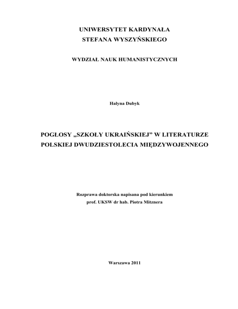 UNIWERSYTET KARDYNAŁA STEFANA WYSZYŃSKIEGO WYDZIAŁ NAUK HUMANISTYCZNYCH Halyna Dubyk POGŁOSY „SZKOŁY UKRAIŃSKIEJ” W LITERATURZE POLSKIEJ DWUDZIESTOLECIA MIĘDZYWOJENNEGO Rozprawa doktorska napisana pod kierunkiem prof. UKSW dr hab. Piotra Mitznera Warszawa 2011 Spis treści Wstęp. „Szkoła ukraińska” jako nurt literacki. Próba definicji..................................................... 2 Rozdział 1. Bolesław Leśmian a Ukraina ................................................................................... 13 Rozdział 2. „Koronki ukraińskie” Jarosława Iwaszkiewicza ...................................................... 29 1. Jarosław Iwaszkiewicz w szkole Juliusza Słowackiego ..................................................... 46 1.1 „Alludere” ..................................................................................................................... 47 1.2 Ukraiński Powrót do Europy ........................................................................................ 51 1.3 Wokół Młodości Pana Twardowskiego ........................................................................ 59 2. Literackie obrazy Ukrainy................................................................................................... 69 2.1 Domy ............................................................................................................................. 71 2.2 Ludzie............................................................................................................................ 80 3. Ukraińska „skaza” Jarosława Iwaszkiewicza ...................................................................... 92 Rozdział 3. Józefa Łobodowskiego budowanie mitów ............................................................. 102 3. 1 „Piekieł psalmodia […]” ................................................................................................ 109 3. 2 Spod znaku Złotej Hramoty ........................................................................................... 123 3. 3 „Nawiązujemy do romantyzmu” .................................................................................... 129 3. 4 Ku pojednaniu ................................................................................................................ 134 Rozdział 4. Jan Śpiewak. Służebność pamięci.......................................................................... 142 Rozdział 5. Liryka krajobrazu ukraińskiego: klisze i doświadczenia ....................................... 166 5. 1 „Wołyniacy piszą wiersze, a nawet poezje”................................................................... 172 5. 2 Obrzeża poetyckie .......................................................................................................... 183 Rozdział 6. Podolska „komedia ludzka” Juliana Wołoszynowskiego ...................................... 198 Zakończenie .............................................................................................................................. 217 Bibliografia ............................................................................................................................... 220 Archiwalia ................................................................................................................................. 229 Wstęp. „Szkoła ukraińska” jako nurt literacki. Próba definicji Nie ulega wątpliwości, że Ukraina była ważnym tematem w literaturze polskiej lat międzywojennych. Powstaje jednak pytanie o rangę zagadnienia: czy mamy do czynienia z każdorazowo oryginalnym ujęciem tematycznym, czy są przesłanki do wskazania ciągłości tradycji romantycznej „szkoły ukraińskiej”? I dalej: czy są to zjawiska autoteliczne, czy można mówić o określonej tendencji literackiej; wreszcie – czy wyodrębnienie „ukraińskości” poszczególnych dzieł jest wskazaniem jednej z możliwych reprezentacji nieprzebranego repertuaru tematycznego literatury, czy też takie postępowanie badawcze pozwoli wskazać właściwy kontekst interpretacyjny większej grupy utworów? W tej pracy chcę przyjrzeć się obrazom „literackiej Ukrainy” w dziełach pisarzy okresu międzywojennego: Bolesława Leśmiana, Jarosława Iwaszkiewicza, Józefa Łobodowskiego, Jana Śpiewaka, Czesława Janczarskiego, Władysława Milczarka i Juliana Wołoszynowskiego. Znamienne, że wspólnym kontekstem badawczym w analizie twórczości na tyle zróżnicowanych (gatunkowo, stylistycznie, a nawet tematycznie) utworów będzie z jednej strony kontekst biograficzny ich autorów, a z drugiej – swoiste wyzyskanie tradycji romantycznej. Zasady, na jakich tematyka ukraińska była ewokowana w polskiej literaturze, doczekały się względnego skodyfikowania w epoce romantyzmu. Względnego, ponieważ termin ten jest zazwyczaj opatrzony w opracowaniach określeniem „tak zwana”, a jako osobne zjawisko „szkoła ukraińska” nie posiada hasła w Słowniku literatury polskiej XIX wieku. Względnego również z tego powodu, że zarówno w romantyzmie, jak i w późniejszych okresach fakty literackie przemawiają za tym, aby redefiniować samo pojęcie i stosować je do dzieł literackich, w których pierwiastek ukraiński jest nadrzędnym pojęciem aksjologicznym, obrazotwórczym i stylistycznym. Ostatecznie z tych ziem […] z fascynacji ich problematyką i głębokiego przeżycia ich wartości, jak również kulturalnego i politycznego znaczenia dla Polski wyrosły […] utwory należące do najwybitniejszych osiągnięć w historii literatury polskiej. 1 1 J. Kolbuszewski, Legenda Kresów w literaturze XIX wieku, „Odra” 1982, nr 12, s. 51. 2 Koncepcję „szkół poetyckich”, w której osobne miejsce zarezerwowano „szkole ukraińskiej”, zaproponował w książce 2 Amerykanka w Polsce (1837) Aleksander Tyszyński. Terytorialno-geograficzne kryterium podjęli po nim Michał Grabowski (O s