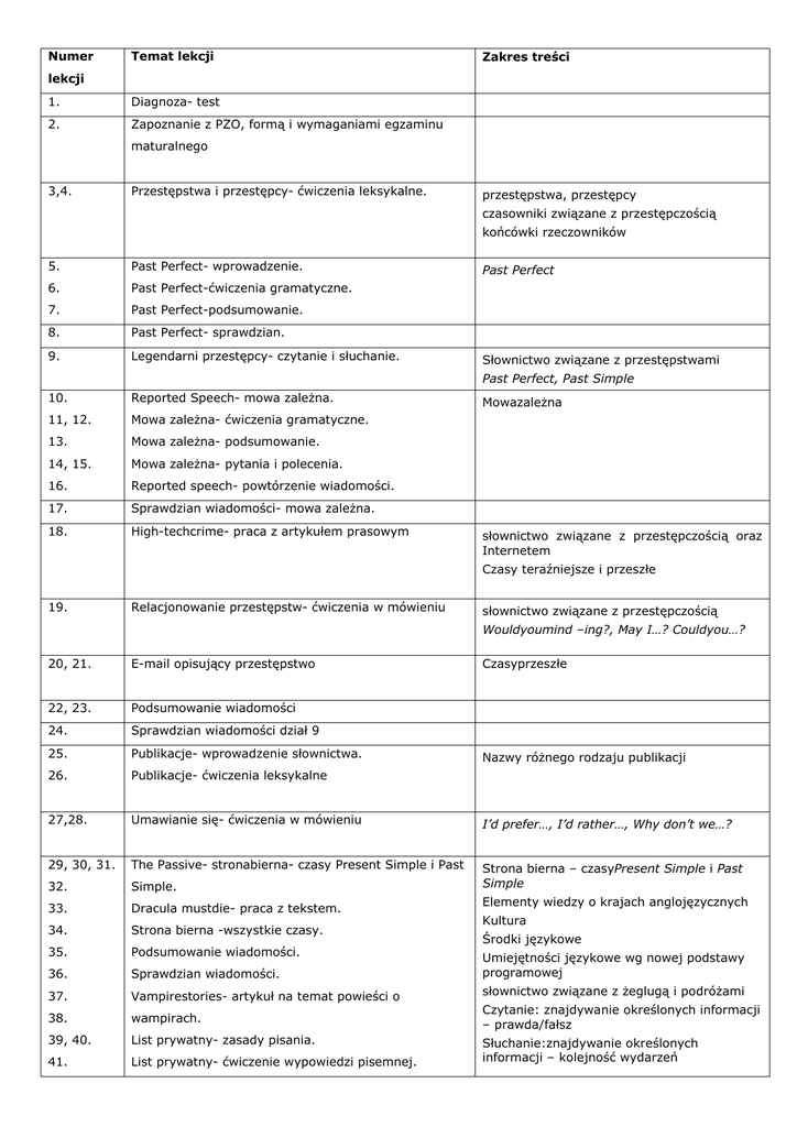 Numer Temat lekcji Zakres treści lekcji 1. Diagnoza- test 2. Zapoznanie z PZO, formą i wymaganiami egzaminu maturalnego 3,4. Przestępstwa i przestępcy- ćwiczenia leksykalne. przestępstwa, przestępcy czasowniki związane z przestępczością końcówki rzeczowników 5. Past Perfect- wprowadzenie. 6. Past Perfect-ćwiczenia gramatyczne. 7. Past Perfect-podsumowanie. 8. Past Perfect- sprawdzian. 9. Legendarni przestępcy- czytanie i słuchanie. Past Perfect Słownictwo związane z przestępstwami Past Perfect, Past Simple 10. Reported Speech- mowa zależna. 11, 12. Mowa zależna- ćwiczenia gramatyczne. 13. Mowa zależna- podsumowanie. 14, 15. Mowa zależna- pytania i polecenia. 16. Reported speech- powtórzenie wiadomości. 17. Sprawdzian wiadomości- mowa zależna. 18. High-techcrime- praca z artykułem prasowym Mowazależna słownictwo związane z przestępczością oraz Internetem Czasy teraźniejsze i przeszłe 19. Relacjonowanie przestępstw- ćwiczenia w mówieniu słownictwo związane z przestępczością Wouldyoumind –ing?, May I…? Couldyou…? 20, 21. E-mail opisujący przestępstwo 22, 23. Podsumowanie wiadomości 24. Sprawdzian wiadomości dział 9 25. Publikacje- wprowadzenie słownictwa. 26. Publikacje- ćwiczenia leksykalne 27,28. Umawianie się- ćwiczenia w mówieniu I’d prefer…, I’d rather…, Why don’t we…? 29, 30, 31. The Passive- stronabierna- czasy Present Simple i Past 32. Simple. Strona bierna – czasyPresent Simple i Past Simple 33. Dracula mustdie- praca z tekstem. 34. Strona bierna -wszystkie czasy. 35. Podsumowanie wiadomości. 36. Sprawdzian wiadomości. Umiejętności językowe wg nowej podstawy programowej 37. Vampirestories- artykuł na temat powieści o słownictwo związane z żeglugą i podróżami 38. wampirach. Czytanie: znajdywanie określonych informacji – prawda/fałsz 39, 40. List prywatny- zasady pisania. 41. List prywatny- ćwiczenie wypowiedzi pisemnej. Czasyprzeszłe Nazwy różnego rodzaju publikacji Elementy wiedzy o krajach anglojęzycznych Kultura Środki językowe Słuchanie:znajdywanie określonych informacji – kolejność wydarzeń Podsumowanie materiału z unitu 10. Sprawdzian wiadomości. Strona bierna: Presentperfect i will Stosowanie różnych form strony biernej Wypowiadanie się na temat zastępowania tradycyjnych książek nowoczesnymi środkami przekazu Wypowiadanie się na temat pisania książek Przedstawianie informacji o pisarzac przedstawianie faktów i opinii, wyrażanie uczuć opisywanie intencji, sugerowanie – list prywatny Mowa zależna Wyrażanie uczuć 42. Człowiek- wprowadzenie słownictwa. 43. Człowiek- ćwiczenia leksykalne. 44. Człowiek- rozumienie ze słuchu. 45. Rozumienie tekstu czytanego. 46. Rozmowa z odgrywaniem roli- ćwiczenia w mówieniu. 47. Zadania maturalne- opis ilustracji. 48. Rozmowa na podstawie materiału stymulującego. 49. Środki językowe – ćwiczenia gramatyczne. 50. Powtórzenie czasów teraźniejszych. 51. Wiadomość na blogu- ćwiczenia w pisaniu. 52. Artykuł- ćwiczenia w pisaniu. 53. Rozwiązywanie zadań egzaminacyjnych. 54. Człowiek- ćwiczenia utrwalające. 55. Powtórzenie wiadomości. 56. Sprawdzianwiadomości. 57. Dom- rozumienie ze słuchu. 58. Dom- ćwiczenia w mówieniu. 59. Prace w domu i w ogrodzie- rozumienie ze słuchu. 60. Miejsce zamieszkania, opis domów, pomieszczeń i 61. wyposażenia- rozumienie tekstu czytanego. 62. Rozmowa z odgrywaniem roli- ćwiczenia w mówieniu. 63. Zadania maturalne- opis ilustracji. 64. Rozmowa na podstawie materiału stymulującego. 65. Znajomość środków językowych- ćwiczenia 66. gramatyczne. 67. Znajomość środków językowych: czasy przeszłe. 68. Doskonalenie umiejętności pisania- e-mail. 69. Doskonalenie umiejętności pisania- list formalny. 70. Rozwiązywanie zadań maturalnych. 71. Utrwalenie wiadomości. Wypowiadanie się na temat przeżytych doświadczeń i planów na przyszłość dane osobowe, wygląd zewnętrzny (phrasalverbs, confusingwords), ubrania (collocations), cechy charakteru, uczucia i emocje, zainteresowania, problemy etyczne miejsce zamieszkania (collocations), opis domu, pomieszczeń w domu i ich wyposażenia (collocations, compoundnouns), prace w domu i w ogrodzie (verbnouncollocations), wynajem, kupno i sprzedaż mieszkania czasyprzeszłe: the past simple, past continuous, past perfect, past perfect continuous, konstrukcjaused to Powtórzeniewiadomości. Sprawdzianwiadomości. 72. Szkoła- ćwiczenia leksykalne. przedmioty szkolne (compoundnouns), oceny 73. Szkoła- ćwiczenia leksykalne. 74. Wydarzeniach z życia codziennego- ćwiczenia w 75. mówieniu. 76. Szkoła- rozumienie ze słuchu. 77. Szkoła- rozumienie tekstu czytanego. 78. Rozmowa z odgrywaniem roli- ćwiczenia w mówieniu. 79. Zadania maturalne- opis ilustracji. 80. Rozmowa na podstawie materiału stymulującego. 81. Środki językowe- ćwiczenia gramatyczne. i wymagania, życie szkolne (verbnouncollocations, collocations), zajęcia pozalekcyjne, system oświaty Znajomość środków językowych- czasy: presentperfectsimple, presentperfectcontinuous, past 82. perfectsimple, past perfectcontinuous. 83. Wiadomość na blogu- ćwiczenia w pisaniu. 84. Rozprawka- ćwiczenia w pisaniu. 85. Rozwiązywanie zadań maturalnych. 86. Szkoła- powtórzenie wiadomości. Szkoła- sprawdzian wiadomości. 87, 88. Review: powtórzenie i utrwalenie wiadomości nabytych w rozdziałach 01─03 89. Praca- ćwiczenia leksykalne. 90. Praca- ćwiczenia leksykalne. 91. Praca- ćwiczenia w mówieniu. 92. Praca- rozumienie ze słuchu. 93. Warunki pracy i zatrudnienia, rynek pracy- rozumienie zawody i związane z nimi czynności (prepositions, adjectives) warunki pracy i zatrudnienia (collocations, compundnouns), praca dorywcza, rynek pracy (phrasalverbs) tekstu czytanego. 94. Rozmowa z odgrywaniem roli- ćwiczenia w mówieniu. 95. Zadania maturalne- opis ilustracji. 96. Rozmowa na podstawie materiału stymulującego. 97. Znajomość środk