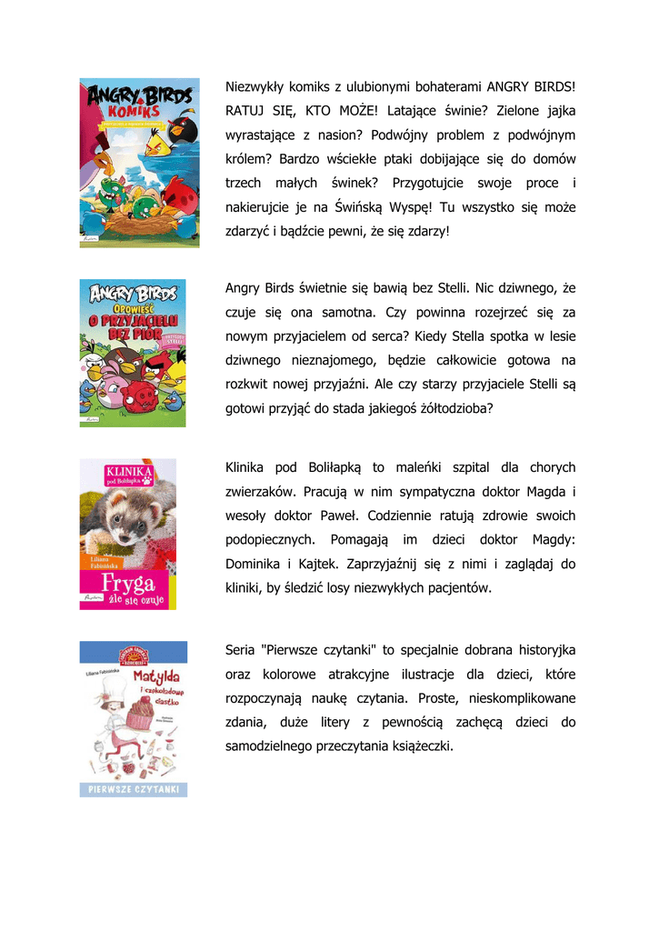 Niezwykły komiks z ulubionymi bohaterami ANGRY BIRDS! RATUJ SIĘ, KTO MOŻE! Latające świnie? Zielone jajka wyrastające z nasion? Podwójny problem z podwójnym królem? Bardzo wściekłe ptaki dobijające się do domów trzech małych świnek? Przygotujcie swoje proce i nakierujcie je na Świńską Wyspę! Tu wszystko się może zdarzyć i bądźcie pewni, że się zdarzy! Angry Birds świetnie się bawią bez Stelli. Nic dziwnego, że czuje się ona samotna. Czy powinna rozejrzeć się za nowym przyjacielem od serca? Kiedy Stella spotka w lesie dziwnego nieznajomego, będzie całkowicie gotowa na rozkwit nowej przyjaźni. Ale czy starzy przyjaciele Stelli są gotowi przyjąć do stada jakiegoś żółtodzioba? Klinika pod Boliłapką to maleńki szpital dla chorych zwierzaków. Pracują w nim sympatyczna doktor Magda i wesoły doktor Paweł. Codziennie ratują zdrowie swoich podopiecznych. Pomagają im dzieci doktor Magdy: Dominika i Kajtek. Zaprzyjaźnij się z nimi i zaglądaj do kliniki, by śledzić losy niezwykłych pacjentów. Seria "Pierwsze czytanki" to specjalnie dobrana historyjka oraz kolorowe atrakcyjne ilustracje dla dzieci, które rozpoczynają naukę czytania. Proste, nieskomplikowane zdania, duże litery z pewnością zachęcą dzieci do samodzielnego przeczytania książeczki. Najnowsza powieść autorki bestsellerów Zostań, jeśli kochasz i Wróć, jeśli pamiętasz Ta przejmująca do głębi powieść jest historią Cody Reynolds, zmagającej się z samobójstwem najlepszej przyjaciółki. Wciągająca, słodko-gorzka opowieść o tym, co w życiu ważne i najważniejsze. Wakacje to historia rodzinnego wypadu do Hiszpanii, przesycona aromatami paelli i bąbelkami cavy. Powieść w zabawny i ciepły sposób demaskuje nasze kompleksy, każdy odnajdzie w niej cząstkę siebie, rozpozna najgłębiej skrywane sekrety, ale pokocha je i zacznie się z nich śmiać. Historia o pasji, miłości i... duchach przeszłości, które raz obudzone, nie pozwalają o sobie zapomnieć. Tajemniczy Dom, w którym może się wydarzyć absolutnie wszystko. Przeznaczenie dopadnie każdego, można mu się poddać lub stanąć do walki o uczucie najbliższej osoby…. Emocjonująca powieść, w której napięcie wzrasta z każdą umykającą minutą, a na światło dzienne wychodzą ukryte lęki i konflikty małej społeczności Broken Branch. Patrycja i Sebastian są zupełnie przeciętnym małżeństwem: wspólnie wychowują dwunastoletnią córkę, borykają się z problemami dnia codziennego. Pati pracuje w biurze, gdzie musi znosić dziwactwa swojego zwariowanego kolegi, Teodora, zwanego przez nią Pączkiem. Pewnego dnia ten na pozór uporządkowany świat rozsypuje się jak domek z kart – Sebastian postanawia odejść. Co się stało, że mąż podjął decyzję o rozstaniu?.. Zabójstwo genialnego polskiego muzyka jazzowego stało się inspiracją do stworzenia opowieści o miłości, rozpaczy i zazdrości. Historii o tym, jak miłość może doprowadzić do zbrodni. Książka Janusza Leona Wiśniewskiego to opowieść, jak silne mogą być emocje i do czego może się posunąć zraniony człowiek. Rok 1920, Wielka Brytania. Kraj otrząsa się po pierwszej wojnie światowej. Młodziutka Lily Valance pragnie zapomnieć o ciężkich czasach i rzuca się w wir szalonych lat dwudziestych. Gdy spotyka przystojnego kapitana Wintersa, ulega czarowi jego pozycji społecznej i bogactwa. On liczy na to, że związek z młodą śpiewaczką pozwoli mu się wyzwolić od traumatycznych wspomnień. Lily decyduje się... Prawdziwy portret Anny Jantar- gwiazdy polskiej estrady .W tej wyjątkowej biografii kryje się o wiele więcej niż tylko historia kariery w blasku świateł. Izabela Aragońska, pozbawiona księstwa Mediolanu przez Ludwika Sforzę, wciąż ma nadzieję na odzyskanie należnej jej pozycji. Naiwnie wierzy w pomoc nowego króla Francji. Ale szybko pozbywa się złudzeń i, rozdarta między tęsknotą za utraconym synem a troską o los córek, ucieka z okupowanego przez Francuzów miasta. W drodze do Neapolu zatrzymuje się w Watykanie. Poznaje swoją.. Jak kochać ojca zbrodniarza? Małe bestie czy bezwolne ofiary? Historii dzieci dyktatorów nie przeczytasz w żadnej innej książce. Opactwo świętego grzechu to piękna książka o miłości i towarzyszącemu temu uczuciu zrozumieniu drugiej osoby. To także mocny głos Sue Monk Kidd w sprawie eutanazji.