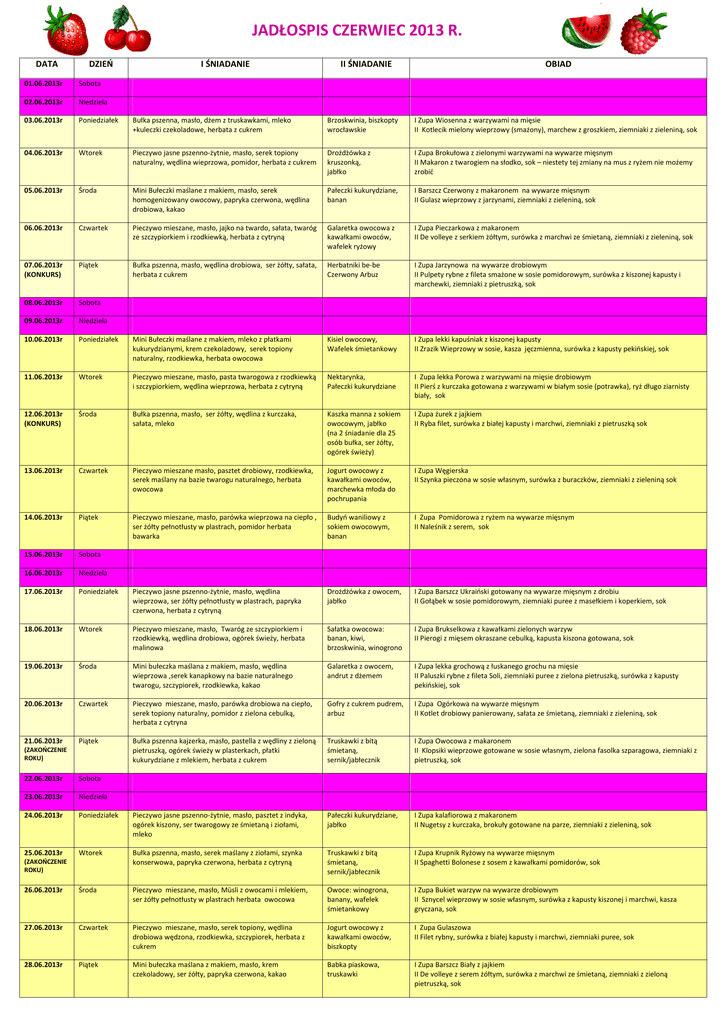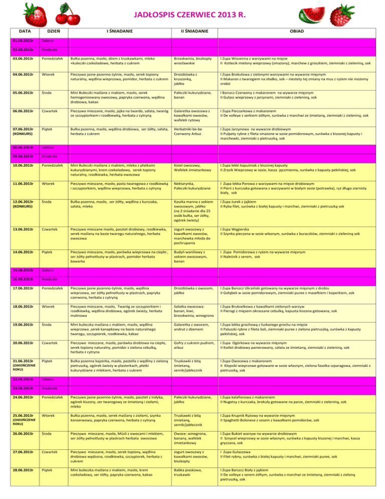 JADŁOSPIS CZERWIEC 2013 R. DATA DZIEŃ I ŚNIADANIE II ŚNIADANIE OBIAD 01.06.2013r Sobota 02.06.2013r Niedziela 03.06.2013r Poniedziałek Bułka pszenna, masło, dżem z truskawkami, mleko +kuleczki czekoladowe, herbata z cukrem Brzoskwinia, biszkopty wrocławskie I Zupa Wiosenna z warzywami na mięsie II Kotlecik mielony wieprzowy (smażony), marchew z groszkiem, ziemniaki z zieleniną, sok 04.06.2013r Wtorek Pieczywo jasne pszenno-żytnie, masło, serek topiony naturalny, wędlina wieprzowa, pomidor, herbata z cukrem Drożdżówka z kruszonką, jabłko I Zupa Brokułowa z zielonymi warzywami na wywarze mięsnym II Makaron z twarogiem na słodko, sok – niestety tej zmiany na mus z ryżem nie możemy zrobić 05.06.2013r Środa Mini Bułeczki maślane z makiem, masło, serek homogenizowany owocowy, papryka czerwona, wędlina drobiowa, kakao Pałeczki kukurydziane, banan I Barszcz Czerwony z makaronem na wywarze mięsnym II Gulasz wieprzowy z jarzynami, ziemniaki z zieleniną, sok 06.06.2013r Czwartek Pieczywo mieszane, masło, jajko na twardo, sałata, twaróg ze szczypiorkiem i rzodkiewką, herbata z cytryną Galaretka owocowa z kawałkami owoców, wafelek ryżowy I Zupa Pieczarkowa z makaronem II De volleye z serkiem żółtym, surówka z marchwi ze śmietaną, ziemniaki z zieleniną, sok 07.06.2013r (KONKURS) Piątek Bułka pszenna, masło, wędlina drobiowa, ser żółty, sałata, herbata z cukrem Herbatniki be-be Czerwony Arbuz I Zupa Jarzynowa na wywarze drobiowym II Pulpety rybne z fileta smażone w sosie pomidorowym, surówka z kiszonej kapusty i marchewki, ziemniaki z pietruszką, sok 08.06.2013r Sobota 09.06.2013r Niedziela 10.06.2013r Poniedziałek Mini Bułeczki maślane z makiem, mleko z płatkami kukurydzianymi, krem czekoladowy, serek topiony naturalny, rzodkiewka, herbata owocowa Kisiel owocowy, Wafelek śmietankowy I Zupa lekki kapuśniak z kiszonej kapusty II Zrazik Wieprzowy w sosie, kasza jęczmienna, surówka z kapusty pekińskiej, sok 11.06.2013r Wtorek Pieczywo mieszane, masło, pasta twarogowa z rzodkiewką i szczypiorkiem, wędlina wieprzowa, herbata z cytryną Nektarynka, Pałeczki kukurydziane I Zupa lekka Porowa z warzywami na mięsie drobiowym II Pierś z kurczaka gotowana z warzywami w białym sosie (potrawka), ryż długo ziarnisty biały, sok 12.06.2013r (KONKURS) Środa Bułka pszenna, masło, ser żółty, wędlina z kurczaka, sałata, mleko Kaszka manna z sokiem owocowym, jabłko (na 2 śniadanie dla 25 osób bułka, ser żółty, ogórek świeży) I Zupa żurek z jajkiem II Ryba filet, surówka z białej kapusty i marchwi, ziemniaki z pietruszką sok 13.06.2013r Czwartek Pieczywo mieszane masło, pasztet drobiowy, rzodkiewka, serek maślany na bazie twarogu naturalnego, herbata owocowa Jogurt owocowy z kawałkami owoców, marchewka młoda do pochrupania I Zupa Węgierska II Szynka pieczona w sosie własnym, surówka z buraczków, ziemniaki z zieleniną sok 14.06.2013r Piątek Pieczywo mieszane, masło, parówka wieprzowa na ciepło , ser żółty pełnotłusty w plastrach, pomidor herbata bawarka Budyń waniliowy z sokiem owocowym, banan I Zupa Pomidorowa z ryżem na wywarze mięsnym II Naleśnik z serem, sok 15.06.2013r Sobota 16.06.2013r Niedziela 17.06.2013r Poniedziałek Pieczywo jasne pszenno-żytnie, masło, wędlina wieprzowa, ser żółty pełnotłusty w plastrach, papryka czerwona, herbata z cytryną Drożdżówka z owocem, jabłko I Zupa Barszcz Ukraiński gotowany na wywarze mięsnym z drobiu II Gołąbek w sosie pomidorowym, ziemniaki puree z masełkiem i koperkiem, sok 18.06.2013r Wtorek Pieczywo mieszane, masło, Twaróg ze szczypiorkiem i rzodkiewką, wędlina drobiowa, ogórek świeży, herbata malinowa Sałatka owocowa: banan, kiwi, brzoskwinia, winogrono I Zupa Brukselkowa z kawałkami zielonych warzyw II Pierogi z mięsem okraszane cebulką, kapusta kiszona gotowana, sok 19.06.2013r Środa Mini bułeczka maślana z makiem, masło, wędlina wieprzowa ,serek kanapkowy na bazie naturalnego twarogu, szczypiorek, rzodkiewka, kakao Galaretka z owocem, andrut z dżemem I Zupa lekka grochową z łuskanego grochu na mięsie II Paluszki rybne z fileta Soli, ziemniaki puree z zielona pietruszką, surówka z kapusty pekińskiej, sok 20.06.2013r Czwartek Pieczywo mieszane, masło, parówka drobiowa na ciepło, serek topiony naturalny, pomidor z zielona cebulką, herbata z cytryna Gofry z cukrem pudrem, arbuz I Zupa Ogórkowa na wywarze mięsnym II Kotlet drobiowy panierowany, sałata ze śmietaną, ziemniaki z zieleniną, sok 21.06.2013r Piątek Bułka pszenna kajzerka, masło, pastella z wędliny z zieloną pietruszką, ogórek świeży w plasterkach, płatki kukurydziane z mlekiem, herbata z cukrem Truskawki z bitą śmietaną, sernik/jabłecznik I Zupa Owocowa z makaronem II Klopsiki wieprzowe gotowane w sosie własnym, zielona fasolka szparagowa, ziemniaki z pietruszką, sok (ZAKOŃCZENIE ROKU) 22.06.2013r Sobota 23.06.2013r Niedziela 24.06.2013r Poniedziałek Pieczywo jasne pszenno-żytnie, masło, pasztet z indyka, ogórek kiszony, ser twarogowy ze śmietaną i ziołami, mleko Pałeczki kukurydziane, jabłko I Zupa kalafiorowa z makaronem II Nugetsy z kurczaka, brokuły gotowane na parze, ziemniaki z zieleniną, sok 25.06.2013r Wtorek Bułka pszenna, masło, serek maślany z ziołami, szynka konserwowa, papryka czerwona, herbata z cytryną Truskawki z bitą śmietaną, sernik/jabłecznik I Zupa Krupnik Ryżowy na wywarze mięsnym II Spaghetti Bolonese z sosem z kawałkami pomidorów, sok 26.06.2013r Środa Pieczywo mieszane, masło, Müsli z owocami i mlekiem, ser żółty pełnotłusty w plastrach herbata owocowa Owoce: winogrona, banany, wafelek śmietankowy I Zupa Bukiet warzyw na wywarze drobiowym II Sznycel wieprzowy w sosie własnym, surówka z kapusty kiszonej i marchwi, kasza gryczana, sok 27.06.2013r Czwartek Pieczywo mieszane, masło, serek topiony, wędlina drobiowa wędzona, rzodkiewka, szczypiorek, herbata z cukrem Jogurt ow