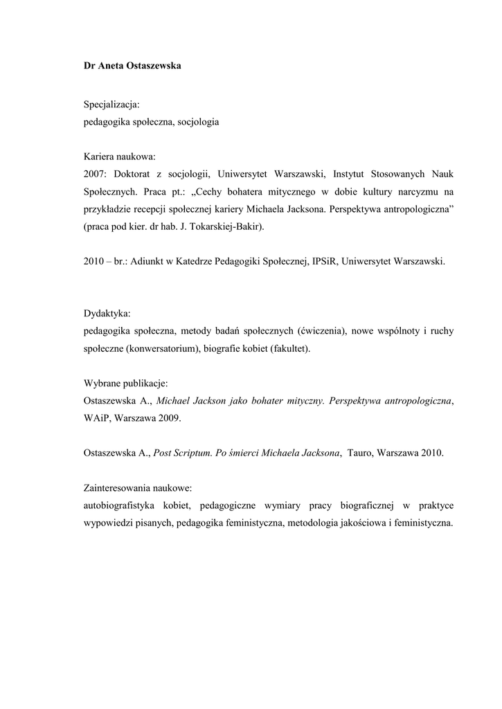 Dr Aneta Ostaszewska Specjalizacja: pedagogika społeczna, socjologia Kariera naukowa: 2007: Doktorat z socjologii, Uniwersytet Warszawski, Instytut Stosowanych Nauk Społecznych. Praca pt.: „Cechy bohatera mitycznego w dobie kultury narcyzmu na przykładzie recepcji społecznej kariery Michaela Jacksona. Perspektywa antropologiczna” (praca pod kier. dr hab. J. Tokarskiej-Bakir). 2010 – br.: Adiunkt w Katedrze Pedagogiki Społecznej, IPSiR, Uniwersytet Warszawski. Dydaktyka: pedagogika społeczna, metody badań społecznych (ćwiczenia), nowe wspólnoty i ruchy społeczne (konwersatorium), biografie kobiet (fakultet). Wybrane publikacje: Ostaszewska A., Michael Jackson jako bohater mityczny. Perspektywa antropologiczna, WAiP, Warszawa 2009. Ostaszewska A., Post Scriptum. Po śmierci Michaela Jacksona, Tauro, Warszawa 2010. Zainteresowania naukowe: autobiografistyka kobiet, pedagogiczne wymiary pracy biograficznej w praktyce wypowiedzi pisanych, pedagogika feministyczna, metodologia jakościowa i feministyczna.