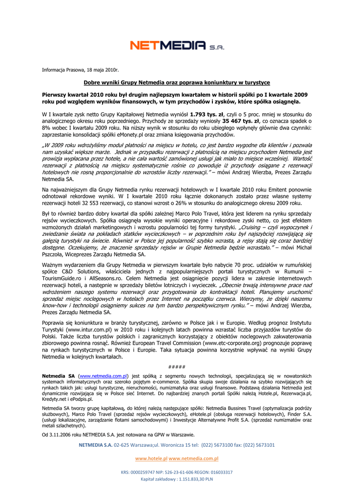 Informacja Prasowa, 18 maja 2010r. Dobre wyniki Grupy Netmedia oraz poprawa koniunktury w turystyce Pierwszy kwartał 2010 roku był drugim najlepszym kwartałem w historii spółki po I kwartale 2009 roku pod względem wyników finansowych, w tym przychodów i zysków, które spółka osiągnęła. W I kwartale zysk netto Grupy Kapitałowej Netmedia wyniósł 1.793 tys. zł, czyli o 5 proc. mniej w stosunku do analogicznego okresu roku poprzedniego. Przychody ze sprzedaży wyniosły 35 467 tys. zł, co oznacza spadek o 8% wobec I kwartału 2009 roku. Na niższy wynik w stosunku do roku ubiegłego wpłynęły głównie dwa czynniki: zaprzestanie konsolidacji spółki eMonety.pl oraz zmiana księgowania przychodów. „W 2009 roku wdrożyliśmy moduł płatności na miejscu w hotelu, co jest bardzo wygodne dla klientów i pozwala nam uzyskać większe marże. Jednak w przypadku rezerwacji z płatnością na miejscu przychodem Netmedia jest prowizja wypłacana przez hotele, a nie cała wartość zamówionej usługi jak miało to miejsce wcześniej. Wartość rezerwacji z płatnością na miejscu systematycznie rośnie co powoduje iż przychody osiągane z rezerwacji hotelowych nie rosną proporcjonalnie do wzrostów liczby rezerwacji.” – mówi Andrzej Wierzba, Prezes Zarządu Netmedia SA. Na najważniejszym dla Grupy Netmedia rynku rezerwacji hotelowych w I kwartale 2010 roku Emitent ponownie odnotował rekordowe wyniki. W I kwartale 2010 roku łącznie dokonanych zostało przez własne systemy rezerwacji hoteli 32 553 rezerwacji, co stanowi wzrost o 26% w stosunku do analogicznego okresu 2009 roku. Był to również bardzo dobry kwartał dla spółki zależnej Marco Polo Travel, która jest liderem na rynku sprzedaży rejsów wycieczkowych. Spółka osiągnęła wysokie wyniki operacyjne i rekordowe zyski netto, co jest efektem wzmożonych działań marketingowych i wzrostu popularności tej formy turystyki. „Cruising – czyli wypoczynek i zwiedzanie świata na pokładach statków wycieczkowych – w poprzednim roku był najszybciej rozwijającą się gałęzią turystyki na świecie. Również w Polsce jej popularność szybko wzrasta, a rejsy stają się coraz bardziej dostępne. Oczekujemy, że znaczenie sprzedaży rejsów w Grupie Netmedia będzie wzrastało.” – mówi Michał Pszczoła, Wiceprezes Zarządu Netmedia SA. Ważnym wydarzeniem dla Grupy Netmedia w pierwszym kwartale było nabycie 70 proc. udziałów w rumuńskiej spółce C&D Solutions, właściciela jednych z najpopularniejszych portali turystycznych w Rumunii – TourismGuide.ro i AllSeasons.ro. Celem Netmedia jest osiągnięcie pozycji lidera w zakresie internetowych rezerwacji hoteli, a następnie w sprzedaży biletów lotniczych i wycieczek. „Obecnie trwają intensywne prace nad wdrożeniem naszego systemu rezerwacji oraz przygotowania do kontraktacji hoteli. Planujemy uruchomić sprzedaż miejsc noclegowych w hotelach przez Internet na początku czerwca. Wierzymy, że dzięki naszemu know-how i technologii osiągniemy sukces na tym bardzo perspektywicznym rynku.” – mówi Andrzej Wierzba, Prezes Zarządu Netmedia SA. Poprawia się koniunktura w branży turystycznej, zarówno w Polsce jak i w Europie. Według prognoz Instytutu Turystyki (www.intur.com.pl) w 2010 roku i kolejnych latach powinna wzrastać liczba przyjazdów turystów do Polski. Także liczba turystów polskich i zagranicznych korzystający z obiektów noclegowych zakwaterowania zbiorowego powinna rosnąć. Również European Travel Commission (www.etc-corporate.org) prognozuje poprawę na rynkach turystycznych w Polsce i Europie. Taka sytuacja powinna korzystnie wpływać na wyniki Grupy Netmedia w kolejnych kwartałach. ##### Netmedia SA (www.netmedia.com.pl) jest spółką z segmentu nowych technologii, specjalizującą się w nowatorskich systemach informatycznych oraz szeroko pojętym e-commerce. Spółka skupia swoje działania na szybko rozwijających się rynkach takich jak: usługi turystyczne, nieruchomości, numizmatyka oraz usługi finansowe. Podstawą działania Netmedia jest dynamicznie rozwijająca się w Polsce sieć Internet. Do najbardziej znanych portali Spółki należą Hotele.pl, Rezerwacja.pl, Kredyty.net i ePodpis.pl. Netmedia SA tworzy grupę kapitałową, do której należą następujące spółki: Netmedia Bussines Travel (optymalizacja podróży służbowych), Marco Polo Travel (sprzedaż rejsów wycieczkowych), eHotele.pl (obsługa rezerwacji hotelowych), Finder S.A. (usługi lokalizacyjne, zarządzanie flotami samochodowymi) i Inwestycje Alternatywne Profit S.A. (sprzedaż numizmatów oraz metali szlachetnych). Od 3.11.2006 roku NETMEDIA S.A. jest notowana na GPW w Warszawie. NETMEDIA S.A. 02-625 Warszawa;ul. Woronicza 15 tel: (022) 5673100 fax: (022) 5673101 www.hotele.pl www.netmedia.com.pl KRS: 0000259747 NIP: 526-23-61-606 REGON: 016033317 Kapitał zakładowy : 1.151.833,30 PLN