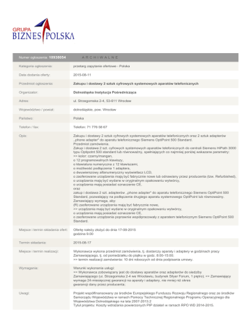 Numer ogłoszenia: 10938054 A RCHI WA L N E Kategoria ogłoszenia: przetarg zapytanie ofertowe - Polska Data dodania oferty: 2015-08-11 Przedmiot ogłoszenia: Zakupu i dostawy 2 sztuk cyfrowych systemowych aparatów telefonicznych Organizator: Dolnośląska Instytucja Pośrednicząca Adres: ul. Strzegomska 2-4, 53-611 Wrocław Województwo / powiat: dolnośląskie, pow. Wrocław Państwo: Polska Telefon / fax: Telefon: 71 776 58 67 Opis: Zakupu i dostawy 2 sztuk cyfrowych systemowych aparatów telefonicznych oraz 2 sztuk adapterów ,,phone adapter" do aparatu telefonicznego Siemens OptiPoint 500 Standard. Przedmiot zamówienia. Zakup i dostawa 2 szt. cyfrowych systemowych aparatów telefonicznych do centrali Siemens HiPath 3000 typu Optipotnt 500 standard lub równoważny, spełniających co najmniej poniżej wskazane parametry: >> kolor: czarny/mangan, o 12 programowalnych klawiszy, o klawiatura numeryczna z 12 klawiszami, o możliwość podłączenia 1 adaptera, o dwuwierszowy alfanumeryczny wyświetlacz LCD, o zaoferowane urządzenia mają być fabrycznie nowe lub odnawiany przez producenta (tzw. Refurbished), o urządzenia mają być wydane w oryginalnym opakowaniu wytwórcy, o urządzenia mają posiadać oznaczenie CE, oraz zakup i dostawa 2 szt. adapterów ,,phone adapter" do aparatu telefonicznego Siemens OptiPoint 500 Standard, pozwalający na podłączenie drugiego aparatu systemowego OptiPoint lub równoważny. Zamawiający wymaga, aby: (R) zaoferowane urządzenia mają być fabrycznie nowe, >> urządzenia mają być wydane w oryginalnym opakowaniu wytwórcy, o urządzenia mają posiadać oznaczenie CE, o zaoferowane urządzenia poprawnie współpracowały z aparatem telefonicznym Siemens OptiPoint 500 Standard. Miejsce i termin składania ofert: Ofertę należy złożyć do dnia 17-08-2015 godzina 9.00 Termin składania: 2015-08-17 Miejsce i termin realizacji: Wykonawca wykona przedmiot zamówienia, tj. dostarczy aparaty i adaptery w godzinach pracy Zamawiającego, tj. od poniedziałku do piątku w godz. 8:00-15:00; >> termin realizacji zamówienia: 10 dni roboczych od dnia podpisania umowy. Wymagania: Warunki wykonania usługi: << Wykonawca zobowiązany jest do dostawy aparatów oraz adapterów do siedziby Zamawiającego (ui. Strzegomska 2-4 we Wrocławiu, budynek Silyer Forum, 1 piętro); >> Zamawiający wymaga 24-miesięcznej gwarancji na aparaty i adaptery, nie mniej niż okres gwarancji dany przez producenta; Uwagi: Projekt współfinansowany ze środków Europejskiego Funduszu Rozwoju Regionalnego oraz ze środków Samorządu Województwa w ramach Pomocy Technicznej Regionalnego Programu Operacyjnego dla Województwa Dolnośląskiego na lata 2007-2013.2 Tytuł projektu: Koszty wdrażania powierzonych PIP działań w ramach RPO WD 2014-2015. Kontakt: Osoba do kontaktów: Anna Iwańska-Maciejewska Telefon: 71 776 58 67 Kod CPV: 32550000-3 Źródło: Internet i własne Załączniki: ZIP załącznik