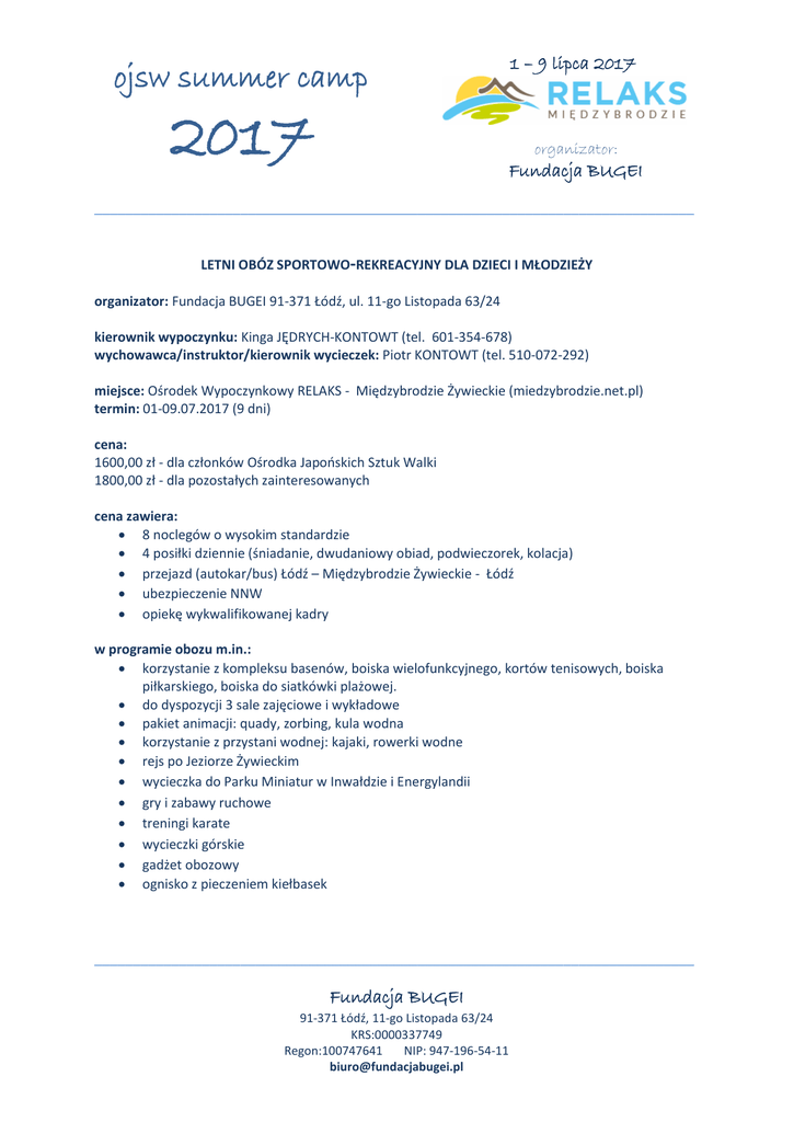 ojsw summer camp 2017 1 – 9 lipca 2017 organizator: Fundacja BUGEI ______________________________________________________________________________ LETNI OBÓZ SPORTOWO-REKREACYJNY DLA DZIECI I MŁODZIEŻY organizator: Fundacja BUGEI 91-371 Łódź, ul. 11-go Listopada 63/24 kierownik wypoczynku: Kinga JĘDRYCH-KONTOWT (tel. 601-354-678) wychowawca/instruktor/kierownik wycieczek: Piotr KONTOWT (tel. 510-072-292) miejsce: Ośrodek Wypoczynkowy RELAKS - Międzybrodzie Żywieckie (miedzybrodzie.net.pl) termin: 01-09.07.2017 (9 dni) cena: 1600,00 zł - dla członków Ośrodka Japońskich Sztuk Walki 1800,00 zł - dla pozostałych zainteresowanych cena zawiera: 8 noclegów o wysokim standardzie 4 posiłki dziennie (śniadanie, dwudaniowy obiad, podwieczorek, kolacja) przejazd (autokar/bus) Łódź – Międzybrodzie Żywieckie - Łódź ubezpieczenie NNW opiekę wykwalifikowanej kadry w programie obozu m.in.: korzystanie z kompleksu basenów, boiska wielofunkcyjnego, kortów tenisowych, boiska piłkarskiego, boiska do siatkówki plażowej. do dyspozycji 3 sale zajęciowe i wykładowe pakiet animacji: quady, zorbing, kula wodna korzystanie z przystani wodnej: kajaki, rowerki wodne rejs po Jeziorze Żywieckim wycieczka do Parku Miniatur w Inwałdzie i Energylandii gry i zabawy ruchowe treningi karate wycieczki górskie gadżet obozowy ognisko z pieczeniem kiełbasek ______________________________________________________________________________ Fundacja BUGEI 91-371 Łódź, 11-go Listopada 63/24 KRS:0000337749 Regon:100747641 NIP: 947-196-54-11 [email protected] ojsw summer camp 2017 1 – 9 lipca 2017 organizator: Fundacja BUGEI ______________________________________________________________________________ REGULAMIN OBOZU LETNIEGO 1. Obóz ma charakter sportowo-rekreacyjny. 2. Uczestników obowiązuje przestrzeganie ramowego porządku dnia i stawianie się na zbiórki punktualnie. 3. Uczestnictwo w zajęciach oraz posiłkach jest dla wszystkich obowiązkowe. 4. Uczestnika obowiązuje zakaz samodzielnego oddalania się od grupy podczas zajęć i w czasie wolnym. 5. Wszyscy uczestnicy obozu muszą zapoznać się z zasadami bezpieczeństwa podczas zajęć, poruszania się po obiekcie, korzystania z infrastruktury sportowo-rekreacyjnej oraz bezwzględnie je przestrzegać, aby uniknąć wypadku. 6. W czasie zajęć, ze względu na bezpieczeństwo, uczestnicy zobowiązani są ściśle stosować się do poleceń instruktorów oraz prawidłowo je wykonywać. 7. Każdy z uczestników obozu zobowiązany jest do poszanowania mienia obozowego, jak również mienia miejsc, w których odbywają się zajęcia. Za każde uszkodzenie mienia odpowiada finansowo rodzic lub opiekun. 8. Spożywanie alkoholu, palenie tytoniu oraz zażywanie środków odurzających jest surowo zabronione. 9. Leki zażywane są wyłącznie za wiedzą i zgodą kadry. 10. Uczestnicy zobowiązani są przestrzegać zasad higieny osobistej i dbać o porządek w miejscu zamieszkania oraz na terenie całego ośrodka. 11. Obowiązuje bezwzględny zakaz stosowania przemocy fizycznej i psychicznej. 12. Uczestnicy obozu zobowiązani są do przestrzegania godziny ciszy nocnej - po tej godzinie zabronione jest przebywanie poza swoim pokojem bez zgody instruktora. 13. Ze względów bezpieczeństwa uczestnik obozu oddaje do depozytu posiadany telefon komórkowy oraz środki finansowe, które może wykorzystać w porozumieniu z instruktorem zgodnie z wcześniej ustalonymi zasadami obozowymi. 14. Za przywiezione telefony komórkowe oraz środki finansowe nie zdeponowane u instruktora, organizator nie ponosi odpowiedzialności. 15. W razie nieprzestrzegania regulaminu przez uczestnika może on być usunięty z obozu. W takim przypadku rodzic lub opiekun prawny jest zobowiązany w ciągu 48 godzin do zabrania uczestnika z obozu na koszt własny. ______________________________________________________________________________ Fundacja BUGEI 91-371 Łódź, 11-go Listopada 63/24 KRS:0000337749 Regon:100747641 NIP: 947-196-54-11 [email protected] ojsw summer camp 2017 1 – 9 lipca 2017 organizator: Fundacja BUGEI ______________________________________________________________________________ ZGŁOSZENIA, PŁATNOŚCI, FORMALNOŚCI 1. Zgłoszenia na wyjazd można dokonać wysyłając e-mail na adres [email protected] - nie później niż do dnia 05.03.2017. Podstawą rezerwacji miejsca jest dokonanie wpłaty zaliczki w wysokości 600,00 zł, najpóźniej w ciągu 14 dni od wysłania zgłoszenia. Wpłaty należy dokonać przelewem na poniższe konto Fundacji BUGEI. 94 1090 2590 0000 0001 3161 0427 Brak wpłaty zaliczki w terminie oznacza rezygnację z udziału w obozie. 2. Całkowita opłata za obóz powinna wpłynąć do dnia 9 czerwca 2017 (wpłata przelewem na konto Fundacji BUGEI). 3. Kartę obozową należy dostarczyć wraz z ostatnią wpłatą. 4. Dopuszcza się dokonanie wpłaty w ratach ustalonych z organizatorem. 5. Nie wpłacenie całości sumy w terminie określonym w pkt. 2 traktowane jest jako rezygnacja z imprezy. 6. Przy rezygnacji powyżej 60 dni przed rozpoczęciem obozu zadatek jest bezzwrotny. 7. Przy rezygnacji poniżej 60 dni przed rozpoczęciem obozu organizator pobiera zadatek + koszty stałe tj. transport, rezerwacja miejsc, ubezpieczenie, płace kadry; z ww. opłat mogą być zwolnione osoby, które na swoje miejsce zaproponują inną osobę chętną do udziału w obozie. 8. Rezygnacji należy dokonać w formie pisemnej. 9. W przypadku rezygnacji z obozu nie wynikającej z winy organizatora a przypadającej na czas jego trwania żadne koszty nie podlegają zwrotowi. 10. Fundacja BUGEI może odwołać obóz w przypadku braku odpowiedniej liczby uczestników, przy czym zwracamy pełną, wpłaconą przez zamawiającego kwotę. 11. Organizator nie odpowiada za niedociągnięcia imprezy wynikłe z przyczyn od niego niezależnych ( np. warunki atmosferyczne). 12. Uczestnicy objęci są ubezpieczeniem NNW. ____________________________________