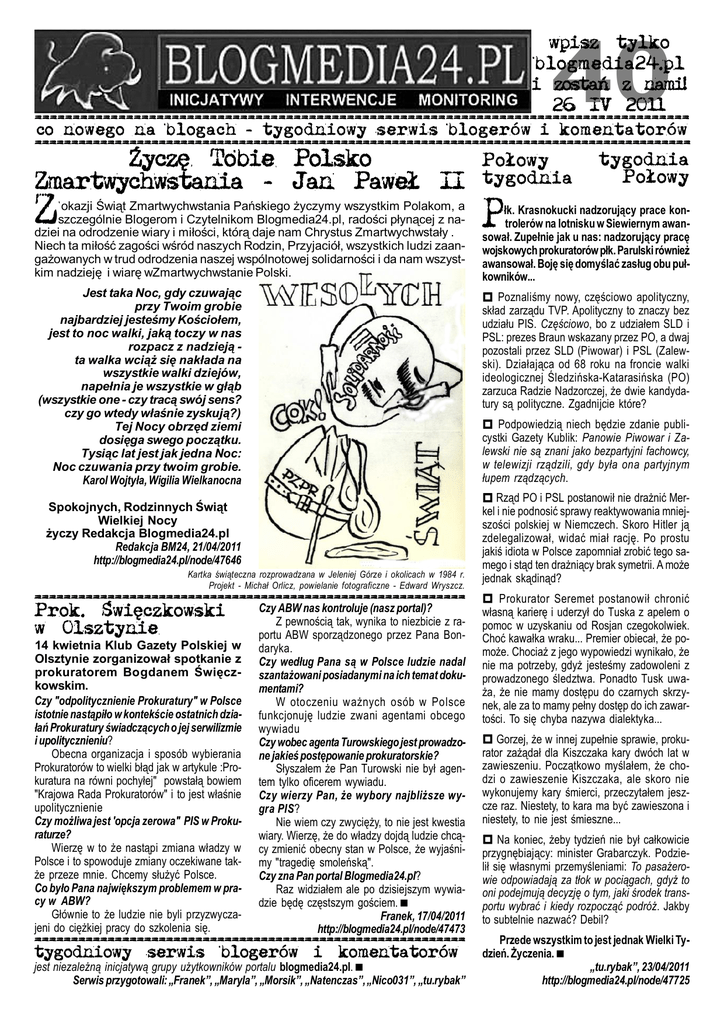 wpisz tylko blogmedia24.pl i zostañ z nami! 26 IV 2011 ====================================================================================== 40 co nowego na blogach - tygodniowy serwis blogerów i komentatorów ========================================================================================== tygodnia ¯yczê Tobie Polsko Po³owy Po³owy Zmartwychwstania - Jan Pawe³ II tygodnia Z okazji Świąt Zmartwychwstania Pańskiego życzymy wszystkim Polakom, a szczególnie Blogerom i Czytelnikom Blogmedia24.pl, radości płynącej z nadziei na odrodzenie wiary i miłości, którą daje nam Chrystus Zmartwychwstały . Niech ta miłość zagości wśród naszych Rodzin, Przyjaciół, wszystkich ludzi zaangażowanych w trud odrodzenia naszej wspólnotowej solidarności i da nam wszystkim nadzieję i wiarę wZmartwychwstanie Polski. P Jest taka Noc, gdy czuwając przy Twoim grobie najbardziej jesteśmy Kościołem, jest to noc walki, jaką toczy w nas rozpacz z nadzieją ta walka wciąż się nakłada na wszystkie walki dziejów, napełnia je wszystkie w głąb (wszystkie one - czy tracą swój sens? czy go wtedy właśnie zyskują?) Tej Nocy obrzęd ziemi dosięga swego początku. Tysiąc lat jest jak jedna Noc: Noc czuwania przy twoim grobie. Karol Wojtyła, Wigilia Wielkanocna Poznaliśmy nowy, częściowo apolityczny, skład zarządu TVP. Apolityczny to znaczy bez udziału PIS. Częściowo, bo z udziałem SLD i PSL: prezes Braun wskazany przez PO, a dwaj pozostali przez SLD (Piwowar) i PSL (Zalewski). Działająca od 68 roku na froncie walki ideologicznej Śledzińska-Katarasińska (PO) zarzuca Radzie Nadzorczej, że dwie kandydatury są polityczne. Zgadnijcie które? Podpowiedzią niech będzie zdanie publicystki Gazety Kublik: Panowie Piwowar i Zalewski nie są znani jako bezpartyjni fachowcy, w telewizji rządzili, gdy była ona partyjnym łupem rządzących. Spokojnych, Rodzinnych Świąt Wielkiej Nocy życzy Redakcja Blogmedia24.pl Redakcja BM24, 21/04/2011 http://blogmedia24.pl/node/47646 Kartka świąteczna rozprowadzana w Jeleniej Górze i okolicach w 1984 r. Projekt - Michał Orlicz, powielanie fotograficzne - Edward Wryszcz. =========================================================== Czy ABW nas kontroluje (nasz portal)? Prok. Œwiêczkowski Z pewnością tak, wynika to niezbicie z raw Olsztynie portu ABW sporządzonego przez Pana Bon14 kwietnia Klub Gazety Polskiej w Olsztynie zorganizował spotkanie z prokuratorem Bogdanem Święczkowskim. Czy "odpolitycznienie Prokuratury" w Polsce istotnie nastąpiło w kontekście ostatnich działań Prokuratury świadczących o jej serwilizmie i upolitycznieniu? Obecna organizacja i sposób wybierania Prokuratorów to wielki błąd jak w artykule :Prokuratura na równi pochyłej" powstałą bowiem "Krajowa Rada Prokuratorów" i to jest właśnie upolitycznienie Czy możliwa jest 'opcja zerowa" PIS w Prokuraturze? Wierzę w to że nastąpi zmiana władzy w Polsce i to spowoduje zmiany oczekiwane także przeze mnie. Chcemy służyć Polsce. Co było Pana największym problemem w pracy w ABW? Głównie to że ludzie nie byli przyzwyczajeni do ciężkiej pracy do szkolenia się. daryka. Czy według Pana są w Polsce ludzie nadal szantażowani posiadanymi na ich temat dokumentami? W otoczeniu ważnych osób w Polsce funkcjonuję ludzie zwani agentami obcego wywiadu Czy wobec agenta Turowskiego jest prowadzone jakieś postępowanie prokuratorskie? Słyszałem że Pan Turowski nie był agentem tylko oficerem wywiadu. Czy wierzy Pan, że wybory najbliższe wygra PIS? Nie wiem czy zwycięży, to nie jest kwestia wiary. Wierzę, że do władzy dojdą ludzie chcący zmienić obecny stan w Polsce, że wyjaśnimy "tragedię smoleńską". Czy zna Pan portal Blogmedia24.pl? Raz widziałem ale po dzisiejszym wywiadzie będę częstszym gościem. Franek, 17/04/2011 http://blogmedia24.pl/node/47473 =========================================================== tygodniowy serwis łk. Krasnokucki nadzorujący prace kontrolerów na lotnisku w Siewiernym awansował. Zupełnie jak u nas: nadzorujący pracę wojskowych prokuratorów płk. Parulski również awansował. Boję się domyślać zasług obu pułkowników... blogerów i komentatorów jest niezależną inicjatywą grupy użytkowników portalu blogmedia24.pl. Serwis przygotowali: „Franek”, „Maryla”, „Morsik”, „Natenczas”, „Nico031”, „tu.rybak” Rząd PO i PSL postanowił nie drażnić Merkel i nie podnosić sprawy reaktywowania mniejszości polskiej w Niemczech. Skoro Hitler ją zdelegalizował, widać miał rację. Po prostu jakiś idiota w Polsce zapomniał zrobić tego samego i stąd ten drażniący brak symetrii. A może jednak skądinąd? Prokurator Seremet postanowił chronić własną karierę i uderzył do Tuska z apelem o pomoc w uzyskaniu od Rosjan czegokolwiek. Choć kawałka wraku... Premier obiecał, że pomoże. Chociaż z jego wypowiedzi wynikało, że nie ma potrzeby, gdyż jesteśmy zadowoleni z prowadzonego śledztwa. Ponadto Tusk uważa, że nie mamy dostępu do czarnych skrzynek, ale za to mamy pełny dostęp do ich zawartości. To się chyba nazywa dialektyka... Gorzej, że w innej zupełnie sprawie, prokurator zażądał dla Kiszczaka kary dwóch lat w zawieszeniu. Początkowo myślałem, że chodzi o zawieszenie Kiszczaka, ale skoro nie wykonujemy kary śmierci, przeczytałem jeszcze raz. Niestety, to kara ma być zawieszona i niestety, to nie jest śmieszne... Na koniec, żeby tydzień nie był całkowicie przygnębiający: minister Grabarczyk. Podzielił się własnymi przemyśleniami: To pasażerowie odpowiadają za tłok w pociągach, gdyż to oni podejmują decyzję o tym, jaki środek transportu wybrać i kiedy rozpocząć podróż. Jakby to subtelnie nazwać? Debil? Przede wszystkim to jest jednak Wielki Tydzień. Życzenia. „tu.rybak”, 23/04/2011 http://blogmedia24.pl/node/47725 To ponad moje si³y, czyli afera z tablicami Ceny żywności wzrosły
